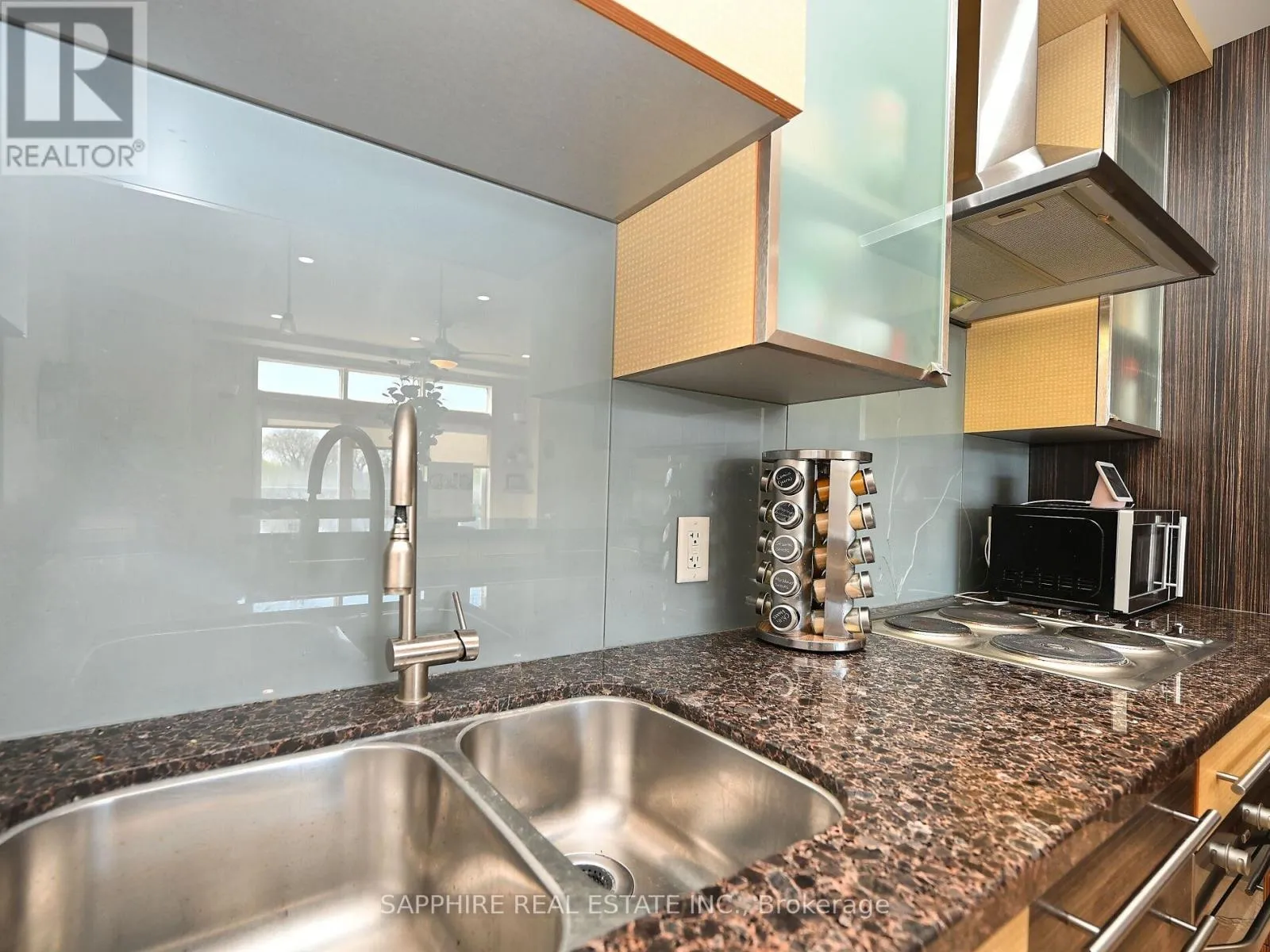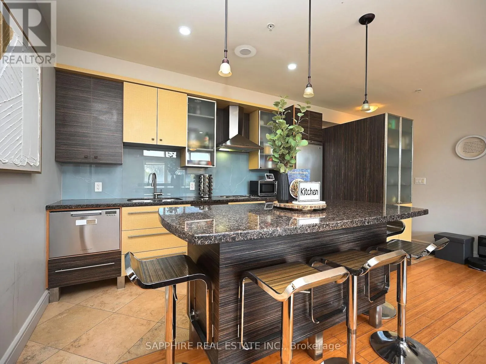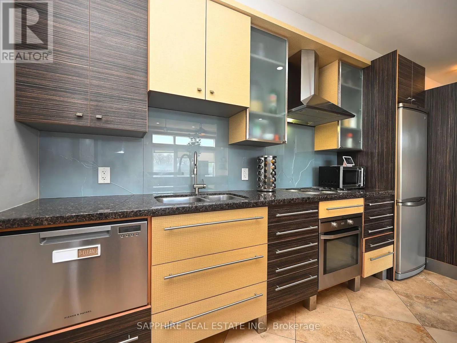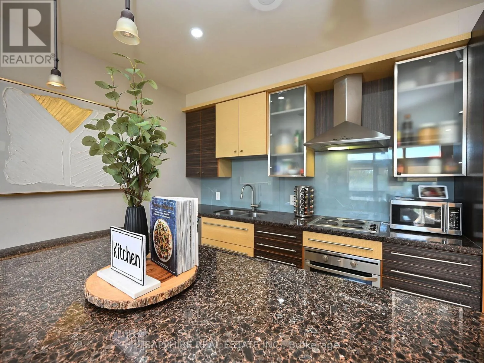 Speers Rd. And Kerr St. Welcome to Kerr Studios, a boutique-style condo community nestled in the heart of vibrant Kerr Village. This meticulously maintained 2-bedroom, 2-bathroom suite offers 900 sq.ft. of bright, open-concept living with ideal bedroom separation each with its own full bathroom perfect for shared living or guests. Overlooking the tranquil, east-facing rear of the building, the unit features high-end bamboo hardwood floors with cork underpadding, granite counters, and a thoughtfully upgraded kitchen boasting 23 drawers, glass cabinetry, a centre island, a European-style brushed steel fridge, built-in cooktop and oven, and a drawer-style dishwasher. The spacious primary bedroom includes an ensuite bath and Juliette balcony. Enjoy smart pot lights, travertine flooring, modern bathrooms with granite walls and glass sinks, custom roller blinds, and large windows throughout. Includes S/S appliances, washer/dryer, window coverings, and one parking spot. Walk to cafes, shops, Oakwood Public School, Tannery Park, Trafalgar Park Community Centre, and the lake. Oakville GO and QEW are minutes away making this a commuters dream. Move-in ready, unpack and enjoy the best of Kerr Village living. (id:27476)
