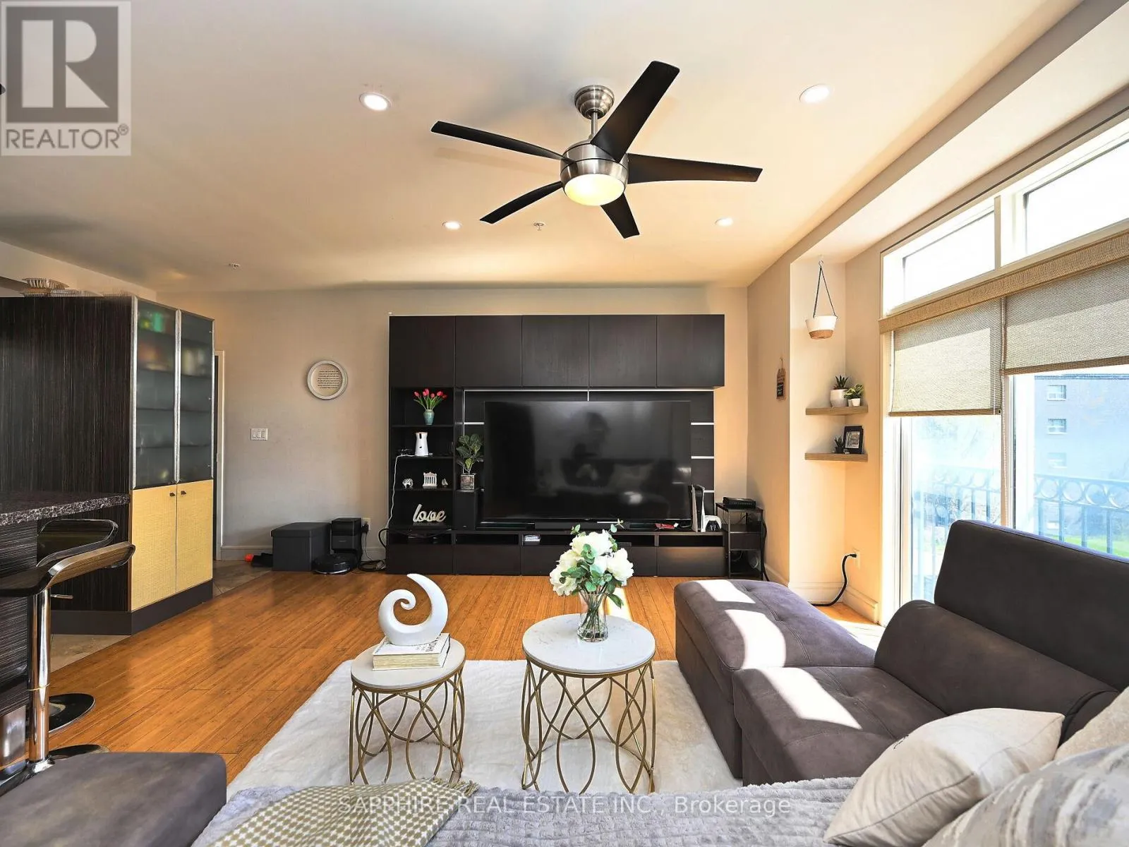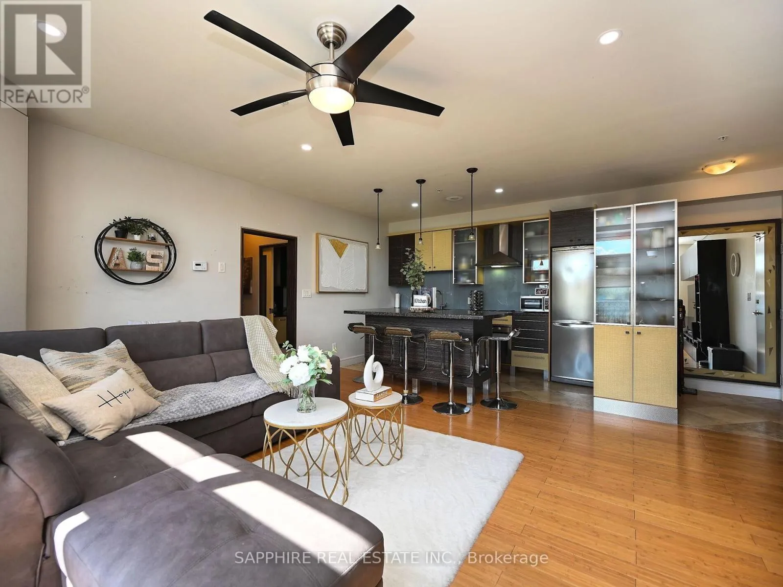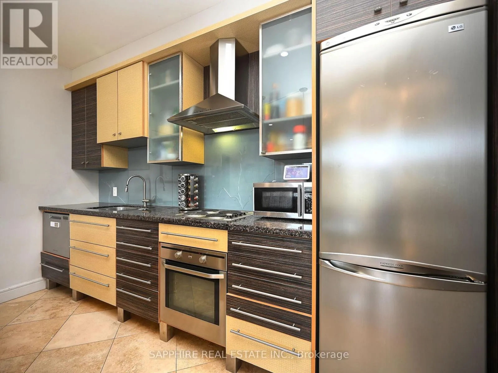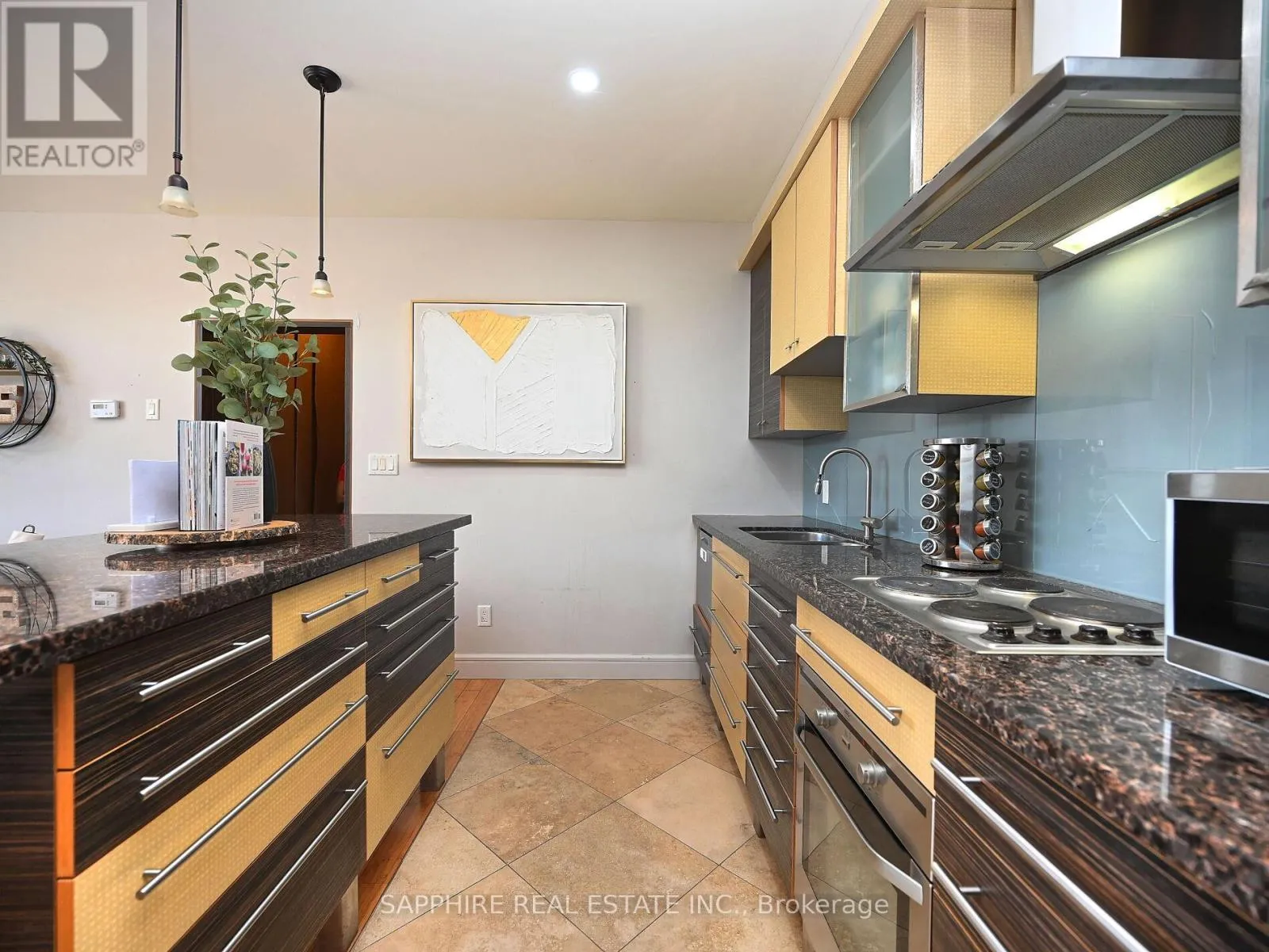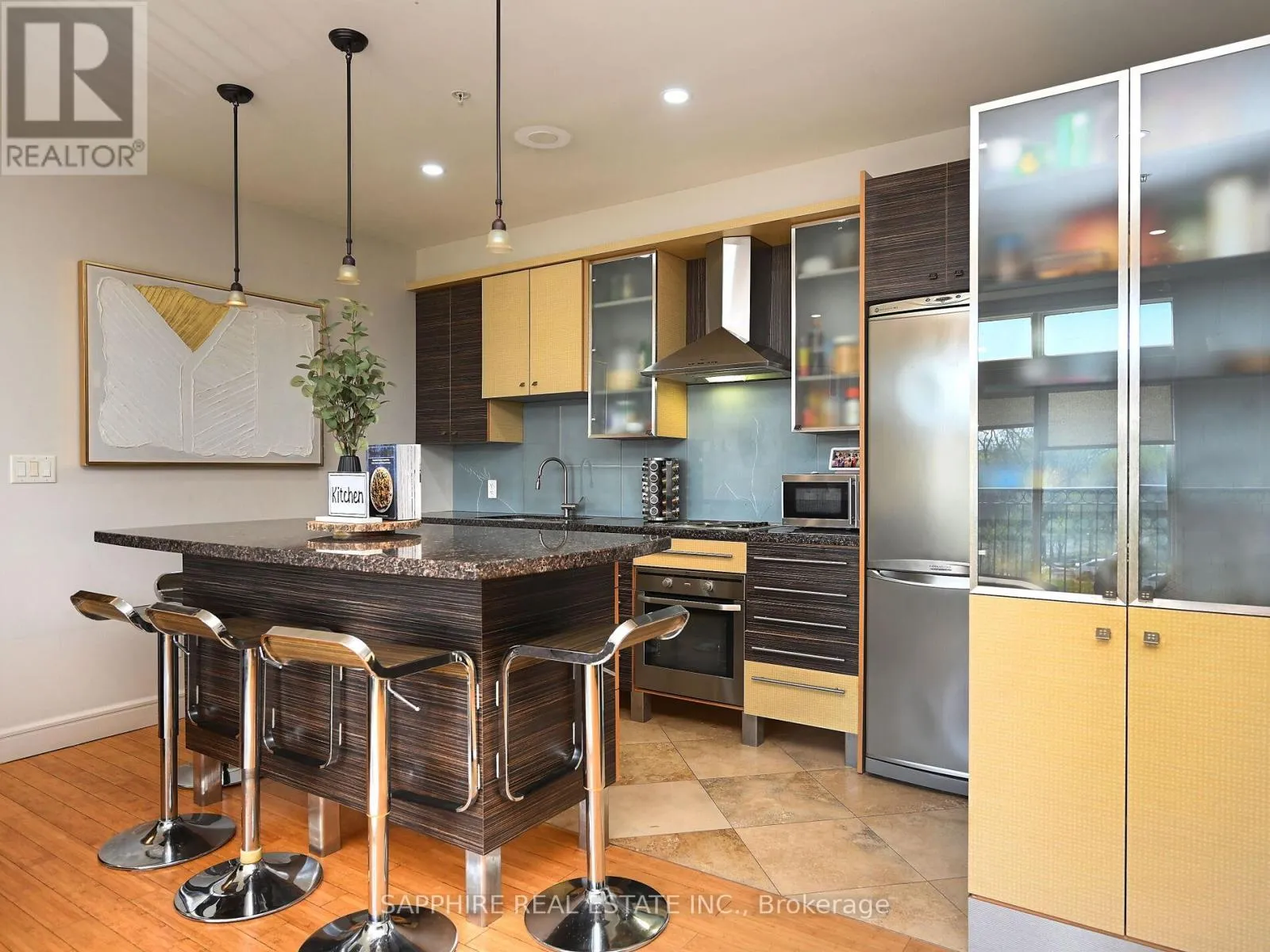 Speers Rd. And Kerr St. Welcome to Kerr Studios, a boutique-style condo community nestled in the heart of vibrant Kerr Village. This meticulously maintained 2-bedroom, 2-bathroom suite offers 900 sq.ft. of bright, open-concept living with ideal bedroom separation each with its own full bathroom perfect for shared living or guests. Overlooking the tranquil, east-facing rear of the building, the unit features high-end bamboo hardwood floors with cork underpadding, granite counters, and a thoughtfully upgraded kitchen boasting 23 drawers, glass cabinetry, a centre island, a European-style brushed steel fridge, built-in cooktop and oven, and a drawer-style dishwasher. The spacious primary bedroom includes an ensuite bath and Juliette balcony. Enjoy smart pot lights, travertine flooring, modern bathrooms with granite walls and glass sinks, custom roller blinds, and large windows throughout. Includes S/S appliances, washer/dryer, window coverings, and one parking spot. Walk to cafes, shops, Oakwood Public School, Tannery Park, Trafalgar Park Community Centre, and the lake. Oakville GO and QEW are minutes away making this a commuters dream. Move-in ready, unpack and enjoy the best of Kerr Village living. (id:27476)