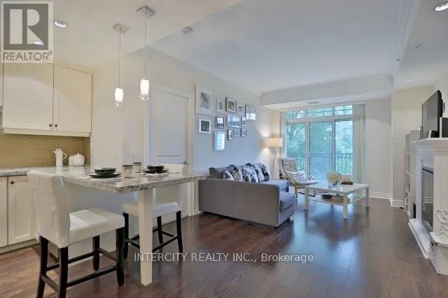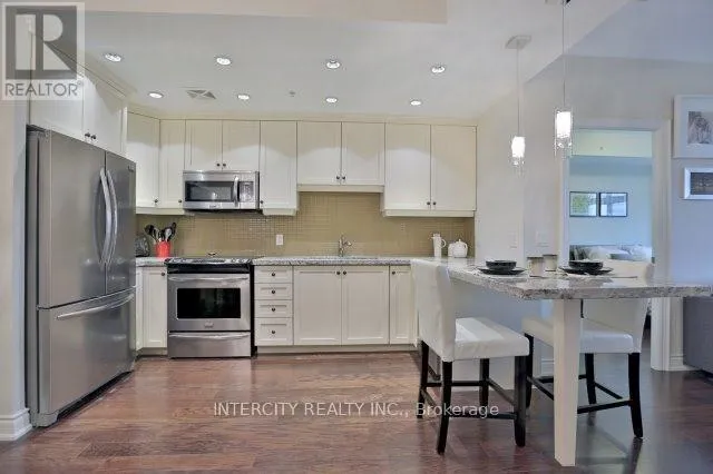 Lakeshore Rd W & Dorval Dr Beautifully finished "Kennick" model, approximately 1,173 sq ft with lots of upgrades. Large primary bedroom with 4 piece ensuite, Spacious 2nd Bedroom/Den with French Doors and closet. Dark wood floors throughout, coffered ceilings, pot lights, Upgraded Kitchen, Granite Countertops, Pendant lights, Peninsula/breakfast counter. All bathrooms have Caesarstone countertops and glass tiles in tub/shower. Walkouts to sunny West facing Balcony from Living Room and Primary Bedroom. Walk to shopping and transit, minutes to QEW and Oakville GO station. Photos were taken before current tenant moved in and common element furnishings have been changed since photos were taken. (id:27476)