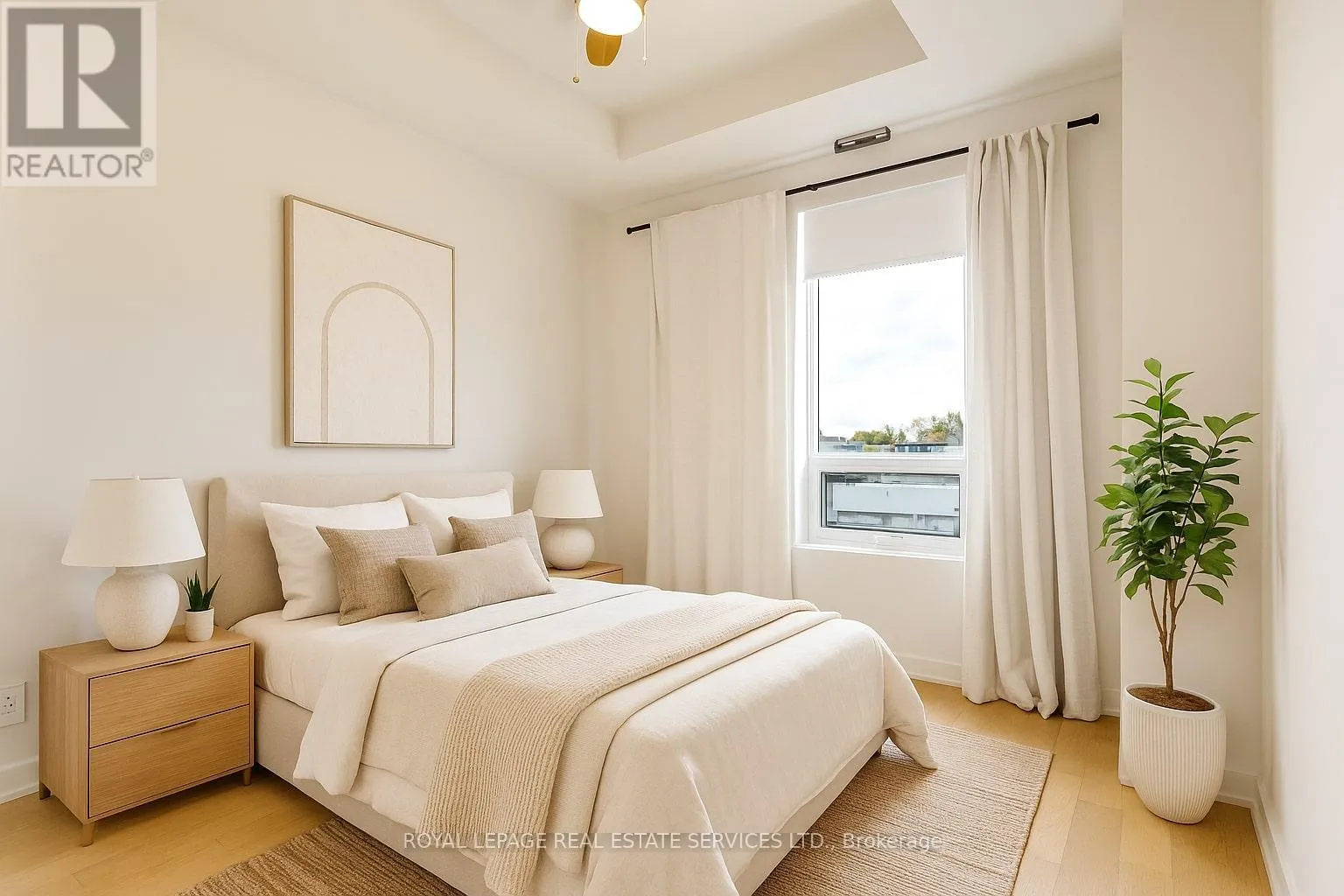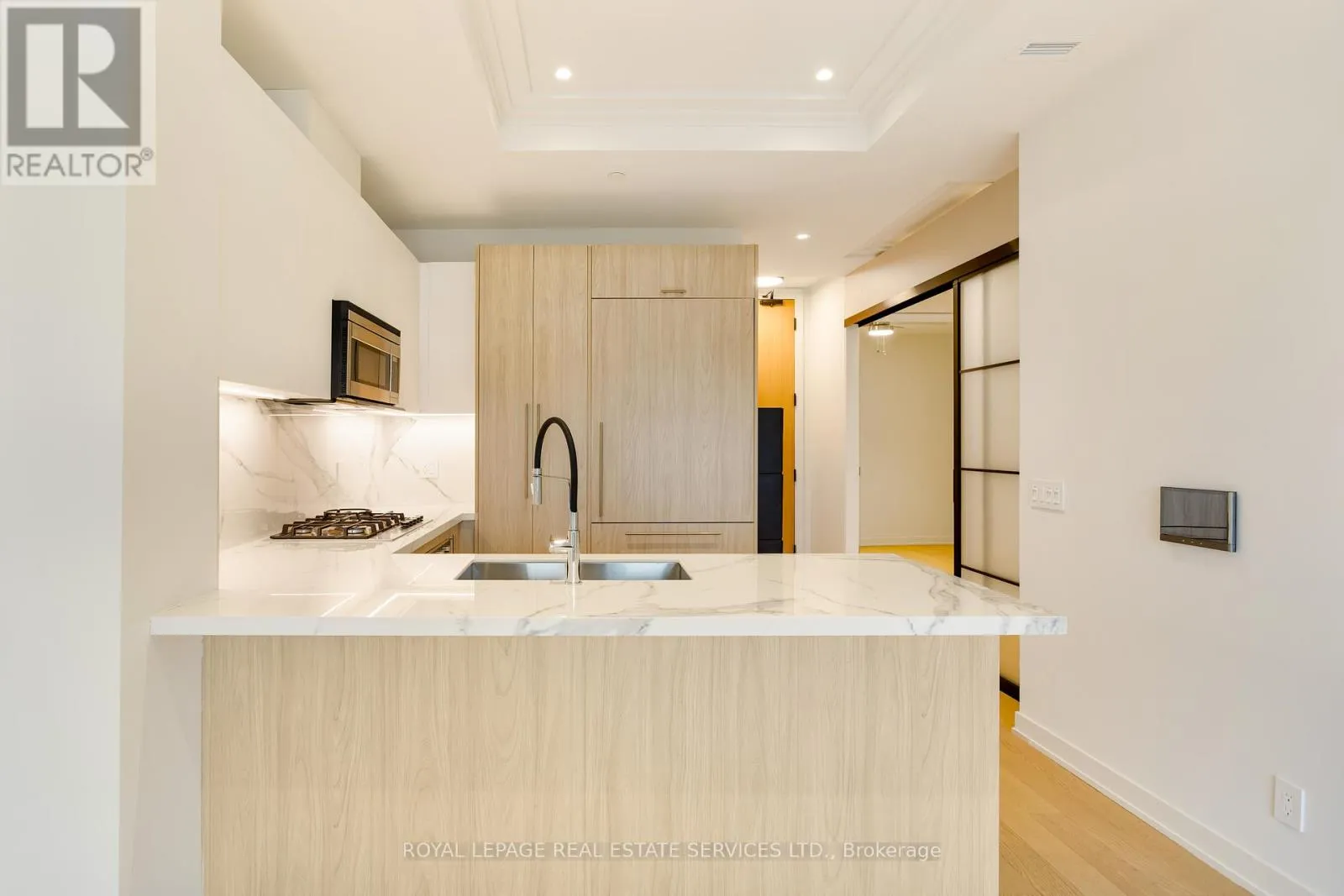 Cross Streets: Dorval-Lakeshore Rd W-Maurice Dr. ** Directions: Lakeshore Rd W & Maurice Dr. The prestigious boutique Berkshire Residences in Central Oakville are ideal for buyers seeking luxury, style, and a walkable lifestyle. Live steps from Fortino's, Trafalgar Park, Kerr Village, shops and restaurants along Lakeshore Road West, Lake Ontario, Oakville Harbour, waterfront parks and historic downtown Oakville with its boutiques, fine dining and cultural events. Only 5 minutes to the QEW/403 and close to the Oakville GO Station - perfect for commuters. This bright, contemporary one-bedroom + den suite offers approx. 737 sq. ft. of refined living plus a private approx. 67 sq. ft. balcony. Highlights include soaring 10-foot ceilings, coffered ceilings in the kitchen, living room, dining room and primary bedroom, 9-foot interior doors, wide-plank engineered hardwood floors and abundant pot lighting. A wall of windows floods the living room with natural light and opens to the balcony - perfect for morning coffee or evening relaxation. The chef-style kitchen features sleek 2-tone cabinetry with under-cabinet lighting, quartz counters and backsplash, premium integrated and stainless steel appliances, and an island with a breakfast bar that transitions easily from casual meals to entertaining. Behind 4-panel frosted glass sliding doors is a versatile dining room or den. A stylish 2-piece bath and a laundry closet are located off the foyer. The serene primary suite offers a spa-inspired 3-piece ensuite with an upgraded oversized shower and frameless glass. Enjoy one underground parking space, and high-speed internet is included in the condo fee. Completed in 2024, this upscale building features a rooftop terrace with lake views, a gym, party room, catering kitchen, lounge, and 24/7 concierge - luxury living in Central Oakville. (id:27476)