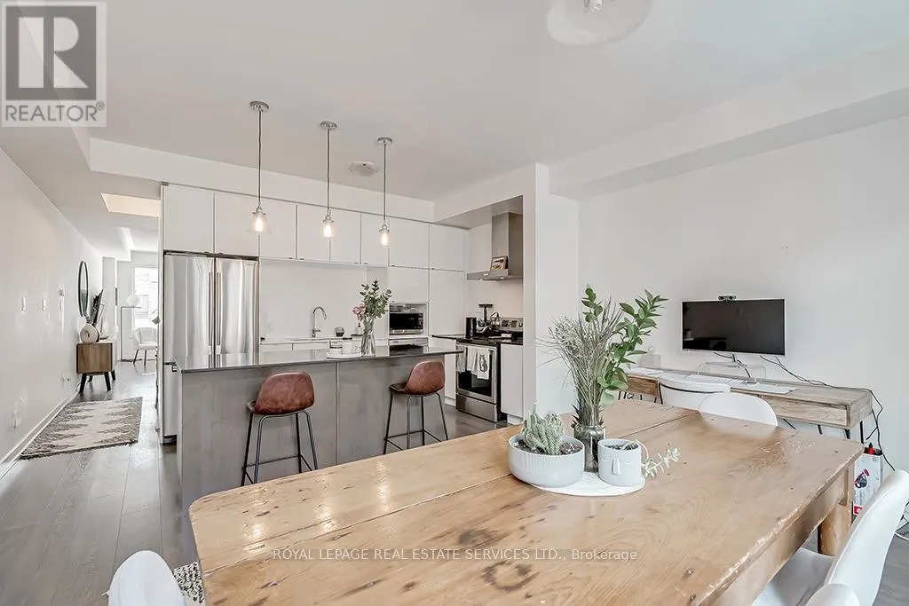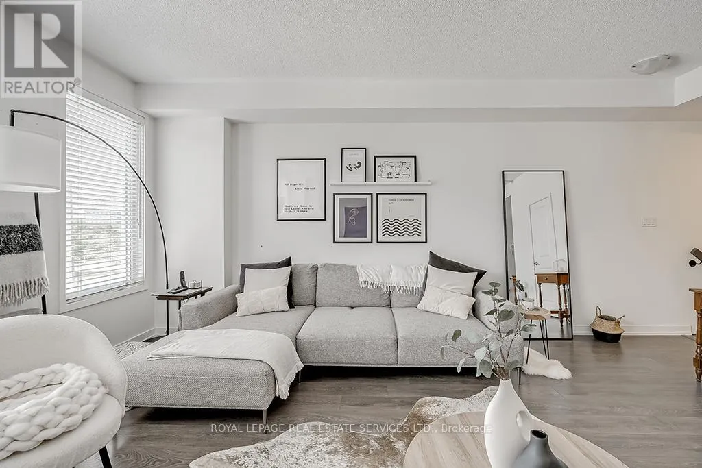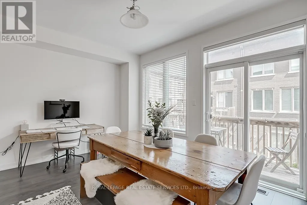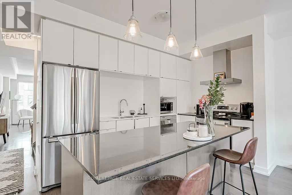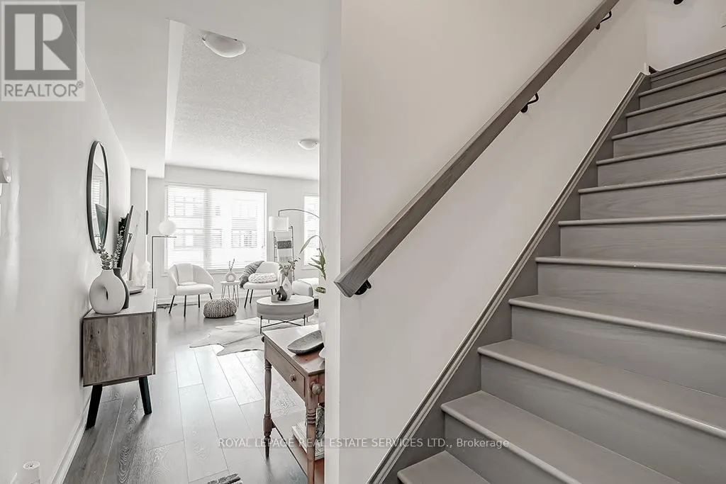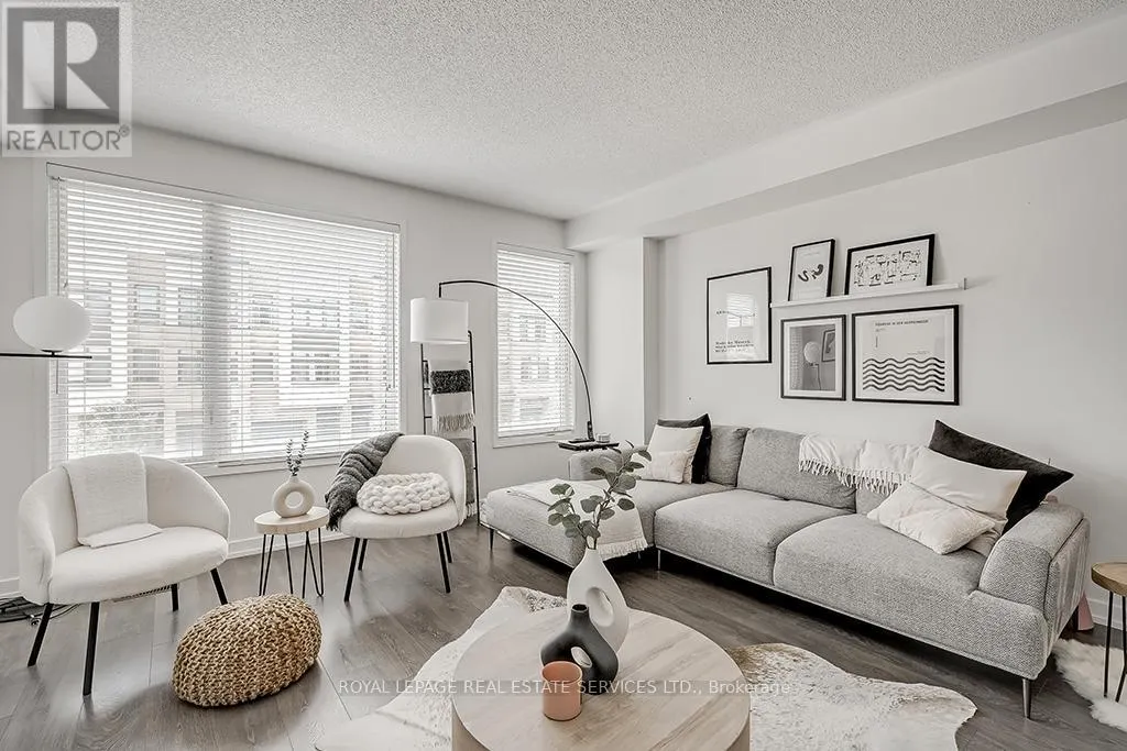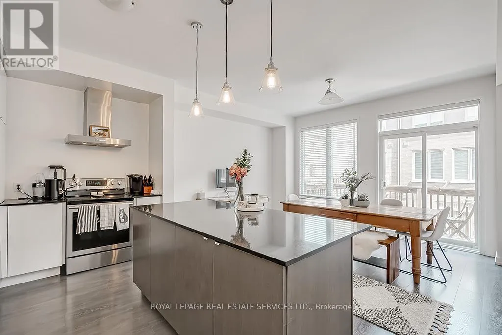 Cross Streets: Dundas- Postville- Huguenot. ** Directions: Postville- Huguenot. Upscale townhome in Trafalgar Landing in the Uptown Core. Chic modern well-planned living space with 3 bedrooms, two 4-piece bathrooms, two 2-piece bathrooms, 9' ceilings throughout, gorgeous staircase with iron pickets, wide-plank laminate flooring, stone-look floor tiles, 3 walkouts, solid surface counters, sleek flat front cabinetry, large windows with wide-slat blinds & an inside entry to the attached garage. Ground floor family room with sliding glass doors. Conveniently located on this level is a 2-piece bathroom. Beautiful living/dining room with 2 large windows with wide-slat blinds & plenty of space for entertaining. You'll love the sleek modern kitchen with 2-colour cabinetry, quartz & solid surface counters, large island with a breakfast bar & pendant lighting overhead & upgraded stainless steel appliances including a downdraft range hood fan. Generous, bright breakfast room with a large window & a walkout to the balcony. Upstairs you'll find the laundry area, 3 bedrooms & two full bathrooms. The primary retreat features a walkout to a private balcony & 4-piece ensuite bathroom with an oversize glass enclosed shower. Walk to Squire Parkette & Postville Pond, a 5-minute walk (2-minute drive) to the Uptown Core for shopping, services & several restaurants, & easy access to highways & GO Train. No pets. No smokers. (id:27476)