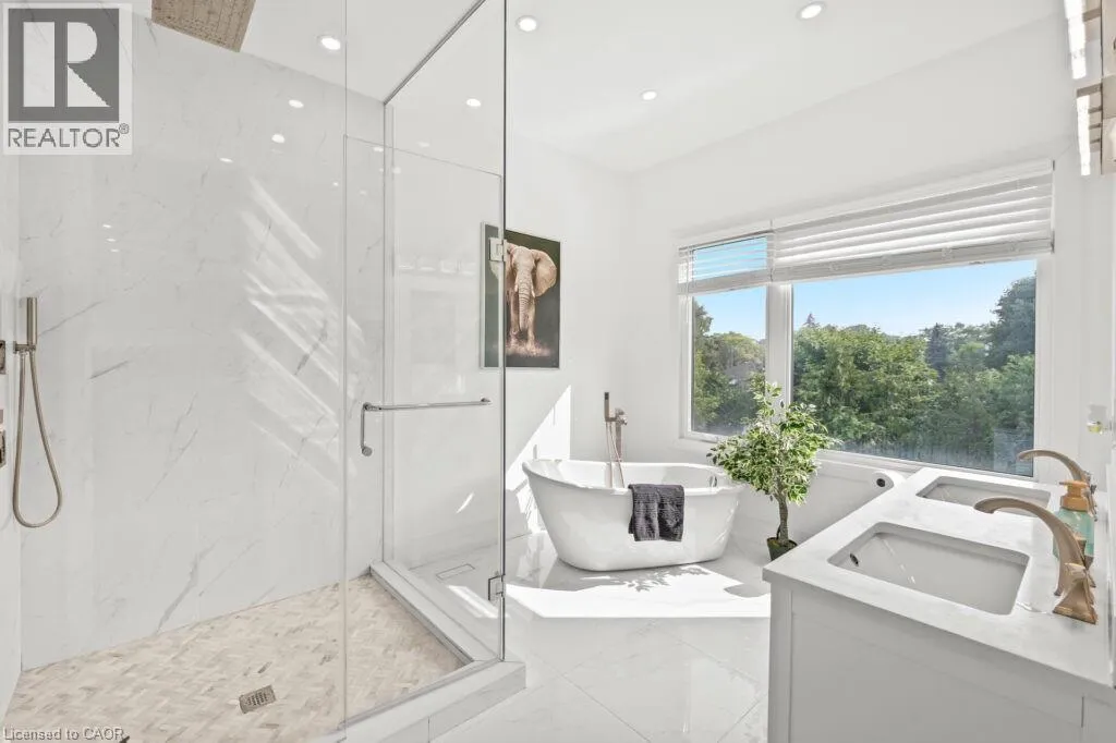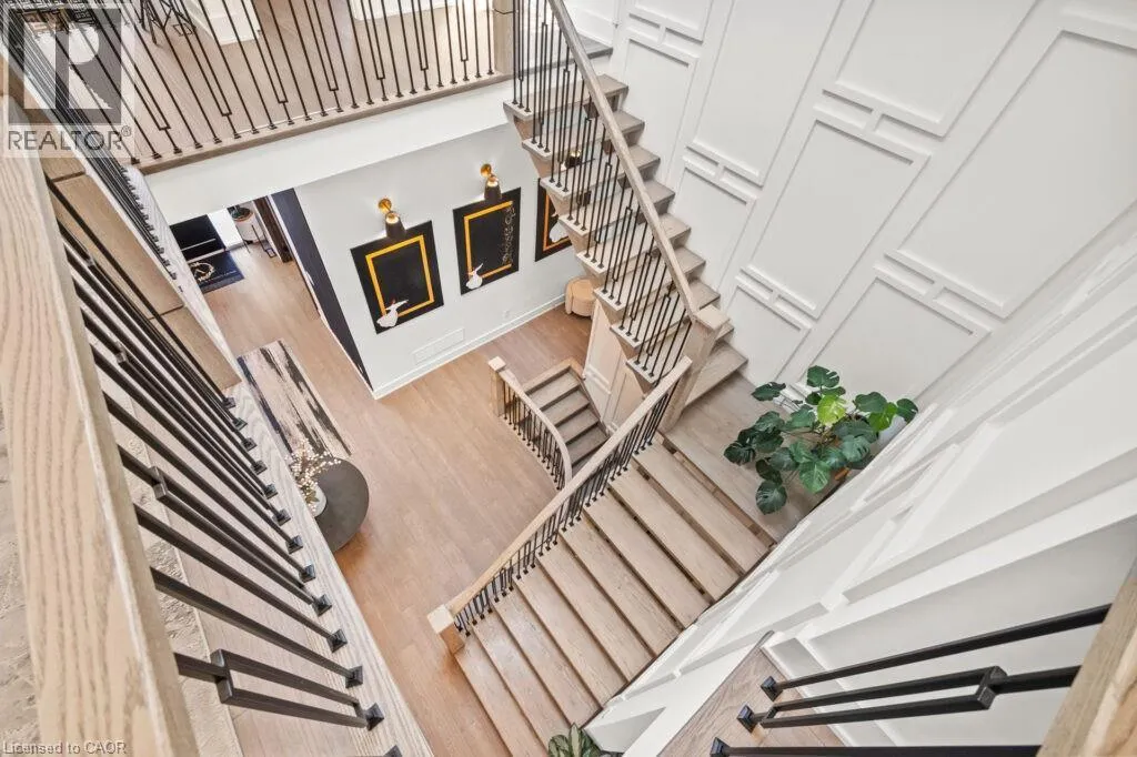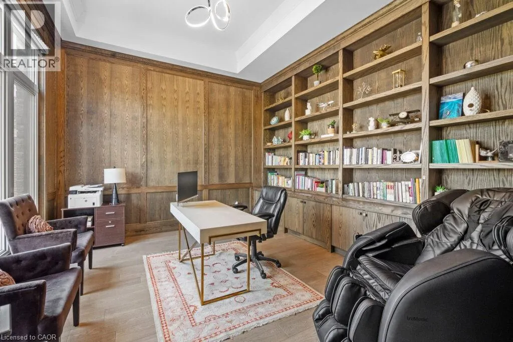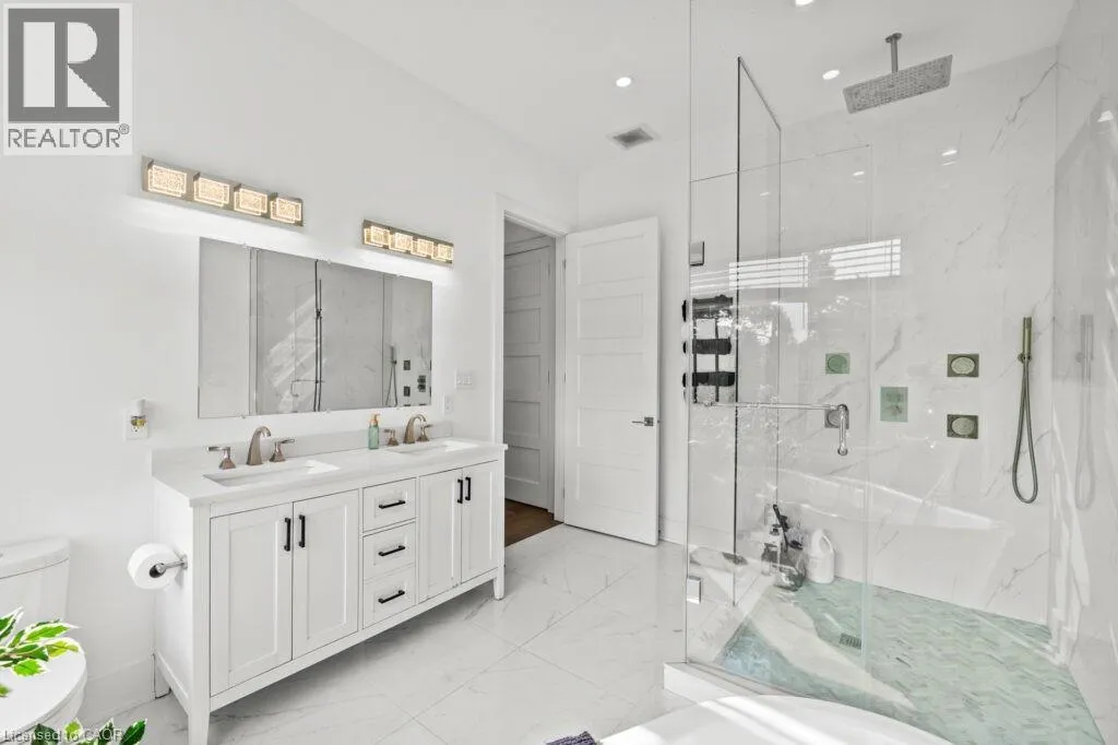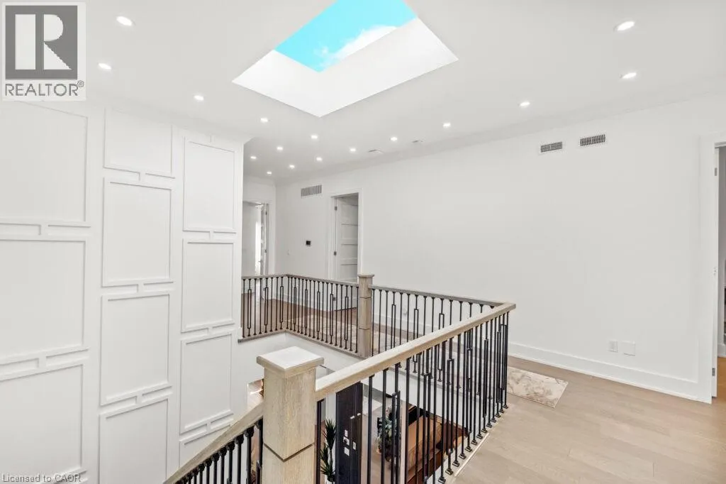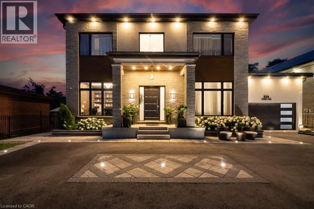 Rebecca and Third Line A showpiece of refined luxury, this home sits on an impressive 77' x 147' lot, where timeless design blends seamlessly with modern sophistication. The grand circular driveway, multiple entry points, and striking stone water feature create an unforgettable arrival experience. Inside, 12-foot ceilings, expansive floor-to-ceiling windows, a custom moss feature wall, and rich hardwood flooring establish a warm yet dramatic atmosphere throughout. At the heart of the home lies a chef-inspired kitchen, thoughtfully designed with sleek quartz countertops, a 10-foot waterfall island, premium built-in stainless steel appliances, central vacuum, kitchen dustpan/sweep inlet and custom full-height cabinetry that elevates both style and function. Upstairs, 10-foot ceilings enhance the sense of space, while the primary suite offers a true private retreat with a custom fireplace, an oversized walk-in closet with tailored organizers, and a spa-like ensuite featuring dual vanities, a deep soaker tub, a glass-enclosed rain shower, and refined finishes. Each additional bedroom includes its own ensuite, ample natural light, and premium details that create individual private sanctuaries. The fully finished lower level provides exceptional versatility, functioning as a self-contained rental suite or a comfortable in-law space with two spacious bedrooms, two full bathrooms, and an open-concept kitchen equipped with upgraded appliances. Outside, the beauty continues with professionally landscaped grounds, fruit trees, a full sprinkler system, a custom deck, and a covered pergolaâperfect for outdoor entertaining and year-round enjoyment. A rare offering that exemplifies superior craftsmanship, thoughtful design, and contemporary luxury living (id:27476)