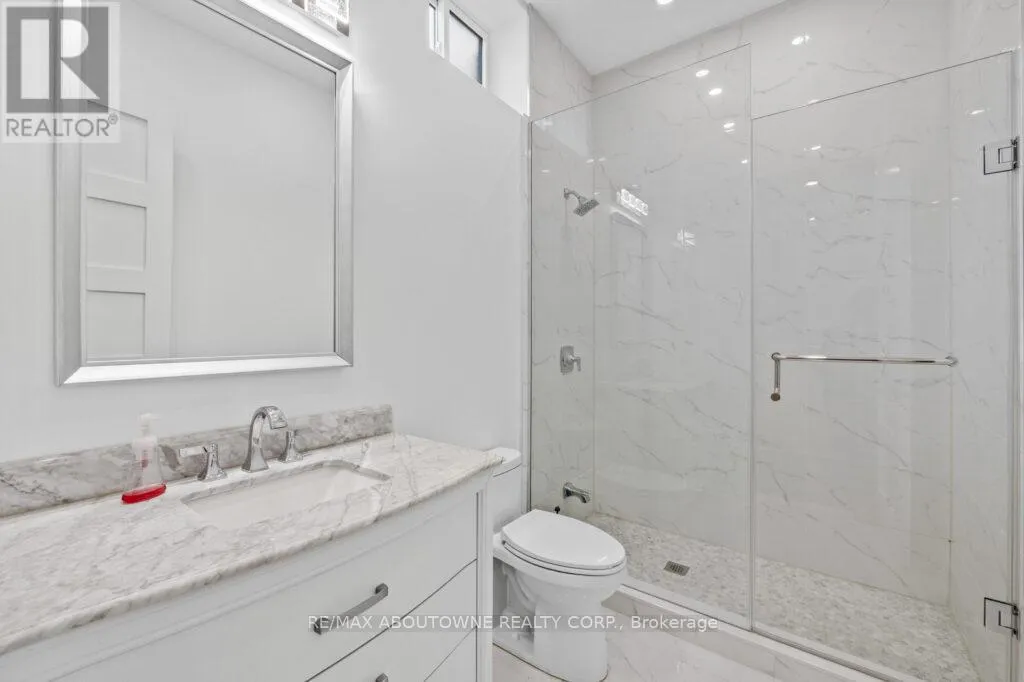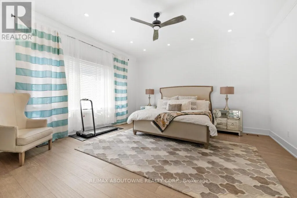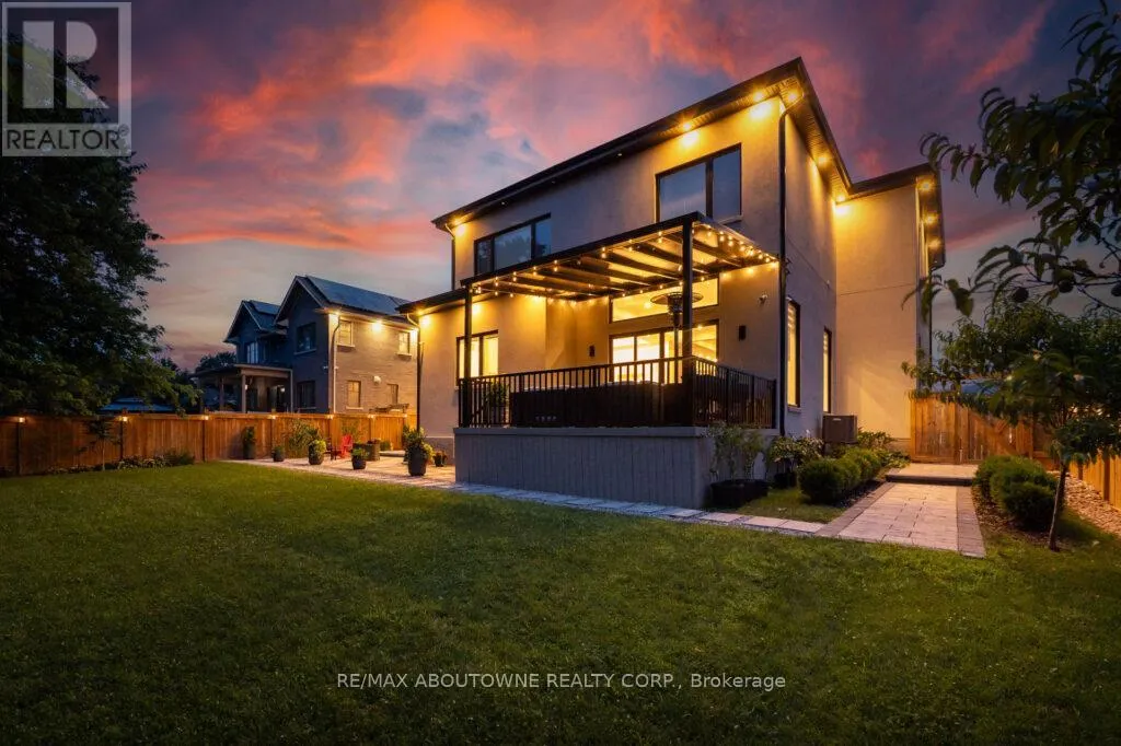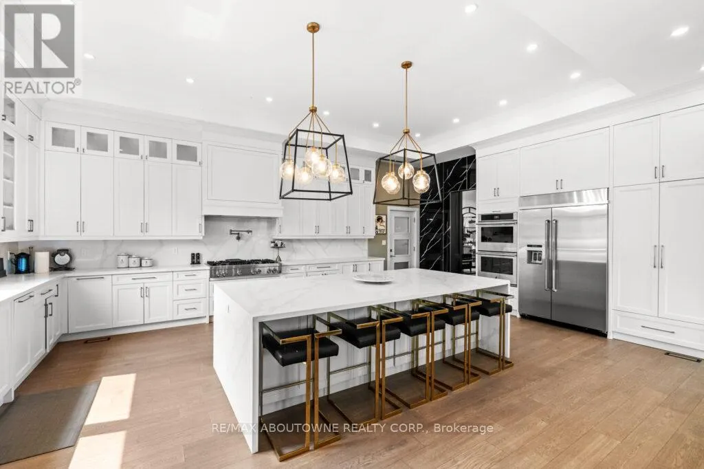 Rebecca and Third Line A showpiece of refined luxury, this home sits on an impressive 77' x 147' lot, where timeless design blends seamlessly with modern sophistication. The grand circular driveway, multiple entry points, and striking stone water feature create an unforgettable arrival experience. Inside, 12-foot ceilings, expansive floor-to-ceiling windows, a custom moss feature wall, and rich hardwood flooring establish a warm yet dramatic atmosphere throughout. At the heart of the home lies a chef-inspired kitchen, thoughtfully designed with sleek quartz countertops, a 10-foot waterfall island, premium built-in stainless steel appliances, central vacuum, kitchen dustpan/sweep inlet and custom full-height cabinetry that elevates both style and function. Upstairs, 10-foot ceilings enhance the sense of space, while the primary suite offers a true private retreat with a custom fireplace, an oversized walk-in closet with tailored organizers, and a spa-like ensuite featuring dual vanities, a deep soaker tub, a glass-enclosed rain shower, and refined finishes. Each additional bedroom includes its own ensuite, ample natural light, and premium details that create individual private sanctuaries. The fully finished lower level provides exceptional versatility, functioning as a self-contained rental suite or a comfortable in-law space with two spacious bedrooms, two full bathrooms, and an open-concept kitchen equipped with upgraded appliances. Outside, the beauty continues with professionally landscaped grounds, fruit trees, a full sprinkler system, a custom deck, and a covered pergola-perfect for outdoor entertaining and year-round enjoyment. A rare offering that exemplifies superior craftsmanship, thoughtful design, and contemporary luxury living. (id:27476)