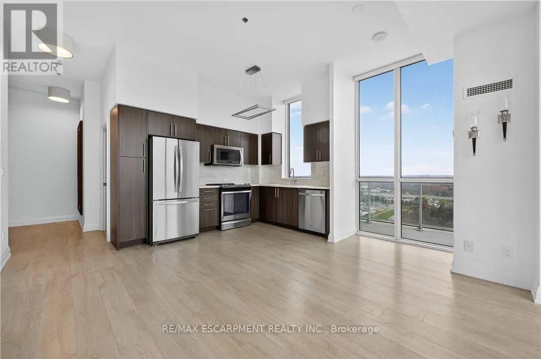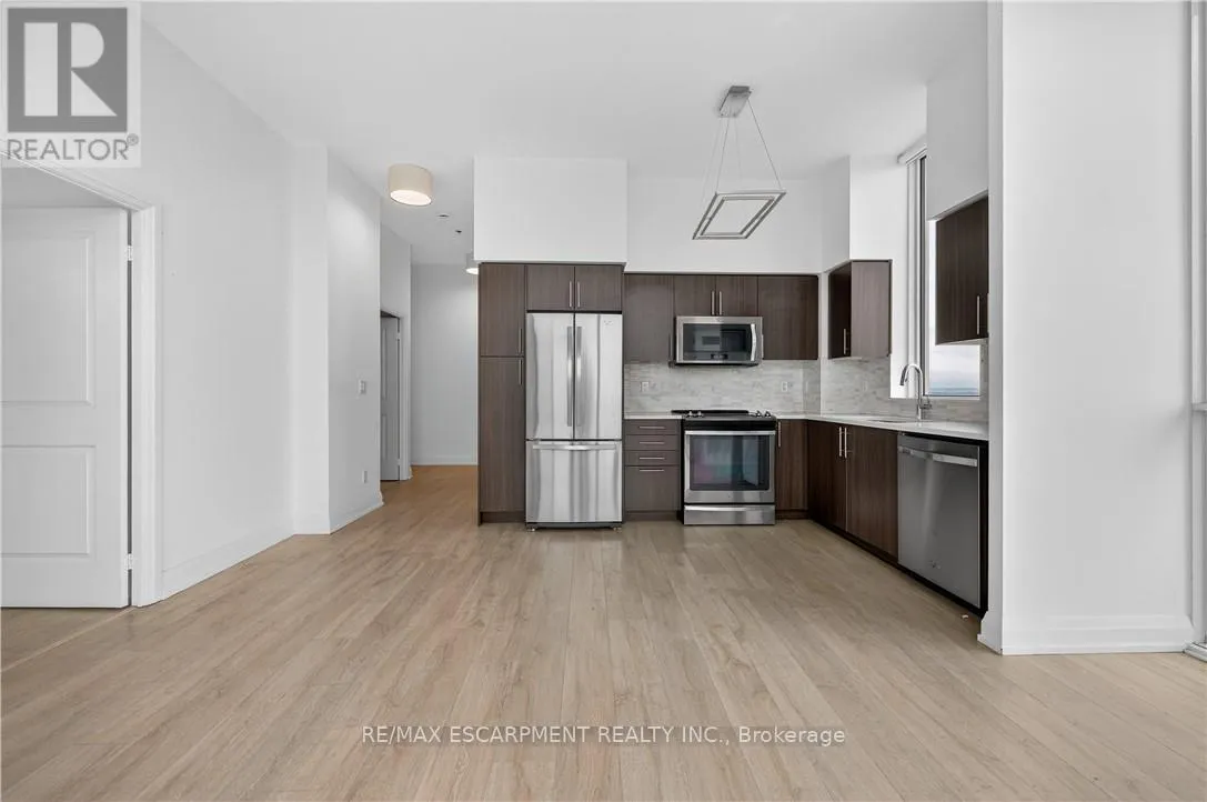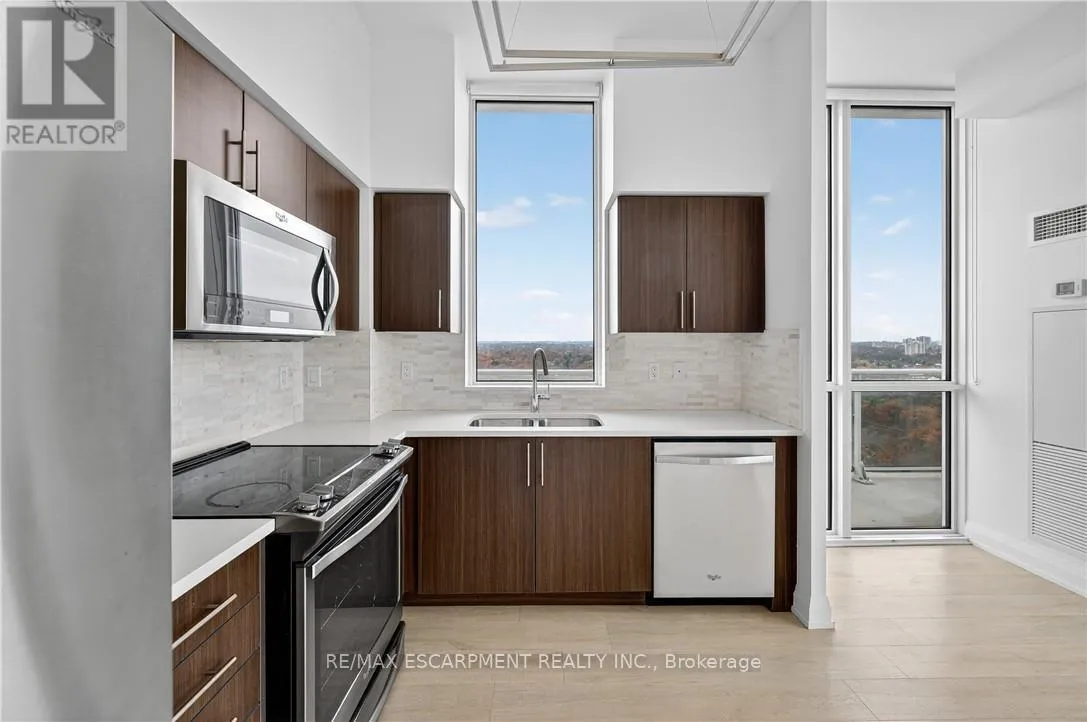 Cross Streets: Kerr Street / Speers Road. ** Directions: QEW to Dorval Drive to Speers Road to Kerr Street. Bright & roomy 2 bedroom, 2 bath corner penthouse suite in sought after RAIN condo building featuring two side by side parking spaces & one locker, over 9 ft. ceilings, floor to ceiling windows, wrap around balcony with gorgeous panoramic views of Sixteen Mile Creek, Lake Ontario & Oakville to Toronto. This carpet free unit offers an open & airy kitchen & living room area, spacious primary bedroom with 3 piece ensuite bath & walk-in closet, good sized second bedroom, 4 piece main bath & convenient in-suite laundry. Living room, primary bedroom & second bedroom all contain sliding doors providing access to the balcony. Great location close to trendy Kerr Village, Downtown Oakville & all amenities. Just a short drive to Oakville GO station. Quick & easy access to QEW. Building amenities include concierge/security, gym, sauna, pool, party room, guest suites & more. Property being sold "as is, where is". (id:27476)
