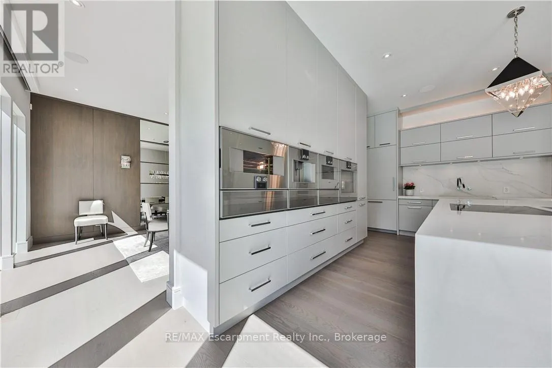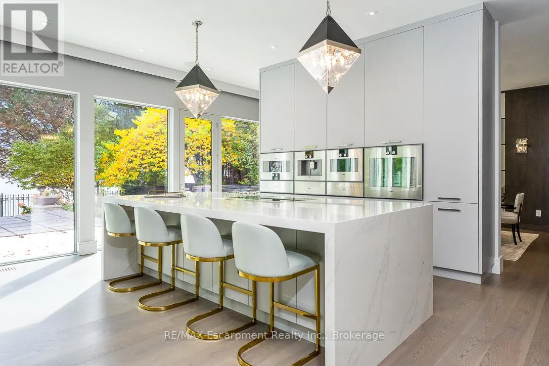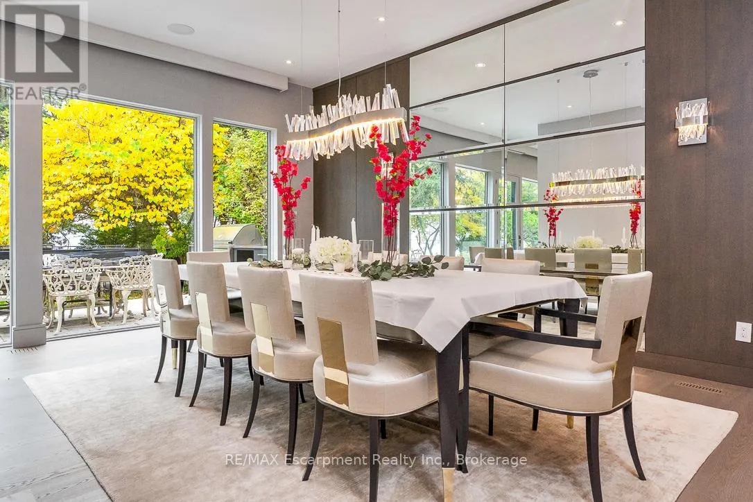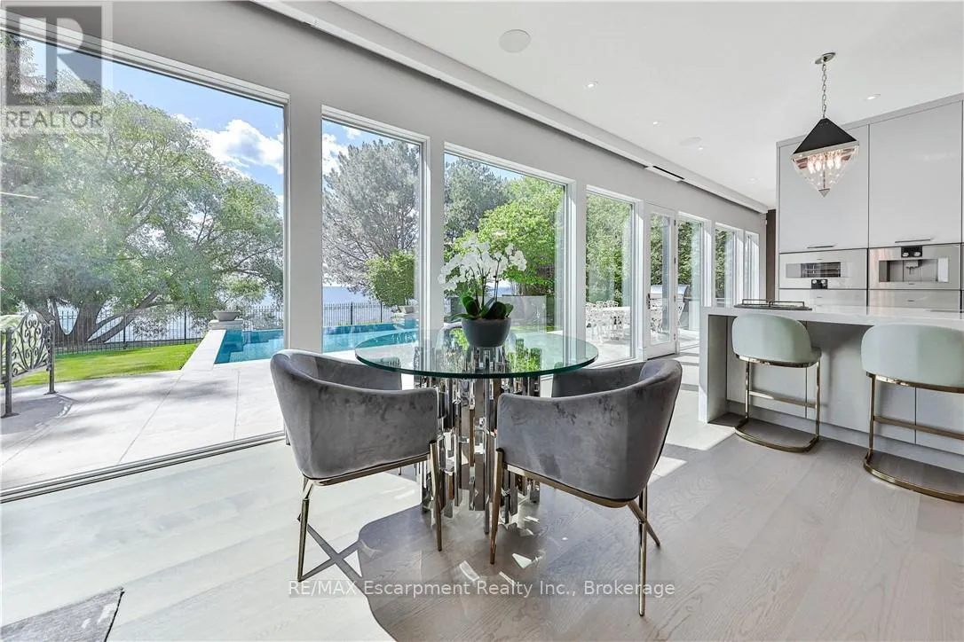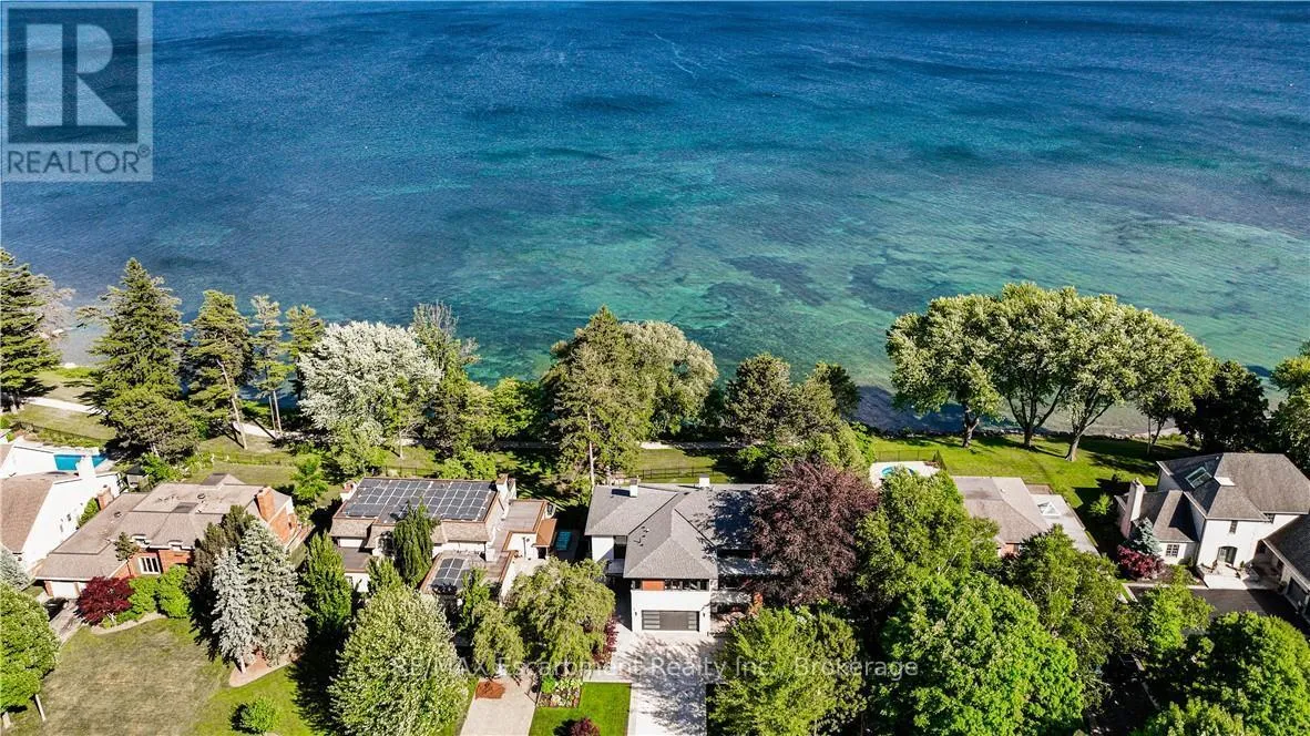 Kingsford Pl to Chancery Lane W Designed to capture panoramic water views - Waterfront luxury awaits at 2250 Chancery Lane W. On exclusive SE Oakville enclave, this modern masterpiece offers 9,177 sf w/5 bdrms & 7 baths. Bright & airy w/ soaring 10ft ceilings on every level & vast windows. Chef's kitchen w/ modern cabinetry, quartz countertops & slab backsplash & top-of-the-line Gaggenau B/I appliances. All living & entertaining spaces are generously proportioned, offer lake vistas & lux finishes such as suspended slab fireplaces, designer lighting & integrated storage to maintain a sleek aesthetic. Multiple walkouts lead to natural stone terrace & infinity pool. MF office. Upstairs - Primary retreat, w/spa-like ensuite & Lake views. 3 add'l bdrms, each w/ensuite, & a laundry rm. Lower Level-Automated theatre, golf simulator, rec/games room w/wet bar; 5th bedroom, exercise room, wine wall, 2 full bathrooms, & walk-up to yard. 3-level elevator, heated tiled floors & full home automation. LUXURY CERTIFIED. (id:27476)