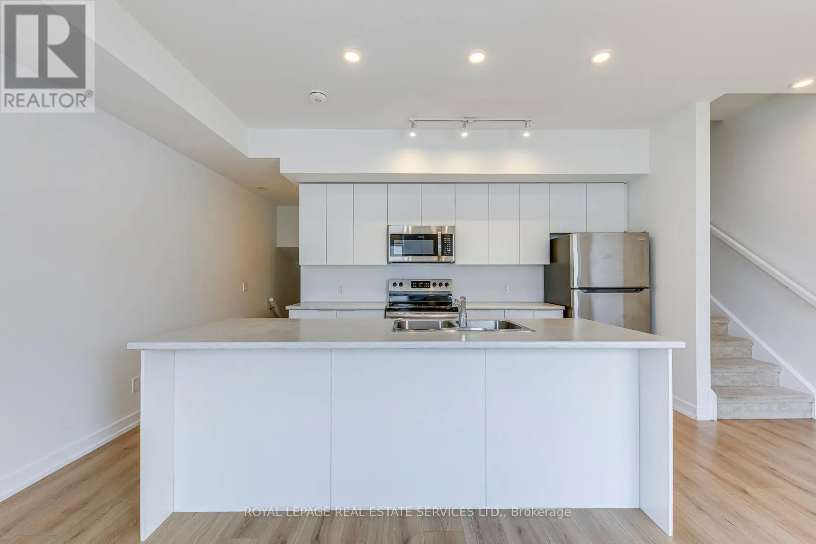 Sixth Line and Dundas Freshly-painted, modern, well-maintained stacked townhome featuring 2 bedrooms, 2 bathrooms, 2 underground parking spots, and a large 75 sqft locker, located in the highly desired Glenorchy neighborhood. With private outdoor access, offering 1,135 sqft of interior living space + 330 sqft private rooftop terrace with sunset views, perfect for entertaining. Bright and airy with large windows and laminate flooring throughout the main and upper levels. The open-concept main floor features a seamless layout with a kitchen, dining, and family room. The kitchen includes an island with sink, contemporary cabinetry, and stainless steel appliances. The unit offers ample storage space: each bedroom has its own closet, a walk-in closet in the primary bedroom , a linen closet in the second floor hallway, and a convenient coat closet at the entrance. Situated on a quiet courtyard. Prime location: steps to amenities, top-rated schools, beautiful parks, shopping, and restaurants. 2 Parking and 1 locker included. Tenant pays all utilities. Professionally cleaned & freshly painted. (id:27476)