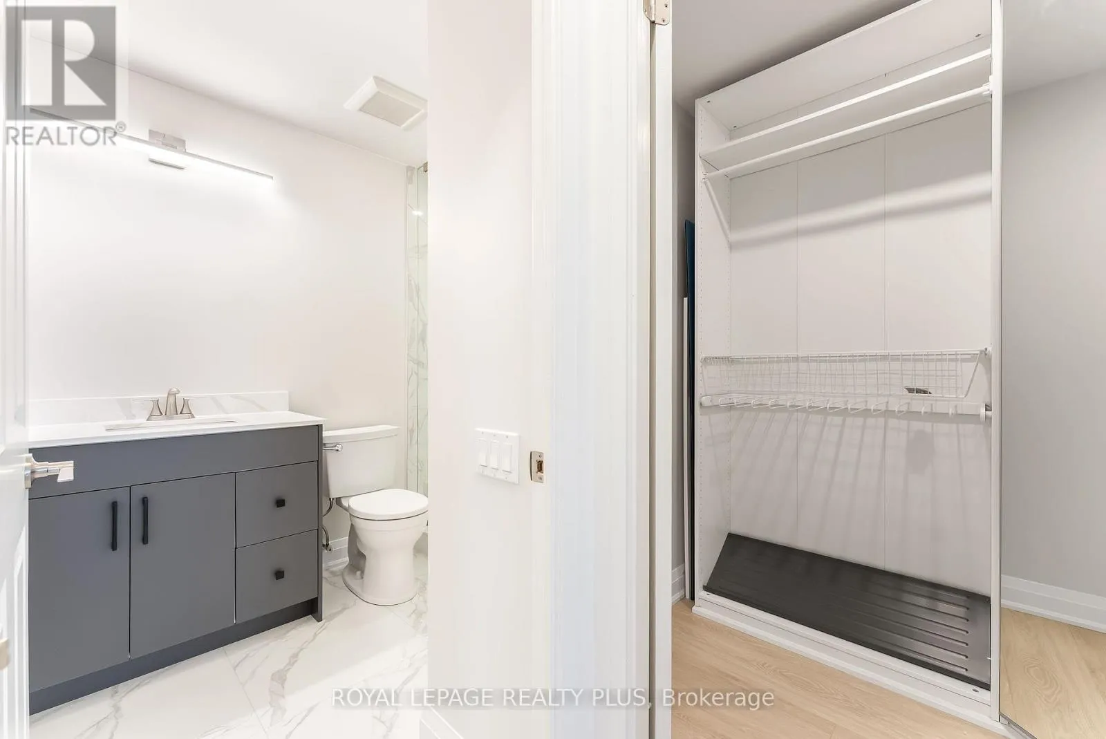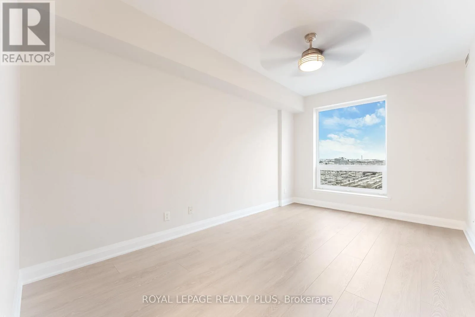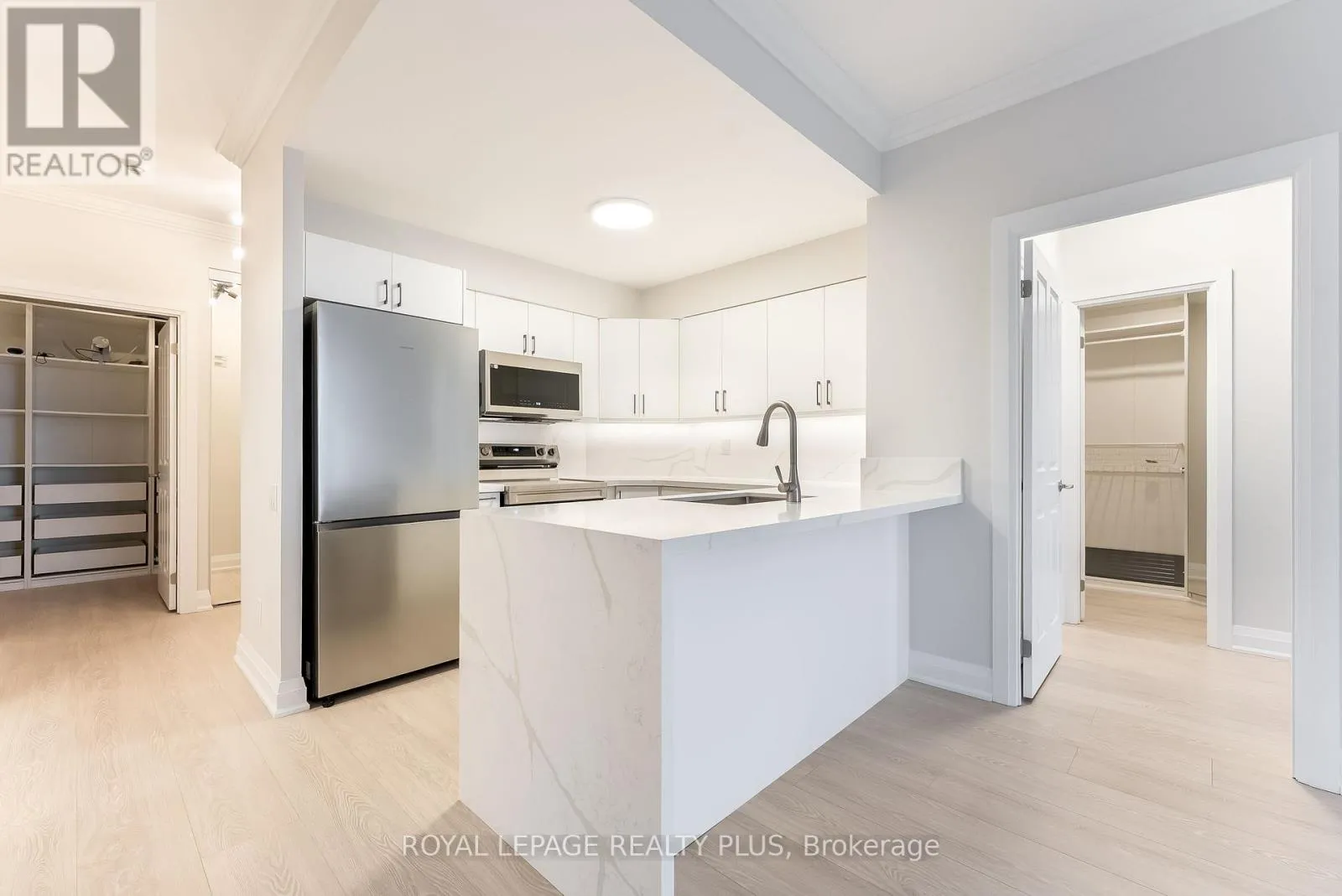 Cross Streets: Old Mill Road & Cornwall Road. ** Directions: Old Mill Rd & Cornwall Rd. Welcome to this exceptional fully renovated condo in the heart of prestigious Old Oakville. This highly sought-after unit has been completely updated from top to bottom, featuring a brand new custom kitchen with quartz countertops, sleek laminate flooring, and all-new stainless steel appliances. Both bathrooms have been fully renovated, including a luxurious primary ensuite with walk-in shower. An additional closet-style den or office space with built-in shelving offers exceptional convenience and organization. The second bedroom features frosted glass doors, providing enhanced privacy while maintaining a bright, modern aesthetic. Enjoy modern comfort with one parking space and a locker included. Ideally located just steps from the GO Station, downtown Oakville, and the waterfront. Building amenities include a pool, gym, party room, and outdoor BBQ area. Turnkey, sophisticated living in one of Oakville's most desirable neighbourhoods. (id:27476)