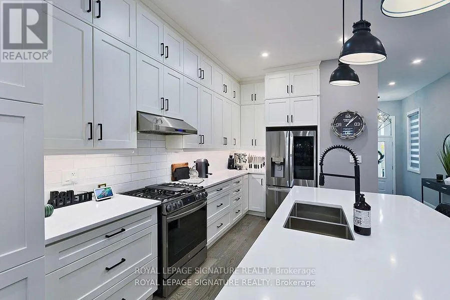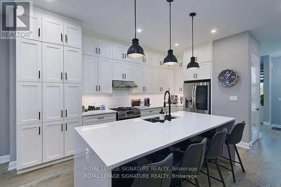 Dundas & 9th Line Exceptional 4-bedroom, 3-bathroom home built by Mattamy in 2021, nestled in the prestigious & family-friendly Joshua Meadows neighbourhood. with 2,555 sq. ft. above grade, this two-storey home sits on a premium lot with NO FRONT OR REAR neighbours, offering rare privacy & peaceful views. Designed for modern living & effortless entertaining, the open-concept main floor features 5" White Oak Apollo hardwood flooring, smooth ceilings, & a stylish great room w/a gas fireplace, reclaimed wood mantle, & ledgestone surround. The upgraded architect's choice kitchen is the heart of the home, boasting Caesarstone countertops w/a waterfall island, premium soft-close cabinetry, full pantry wall, designer backsplash, matte black hardware, undermount lighting, Bianco double sink, microwave base, & high-quality stainless steel appliances. The upper level includes a spacious primary retreat w/a tray ceiling, walk-in closet, & spa-like ensuite featuring a freestanding soaker tub, glass-enclosed shower, double sinks, quartz counters, designer tile, & black matte fixtures. 3 additional bedrooms offer upgraded broadloom w/1/2" Regency underpad. The upper-level laundry rm is both stylish & functional, w/quartz counter for folding laundry, upper & lower cabinetry, designer backsplash, & front-load washer and dryer. The unfinished BASEMENTINCLUDES UPGRADED 9' ceilings & a golf simulator - perfect for active lifestyles. Over $253K spent on upgrades, including $100K in low-maintenance landscaping w/stone pavers and artificial turf. Additional features include Ecobee smart thermostat, Nest outdoor camera, high-efficiency furnace w/air purifier & humidifier, & BBQ gas line. Direct garage access & parking for two. Located minutes from top-rated schools, scenic trails, shopping, & major highways -this is the perfect place to live, relax, and thrive. Harvest Oak Public School (kindergarten-Gr.8), recently built, minutes away. SEE ATTACHED FEATURE SHEET for full list of features & upgrades. (id:27476)
