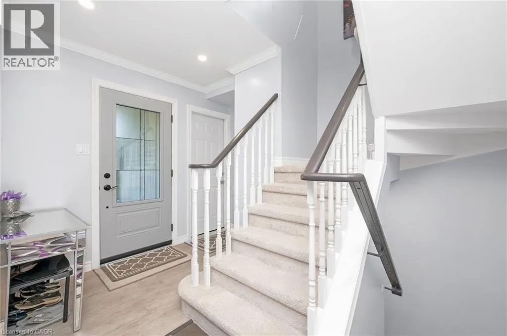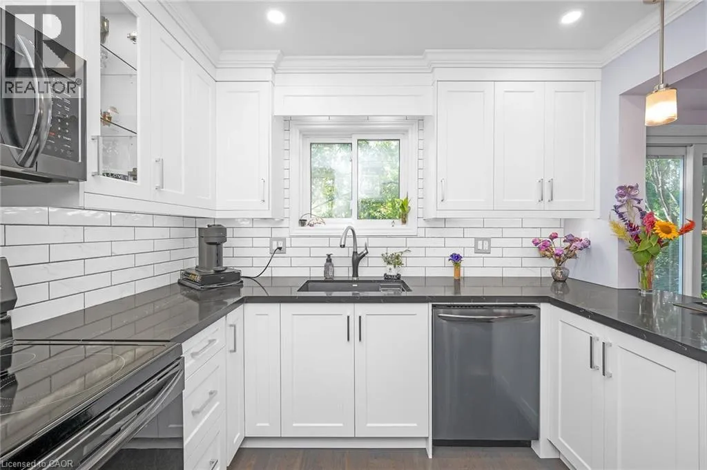 Towne Blvd / Ross lane Welcome to this charming 3-bedroom semi-detached home on a quiet, family-friendly street in sought-after River Oaks. Set on a rare 53 x 198 ft private lot. The main floor features a bright living and dining area with hardwood floors, and a renovated kitchen with granite countertops, a stylish backsplash, plenty of cabinetry, and a handy pull-out pantry. Beautiful patio doors lead to the expansive backyardâa true retreat with a gorgeous gazebo with waterproof curtains, and mature trees. Upstairs, youâll find 3 well-sized bedrooms and an updated 4-piece bathroom. The partially finished basement includes an updated powder room, laundry area, and lots of storage. Recent updates include new carpet (2025) on the stairs and upper level, plus a new front door (2025). The garage provides inside entry and a rear door with direct access to the backyard. Parking for up to 5 cars! Driveway made of aggregate concrete. This home is close to top-rated schools including River Oaks Public, White Oaks Secondary, Rotherglen, and several more, as well as parks, trails, and recreation centers. A perfect blend of convenience and community in a mature neighbourhoodâdonât miss this exceptional River Oaks gem! (id:27476)