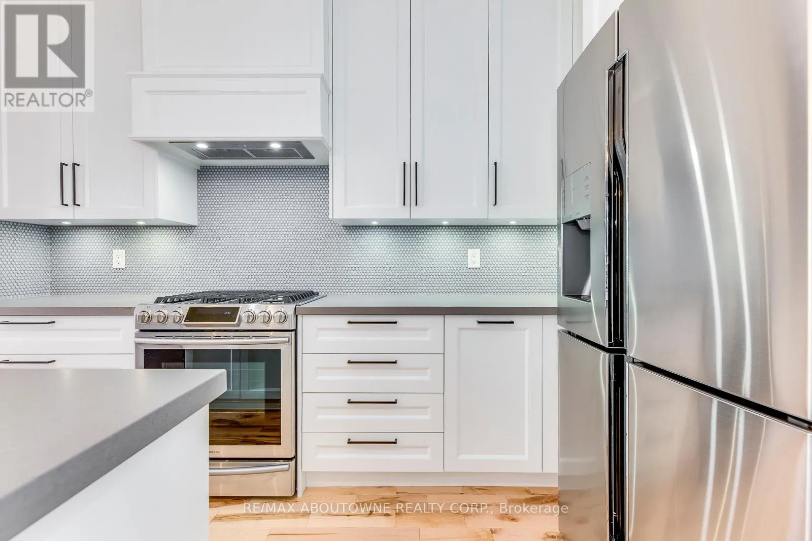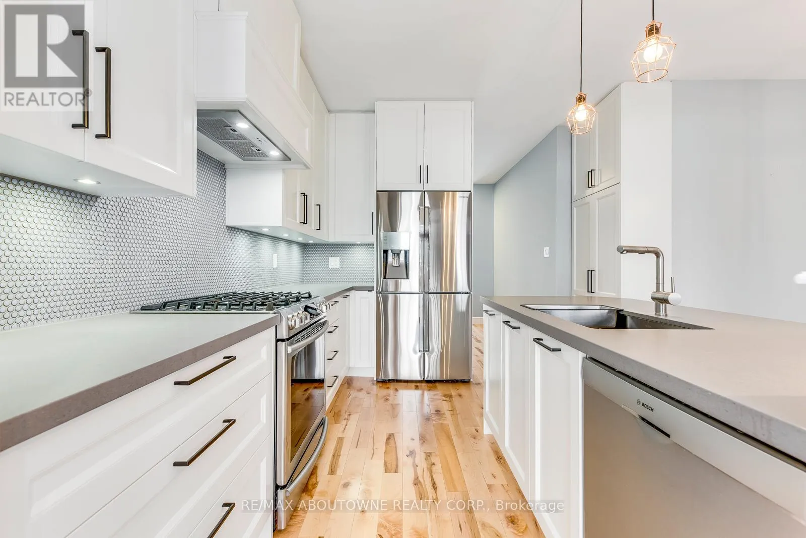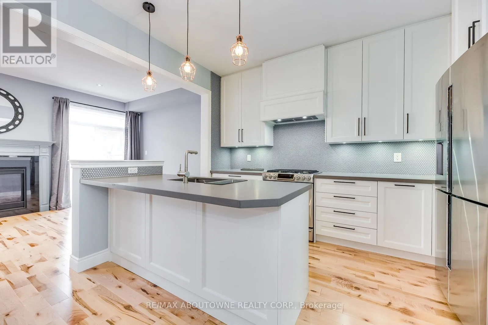 Dundas Street West to George Savage Avenue, North to Leadwood. Bright and modern, this gorgeous traditional 2-storey townhome is extensively upgraded with high-end finishes throughout the 2,164 sf of finished living space. An elegant double front door invites you into the open-concept main floor living & dining, warmed by a gas fireplace, while 9' smooth ceilings & hardwood floors flow effortlessly throughout this level. The heart of the home is a custom white kitchen offering; full-height cabinetry, built-in-place range hood, soft close technology, pull-out recycling & pot drawers, deep pantry & concealed undercabinet lighting, premium stainless appliances inc. Samsung fridge & gas stove that will delight the budding chef. The style-conscious will appreciate the quartz countertops with breakfast bar, undermount sink, premium faucet & backsplash. A hardwood staircase guides to 3 upper level bedrooms inc. private master suite with a walk-in & ensuite with tiled shower & soaker tub. Hardwood floors lead down the hallway to well sized bedrooms offering plentiful natural light & shared bathroom. Downstairs, a fully-finished basement awaits, complete with a recreation room boasting plush carpeting, full bath, plenty of storage & laundry closet with full size appliances. There are so many extra features including a new water softener & reverse osmosis water system, and the home is freshly painted with upgraded lighting throughout. Outside, your entertainer's oasis awaits with a large deck as well as a gas BBQ line. (id:27476)