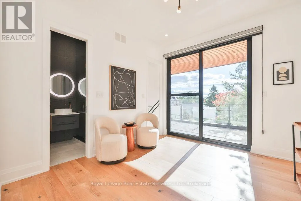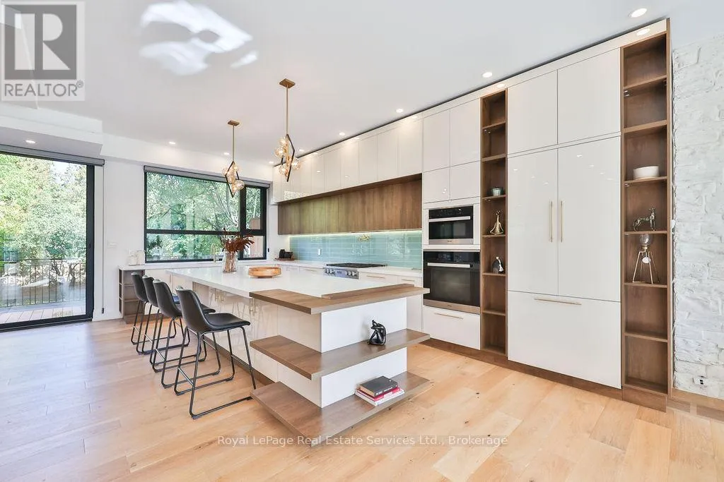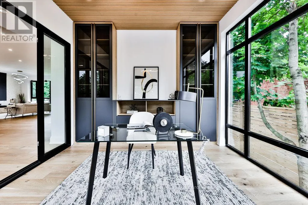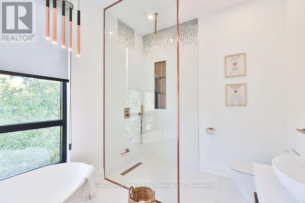 Cross Streets: Rebecca St and Stanfield Dr. ** Directions: Rebecca St to Stanfield Dr to Sandlewood Rd. Spectacular custom home, combining West-coast & Scandinavian influences. Over 3300 sqft above grade, light-filled 5 bed, 6 bath with 10' ceilings and salt water pool, set on a quiet street in West Oakville. Appointed with high end & stylish materials throughout including HOPO aluminum windows, doors & steel screens, wide plank hardwood, custom tile work, and upscale modern light fixtures. Impressive white stone + aluminum panel exterior. Custom front door leads to expansive open concept main floor. Living room features gas fireplace set into salvaged looking wooden beams, massive oversized windows and large seating bench with built-in storage. Designer kitchen includes oversized island with quartz counters & integrated Miele appliances. Kitchen & dining room walk out to back deck & pool. Glass walled office includes floor to ceiling windows, custom B/I cabinets & feature ceiling. Floating staircase with aluminum railing leads to the upper level with 10' ceilings, hallway skylights & Polaris chandelier. Primary bedroom features Juliette balcony, accent wall with custom wood paneling, walk-in closet with extensive organizers and ensuite. 5pc primary ensuite with double floating vanity, walk-in glass shower with rain-head & Victoria & Albert soaker tub. Large 2nd & 3rd bedrooms with double closets with extensive organizers, and oversized windows. Main bath features wood accented double vanity, walk-in glass shower & skylight. 4th bed boasts ensuite bath, walk-in closet and walk out to enormous balcony with privacy & shade screens. 5th bedroom features ensuite, Juliette balcony and double closet. Basement includes bar with built-in storage & wine fridge, electric fireplace, large windows, walkout & bathroom. Heated salt water pool (liner & heater 2022), surrounded by stone patio & overlooked by composite back deck with privacy screen and aluminum railings. Double car garage with epoxy floors. Close proximity to lovely Downtown Bronte & Lake, Go train, Schools & Parks. (id:27476)