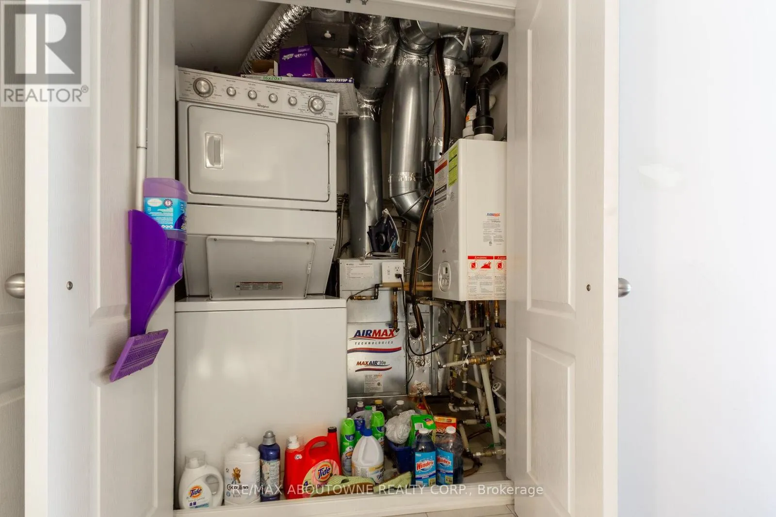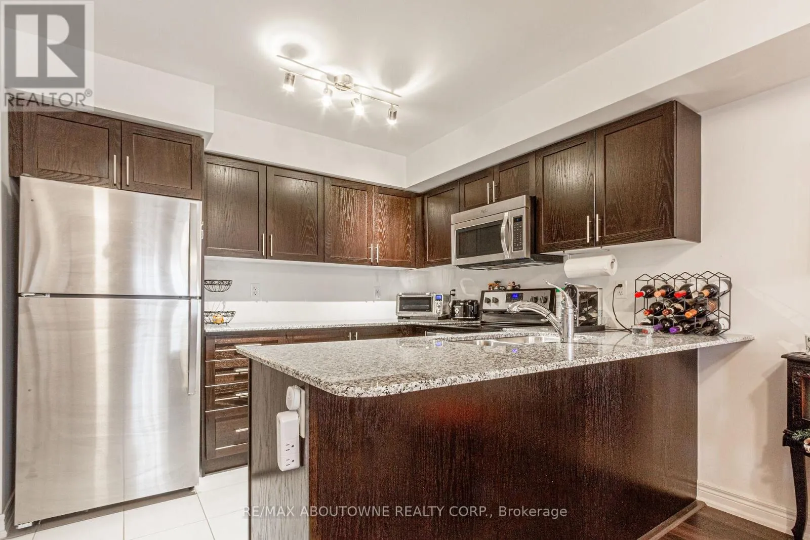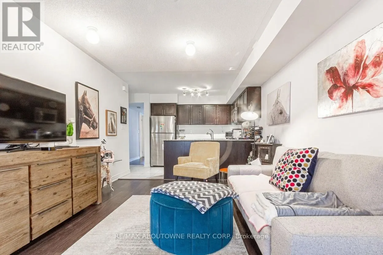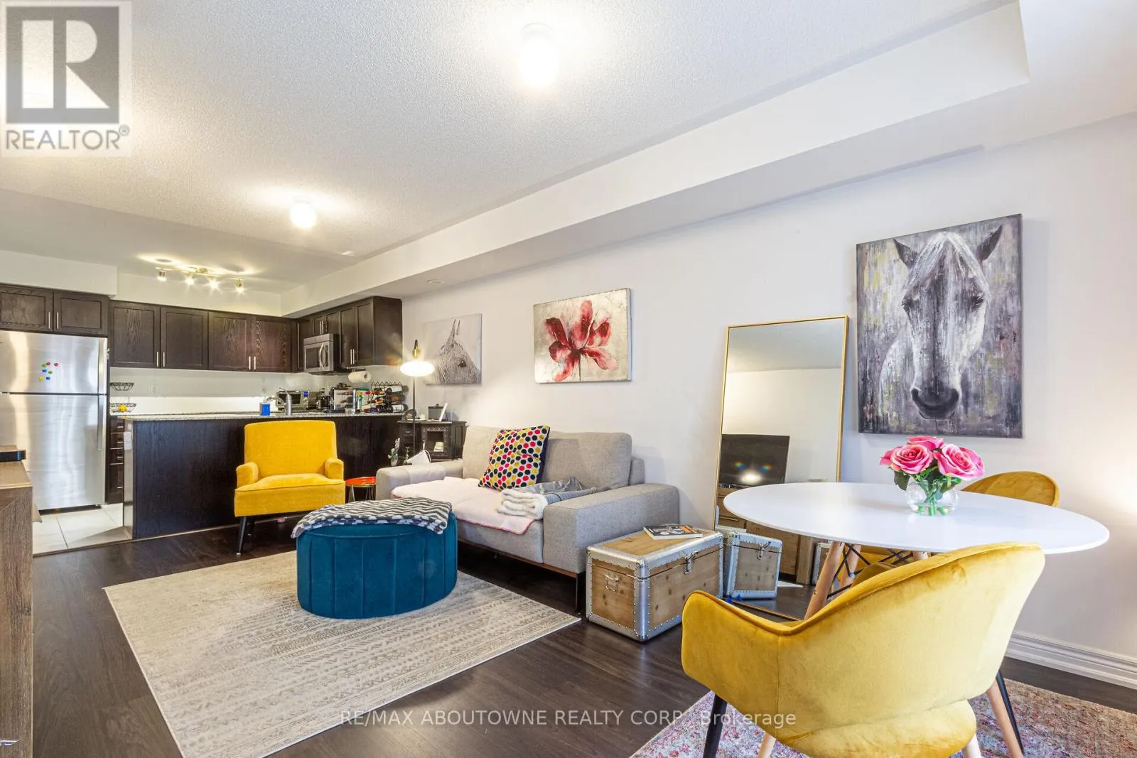 Cross Streets: Dundas & 6Th Line. ** Directions: Dundas to Post Road. This beautiful main level stacked townhome features 2 bedrooms and 2 bathrooms. The spacious great room opens to a kitchen equipped with stainless steel appliances, including a built-in dishwasher and microwave. The primary bedroom boasts a 3-piece ensuite, while the spacious second bedroom can access its own 4-piece bathroom. The convenience of main floor living is enhanced by a laundry room with no stairs to navigate. Enjoy the covered patio with a natural gas line for BBQs. The property includes one underground parking space and a private locker. Located in an excellent area, it's within walking distance to shopping, parks, and public transit, with easy access to QEW, 403, 407, and a short drive to Oakville Hospital and Oakville GO station. Ideal for Triple A tenants. 2nd Parking Spot Available at additional Cost (id:27476)