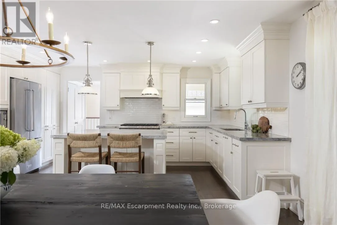 Cross Streets: Trafalgar Rd to King St. ** Directions: TRAFALGAR RD TO KING STREET. Experience the charm of this exceptional character home in the heart of Old Oakville, just steps from the lake, waterfront trail, and parks. This beautifully renovated residence offers R approximately 2,877 sq ft above grade, plus a finished lower level with soaring ceilings, providing abundant living space. Enjoy stunning lake views from the signature wrap-around porch overlooking meticulously landscaped gardens with hydrangeas and boxwoods. Inside, the home features a bright white kitchen with quartzite counters, large center island, and premium built-in appliances, flowing seamlessly into the living and informal dining areas with direct porch access. The formal dining room includes a wood-burning fireplace, while newer hardwood floors run throughout the main level. Additional spaces include a mudroom, powder room, office, and family room with vaulted ceilings. Upstairs, the primary suite offers a luxurious ensuite with marble floors, soaker tub, glass shower, and walk-in closet. Three more bedrooms (one currently an office), a main bathroom with walk-in shower, and a laundry room with new washer and dryer complete the upper level. The lower level provides flexibility with a spacious rec room, fifth bedroom, three-piece bathroom, and utility/storage room. Step outside to private landscaped gardens ideal for outdoor entertaining. A double car garage plus driveway parking for six completes the package. Located within walking distance to downtown Oakville's shops, restaurants, Lake Ontario, and Oakville Club, with Oakville GO train and highways just minutes away. Perfect for families seeking character, convenience, and luxury in one of Oakville's most desirable neighborhoods. AAA tenants for one year lease. Employment letter, full credit report with score, and paystubs required. Non-smoker. (id:27476)