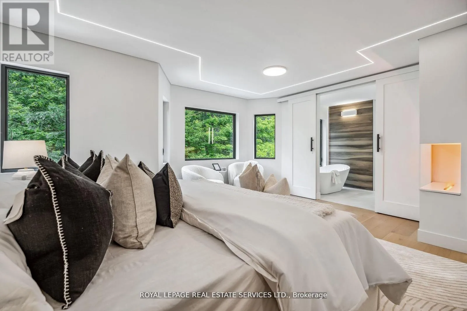 Upper Middle Rd E and Ninth Line Welcome to a rare offering in one of Joshua Creek's most sought-after enclaves-an elegant contemporary residence tucked on a private, wooded lot that exudes both serenity and sophistication. Designed for those who appreciate refined living without compromise, this exceptional home blends modern comfort with timeless style. Featuring five spacious bedrooms plus a versatile main-floor office or guest suite, and six beautifully appointed bathrooms, every inch of this home is crafted with care. Soaring cathedral ceilings and expansive windows fill the space with natural light, while the open-concept layout creates an effortless flow ideal for family life and entertaining alike. The thoughtfully curated interior showcases quality craftsmanship, refined finishes, and a calm, minimalist aesthetic that feels both warm and elevated. Outside, a landscaped paradise awaits-complete with an interlocking stone walkway, charming pergola, and lush gardens that frame a tranquil backyard retreat backing onto a scenic walking trail. Perfectly positioned on a quiet street yet moments from top-rated schools, boutique shops, fine dining, and major highways including the 403 and QEW, this home offers the ideal blend of privacy and accessibility. Meticulously maintained and move-in ready, this Joshua Creek masterpiece invites you to experience modern luxury at its finest-a home where every detail speaks of comfort, elegance, and enduring style. (id:27476)