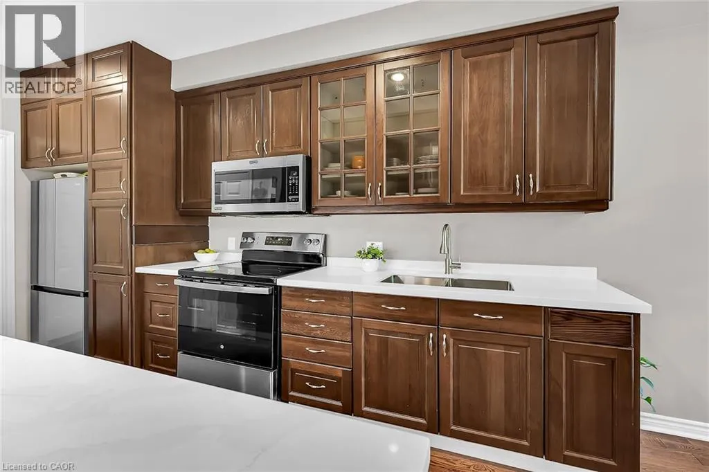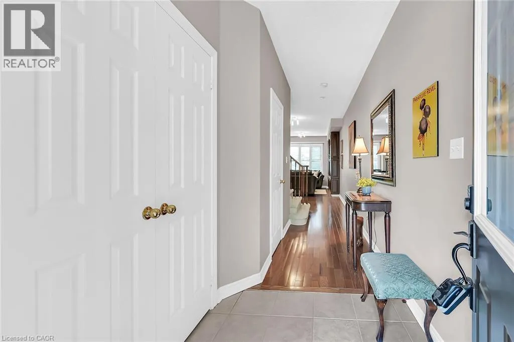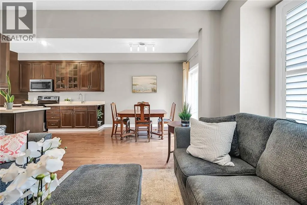 Off Eighth Line, North of Glenashton This beautifully maintained home offers an open-concept main level with hardwood floors, a modern kitchen with quartz countertops, a spacious living/dining area with custom-built entertainment unit . Sliding glass doors lead to a private deck and ground level patio overlooking green space. Upstairs, three generous bedrooms, complete with ceiling fans, and a primary suite with a walk-in closet, a double closet, and 4 piece ensuite. There is also a double linen closet for extra storage. The finished basement adds a versatile bonus room for a home gym/ teen suite/guest suite with private full bathroom. California shutters throughout add style, and the inside entrance from the garage adds convenience. The location in Wedgewood Creek provides trails, parks, a Community Centre, and top rated primary and high schools. Quick access to the QEW, 403, and GO station ensure easy commuting. This turnkey home is a rare gem in a vibrant, yet private, community. Make it yours! (id:27476)