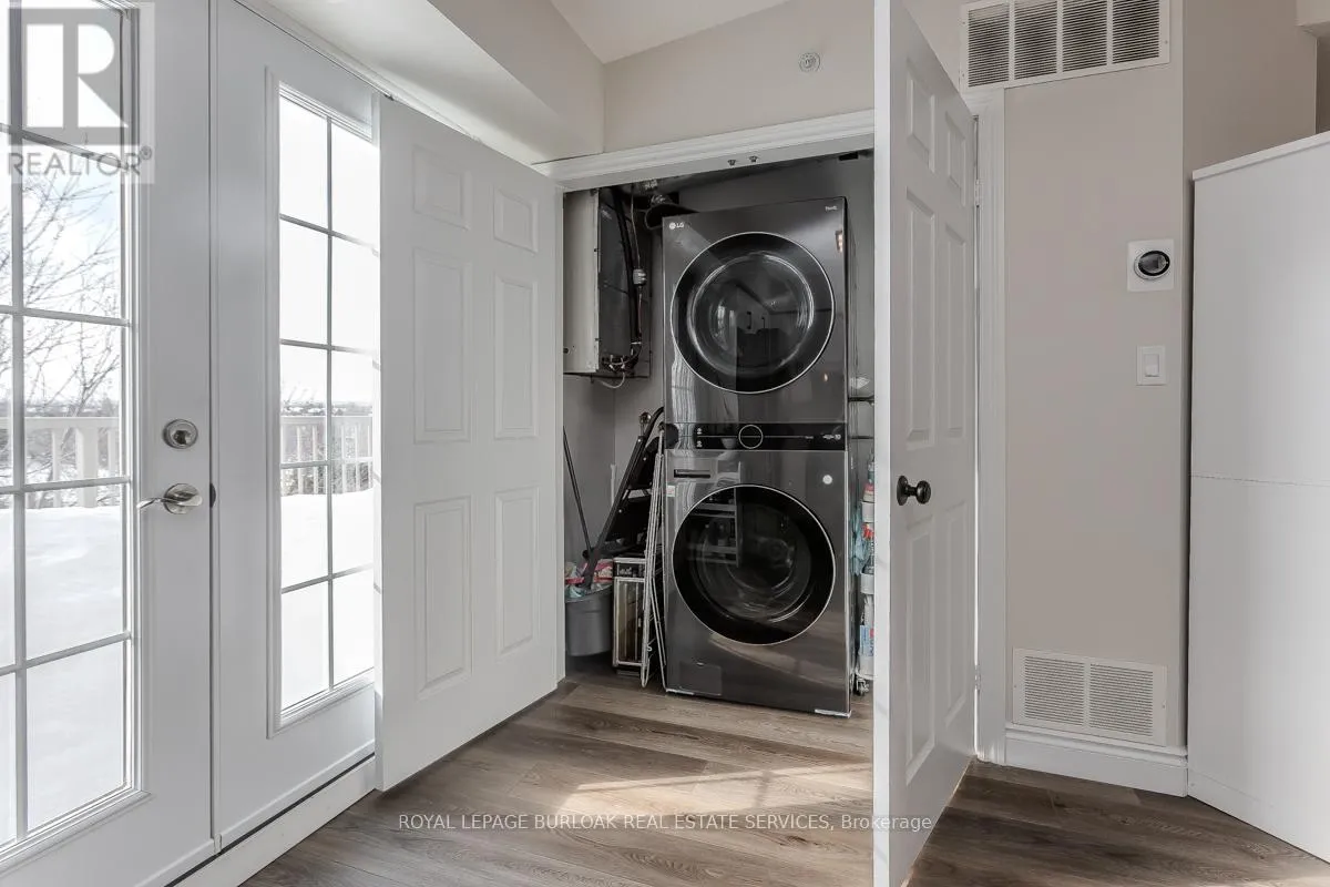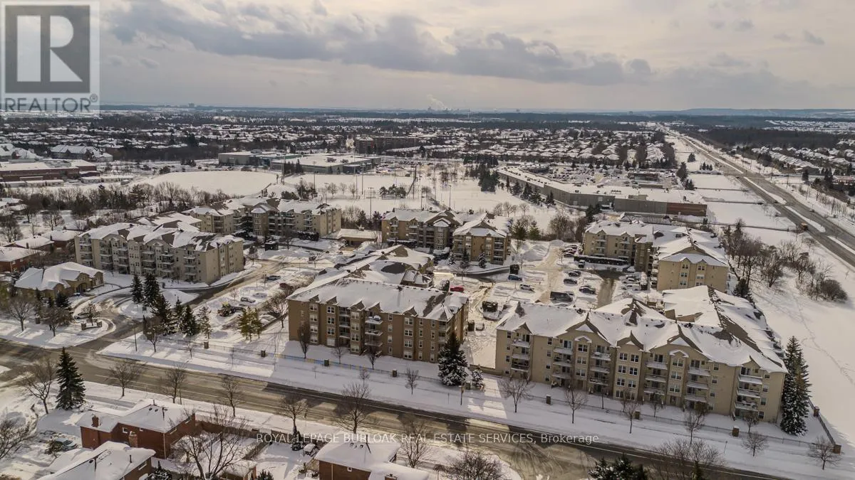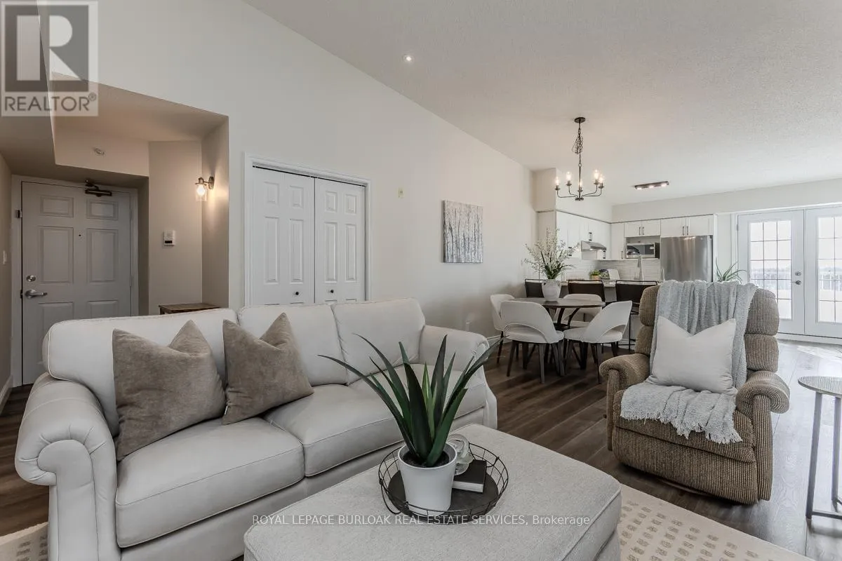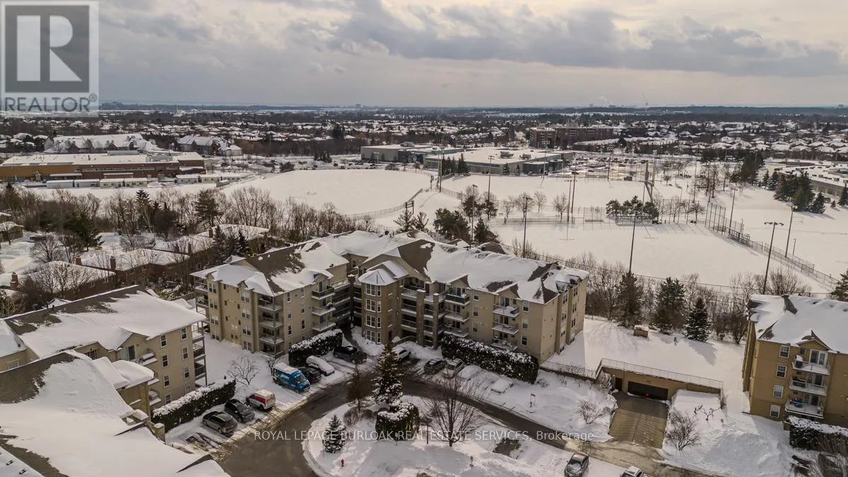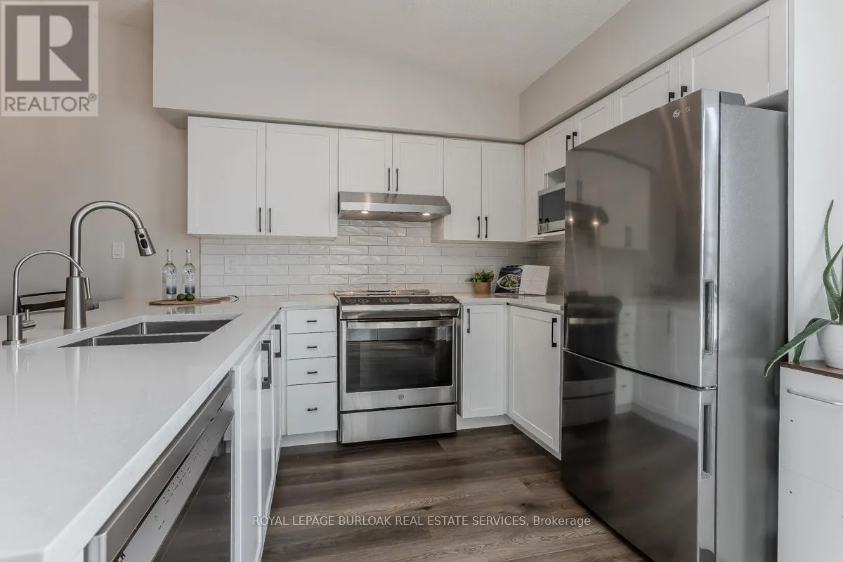 Cross Streets: Upper Middle Road & Bishops Gate. ** Directions: Upper Middle Road To Bishops Gate. Welcome to a beautifully upgraded condo retreat backing onto a tranquil park, nestled in the highly sought-after Glen Abbey neighbourhood. Surrounded by scenic trails and green spaces, yet just minutes to highways and everyday essentials, this location strikes the perfect balance between convenience and calm-ideal for first-time buyers and downsizers alike. Inside, the space is bright, fresh, and thoughtfully updated throughout. Newer laminate flooring (2024), fresh paint, and upgraded light fixtures create a modern, move-in-ready feel, while vaulted ceilings in the main living area add an airy sense of volume. The open-concept layout flows effortlessly from the living and dining areas into a stylish, upgraded kitchen featuring quartz countertops (2024), a classic subway tile backsplash, custom cabinetry (2024), stainless steel appliances (2024), and a peninsula with breakfast bar-perfect for casual meals or entertaining. A walkout leads to a private balcony overlooking the park, offering a peaceful outdoor escape. The spacious primary bedroom features a large window and a 4-piece ensuite with an upgraded vanity. A second bedroom provides flexibility for guests, a home office, or hobby space, while the 3-piece main bath impresses with a walk-in shower and upgraded vanity. In-suite laundry with newer machines (2024) adds everyday ease. Complete with one underground parking space and a storage locker, this well-managed building also offers fantastic amenities including a clubhouse with gym and sauna, plus a convenient underground car wash. A perfect opportunity to enjoy low-maintenance living in a prime, park-side setting. (id:27476)