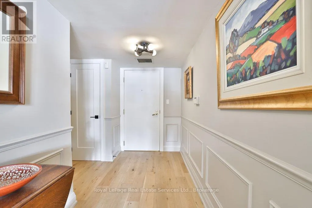 Cross Streets: Lakeshore & Trafalgar. ** Directions: Lakeshore-Navy-Robinson. One of a kind, extensively renovated, large (1710 sqft) 2 bed, 2 bath ground level unit featuring river & harbour views and an approximately 40' wide garden terrace, providing 600-640sqft of outdoor living space surrounded by newly landscaped gardens. Located in the prestigious Granary building, nestled against the 16 Mile creek & steps to Lake Ontario, The Oakville Club, restaurants, cafes, shops & parks! An oasis on the water in Downtown Oakville! Renovated head-to-toe, with hardwood, shaker style doors with black matte hardware, oversized baseboards, contemporary lighting & freshly painted throughout. High-end kitchen featuring quartz counters, stainless steel appliances (LG fridge, stove, B/I microwave/range hood, Bosch Dishwasher, Frigidaire wine fridge), custom cabinetry with undermount lighting & glass door cabinets with integrated lighting. The kitchen flows into the dining room that boasts integrated cove lighting and a contemporary chandelier. The dining room opens to the living room that features a built-in Continental electric fireplace with custom shiplap mantle and built-in shelving. Custom bench seating underneath a large window with river & harbour views is another highlight. Wall-to-wall glass double door walkout to a sprawling garden terrace with two outdoor dining areas surrounded by newly landscaped gardens, trees & river views. The primary bedroom boasts a walkout to terrace, walk-through closets with custom organizers & ensuite bath. Lux ensuite bath features slate tile, wall-to-wall vanity with walk-in oversized glass shower with rain shower head & bench seating. The second bedroom features a walkout to the terrace, and a walk-in closet. The main bathroom includes oversized slate tile flooring, and glass enclosed shower with subway tile and shower head with wand. Ensuite laundry room with LG stackable washer & dryer, extra storage & sink. Parking spot & large locker (approx 8x10). Completely turnkey, in the right location! Perfect! (id:27476)