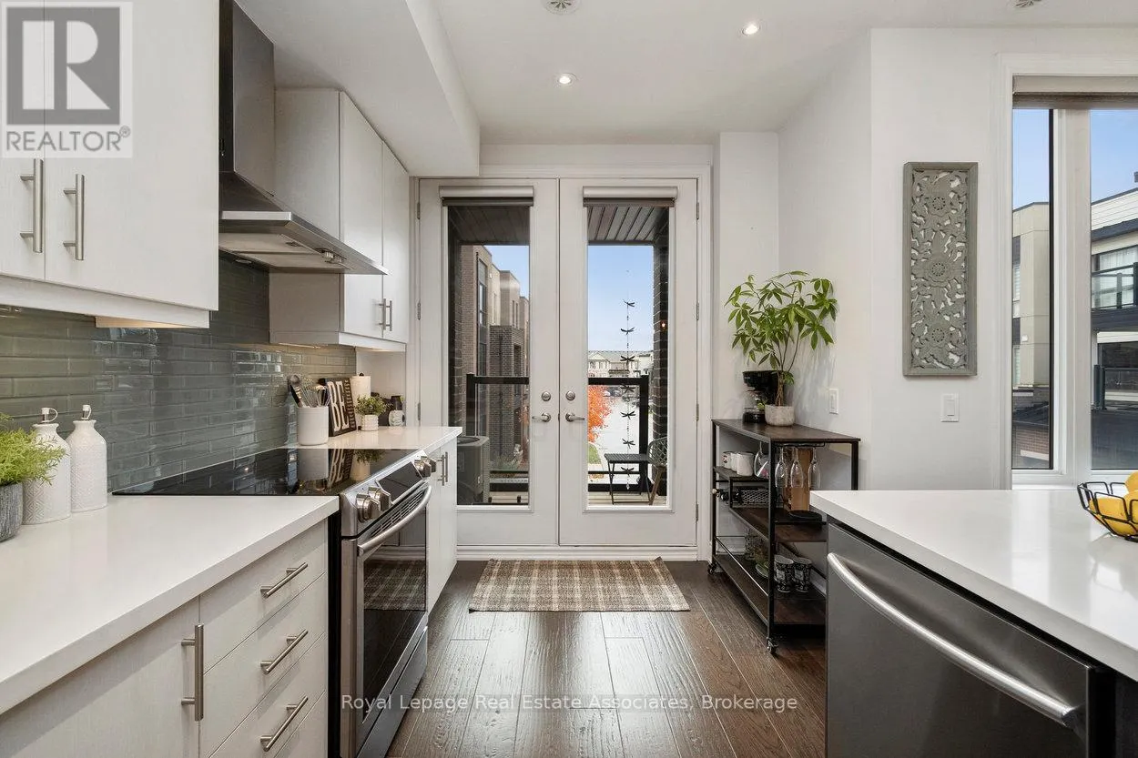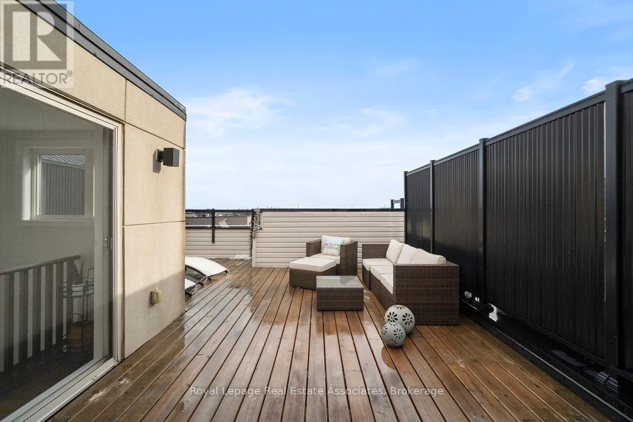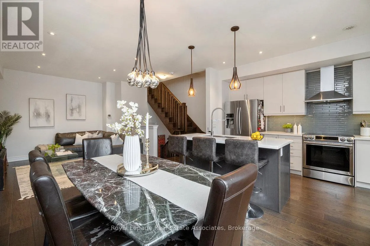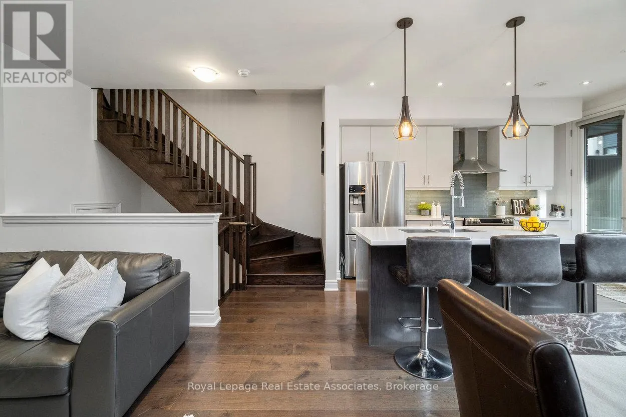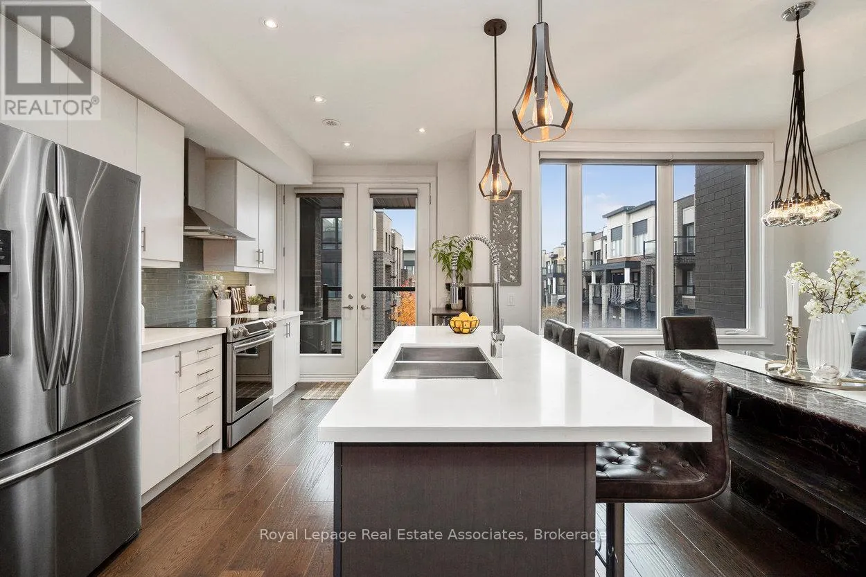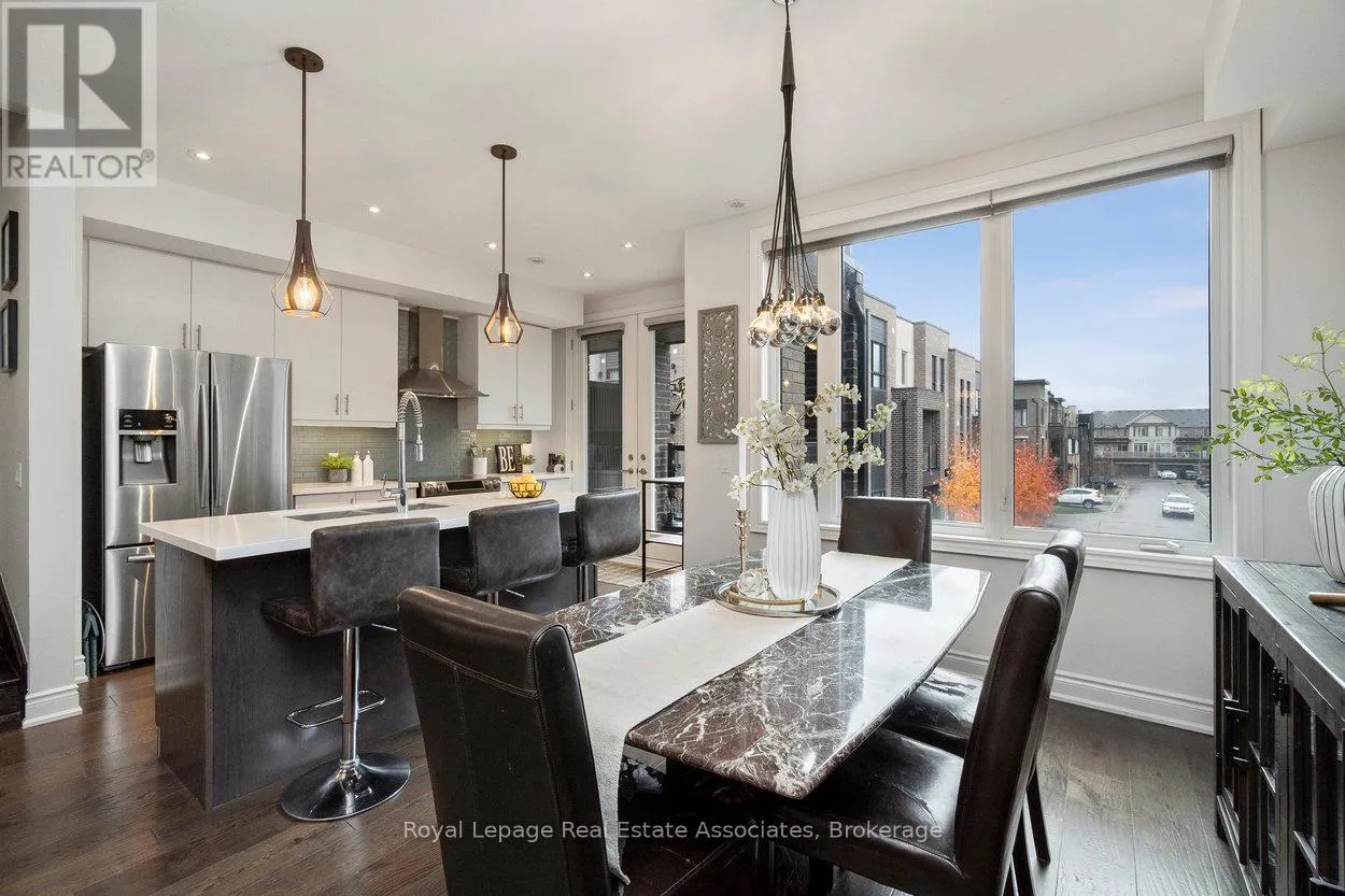 Cross Streets: Trafalgar Rd / Dundas St E. ** Directions: Dundas St E / Postridge Dr / Cascade Cmn. Welcome to 3076 Cascade Common, a beautifully upgraded 2-bedroom, 3-storey townhome located in Oakville's desirable Joshua Meadows community. Offering approximately 1,310 sq ft of living space plus an estimated 412 sq ft private rooftop terrace, this home is perfect for entertaining or relaxing with prime south and west-facing views. The main level features 9 ft ceilings with pot lights on dimmers and a seamless flow from the modern kitchen to the dining and living areas. The kitchen boasts stainless steel appliances, a large island with built-in sink and seating, quartz countertops, under-cabinet lighting, and a glass tile backsplash, and offers a walkout to a private balcony - ideal for morning coffee or evening unwinding. The living area is complete with an electric fireplace finished in modern concrete. Additional highlights include $47,000 in builder upgrades upon construction (2017), such as premium hand-scraped solid white oak hardwood floors with an elegant cashmere finish throughout, upgraded stairway spindles, and thoughtful design touches that elevate the home's style and comfort. The private rooftop terrace is a true retreat, featuring gas and water hookups for BBQs, outdoor dining, and gardening. Enjoy the quiet setting within walking distance to parks, shops, and local amenities. William Rose Park is just steps away, offering tennis, pickleball, baseball, splash pad, and more. Conveniently close to trails, restaurants, GO Transit, and Oakville Trafalgar Memorial Hospital. Monthly POTL fees of $64.67 cover road maintenance and garbage removal. Don't miss this opportunity to own a stylish, well-maintained home in one of Oakville's most sought-after neighbourhoods - Joshua Meadows! (id:27476)