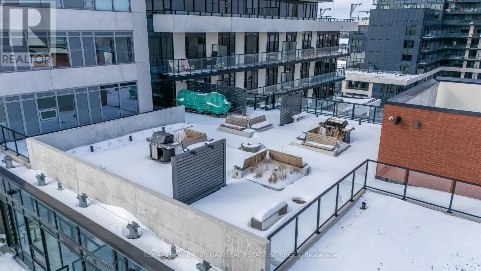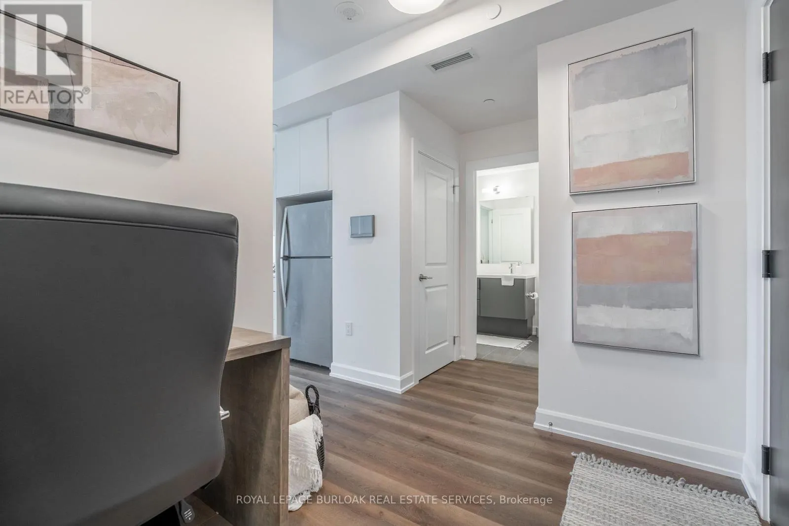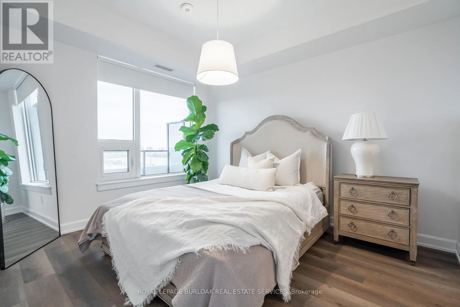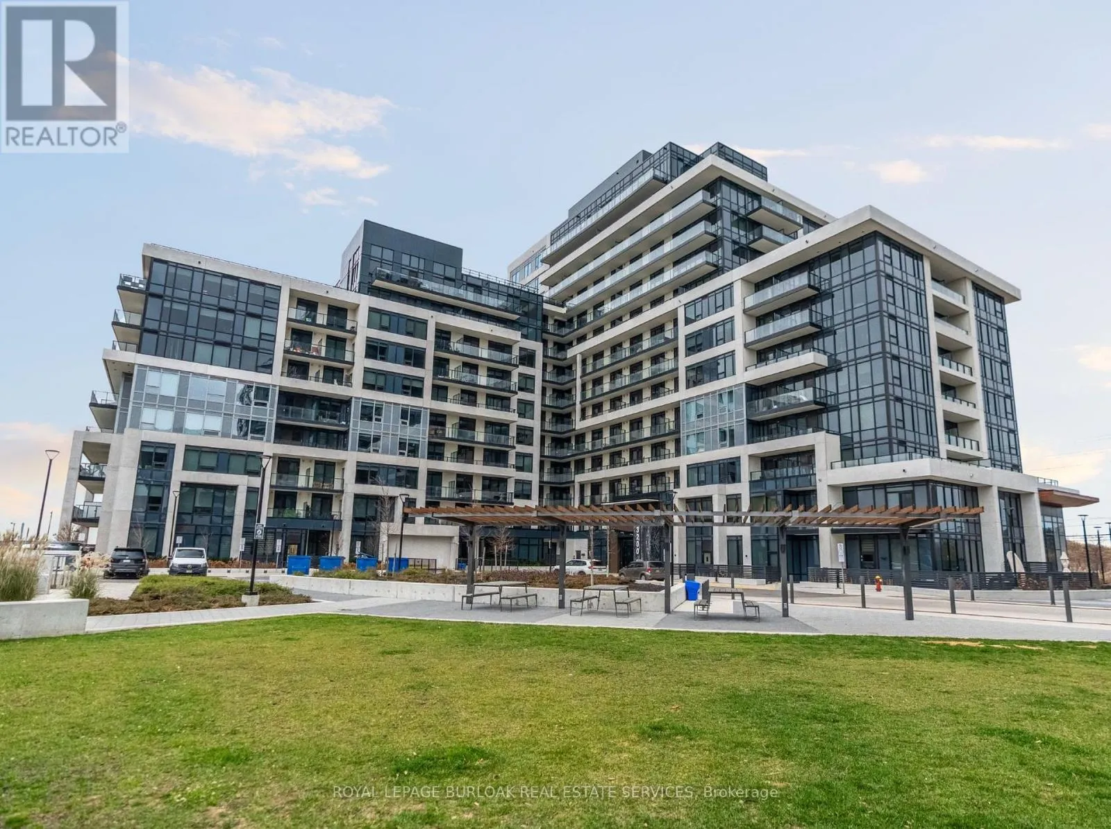 Cross Streets: Trafalgar Rd/Threshing Mill Blvd. ** Directions: Trafalgar Rd to Threshing Mill Blvd, Left on William Coltson Ave. Unlock turn-key living at the Upper West Side Condos by Branthaven! This beautifully maintained 695 sq ft one-bedroom + den, one-bathroom suite on the fourth floor is truly one of a kind. Step inside to wide-plank flooring throughout, bright white walls in flawless condition, and a stunning kitchen featuring quartz countertops, subway tile backsplash, under-cabinet lighting, under mount sink, floor-to-ceiling cabinetry, seating for three at the peninsula, a dedicated coffee bar, and a fridge water line hook-up. The spacious living room boasts soaring ceilings, a builder-upgraded TV-ready package, and access to a private 50 sq ft south-facing balcony with serene views. The bedroom easily accommodates a queen bed with room to size up and offers an expansive closet with room for a dresser, plus a valued builder upgrade: ensuite access to the four-piece bathroom, complete with a large vanity, ample counter space, and pristine tile-work. Additional highlights include in-suite laundry, an entry closet, geo-thermal heating and cooling, one storage locker, one underground parking space, and Bell internet included in the condo fees. Enjoy the convenience of keyless entry and the BH Home Technology system for a seamless living experience. Residents have access to top-tier amenities, including a concierge and security, fully equipped gym, pet wash and grooming station, media and party rooms, games rooms, rooftop deck and garden with BBQs, and ample visitor parking. Located in the heart of Joshua Meadows, you're just a short drive to the Uptown Core for shopping, dining, and services, as well as nearby walking trails, golf, parks, and top-ranked schools. Commuting is effortless with quick access to highways 403, 407, and the QEW, making both work and play incredibly convenient. (id:27476)