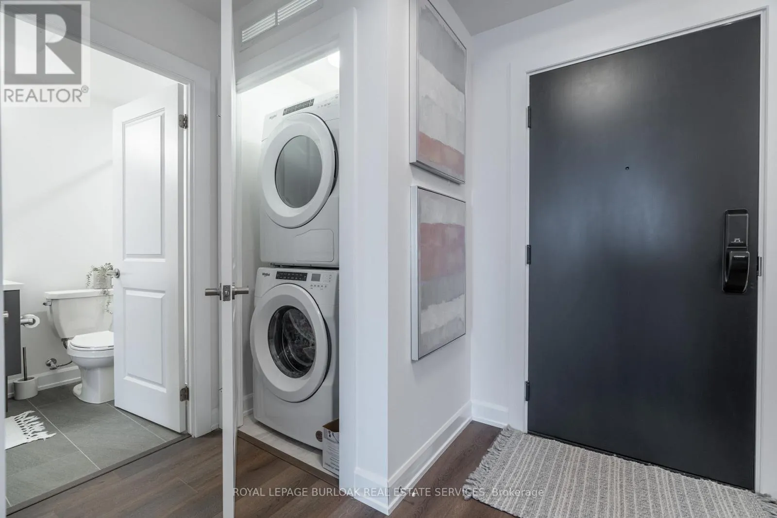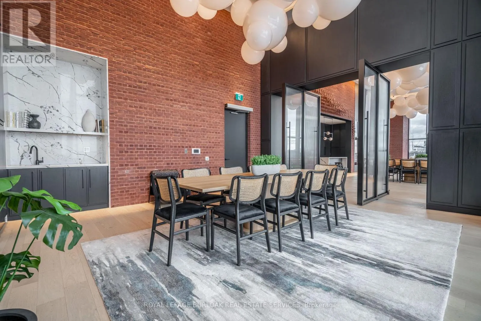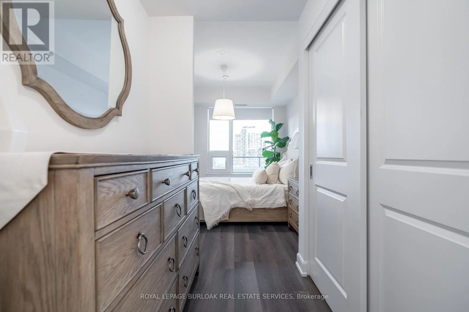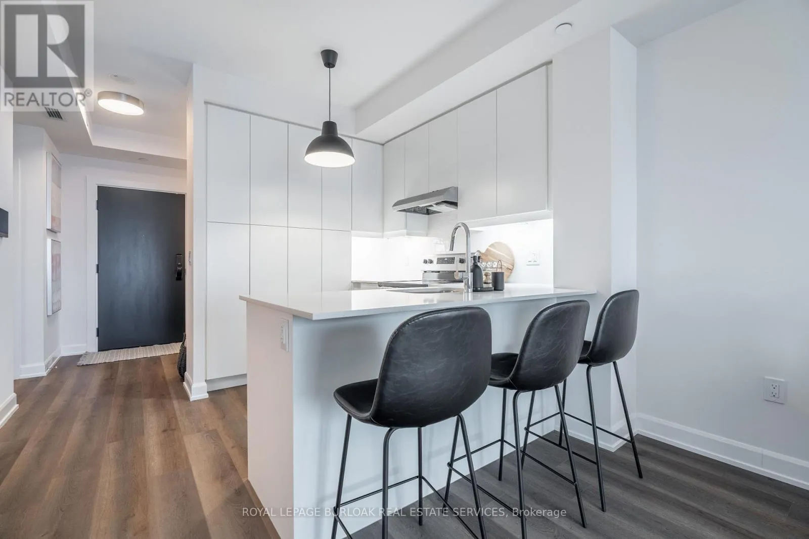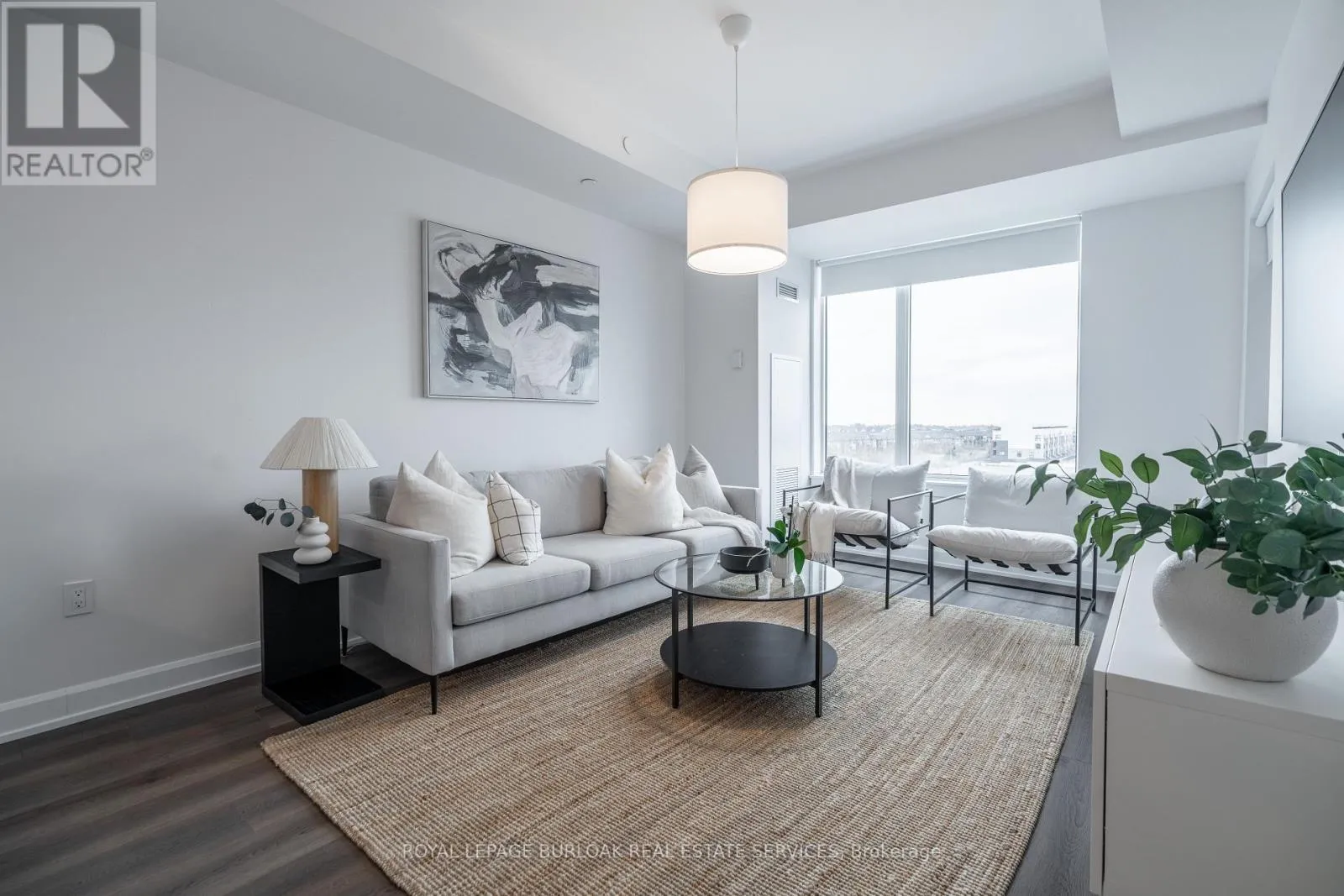 Cross Streets: Trafalgar Rd/Threshing Mill Blvd. ** Directions: Trafalgar Rd to Threshing Mill Blvd, Left on William Coltson Ave. Unlock turn-key living at the Upper West Side Condos by Branthaven! This beautifully maintained 695 sq ft one-bedroom + den, one-bathroom suite on the fourth floor is truly one of a kind. Step inside to wide-plank flooring throughout, bright white walls in flawless condition, and a stunning kitchen featuring quartz countertops, subway tile backsplash, under-cabinet lighting, under mount sink, floor-to-ceiling cabinetry, seating for three at the peninsula, a dedicated coffee bar, and a fridge water line hook-up. The spacious living room boasts soaring ceilings, a builder-upgraded TV-ready package, and access to a private 50 sq ft south-facing balcony with serene views. The bedroom easily accommodates a queen bed with room to size up and offers an expansive closet with room for a dresser, plus a valued builder upgrade: ensuite access to the four-piece bathroom, complete with a large vanity, ample counter space, and pristine tile-work. Additional highlights include in-suite laundry, an entry closet, geo-thermal heating and cooling, one storage locker, one underground parking space, and Bell internet included in the condo fees. Enjoy the convenience of keyless entry and the BH Home Technology system for a seamless living experience. Residents have access to top-tier amenities, including a concierge and security, fully equipped gym, pet wash and grooming station, media and party rooms, games rooms, rooftop deck and garden with BBQs, and ample visitor parking. Located in the heart of Joshua Meadows, you're just a short drive to the Uptown Core for shopping, dining, and services, as well as nearby walking trails, golf, parks, and top-ranked schools. Commuting is effortless with quick access to highways 403, 407, and the QEW, making both work and play incredibly convenient. (id:27476)