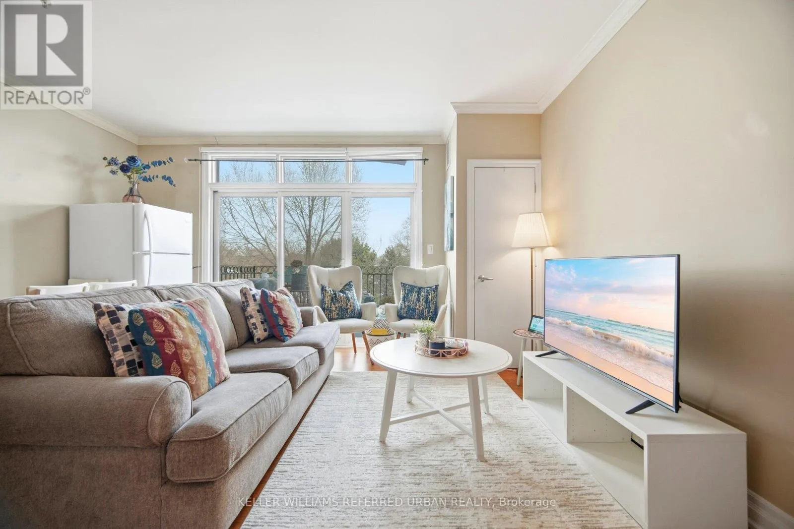 Kerr Street/Speers Rd Welcome to this bright and beautifully laid out 2-bedroom condo in the heart of vibrant Kerr Village in charming Oakville. Offering 750 sq. ft. of functional living space, this well-maintained suite is perfect for buyers seeking an unbeatable walkable lifestyle. From the moment you step inside, you'll notice how naturally the space flows into an open-concept living and dining area filled with natural light, ideal for both relaxing and entertaining. The thoughtfully designed kitchen offers ample storage and workspace, quartz counters, and a breakfast bar. Both bedrooms are generously sized and thoughtfully positioned for privacy and comfort. The primary bedroom offers plenty of space for additional storage, creating a calm retreat at the end of the day. The second bedroom is equally versatile - ideal as a guest room, nursery, home office, or creative space - giving you the flexibility to adapt the home to any lifestyle as your needs evolve. A full 4-piece bathroom and in-suite laundry complete this comfortable and practical layout. This unit also includes one dedicated parking space for added convenience. The building is known for its friendly community atmosphere and unbeatable location. Live just steps from shops, cafés, restaurants, and local boutiques, and enjoy quick access to the GO Station, QEW, scenic waterfront trails, and downtown Oakville. Whether you're commuting, enjoying the lakefront, or exploring the neighbourhood, this location truly offers the best of convenience and community charm. (id:27476)