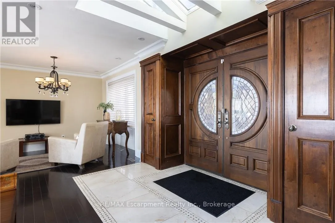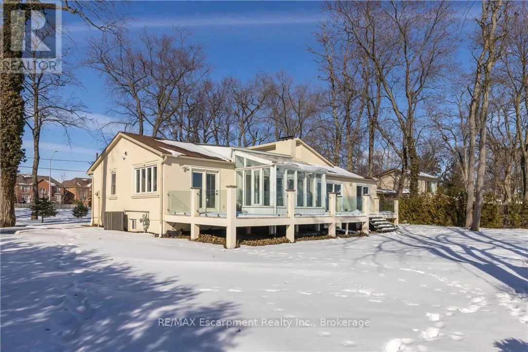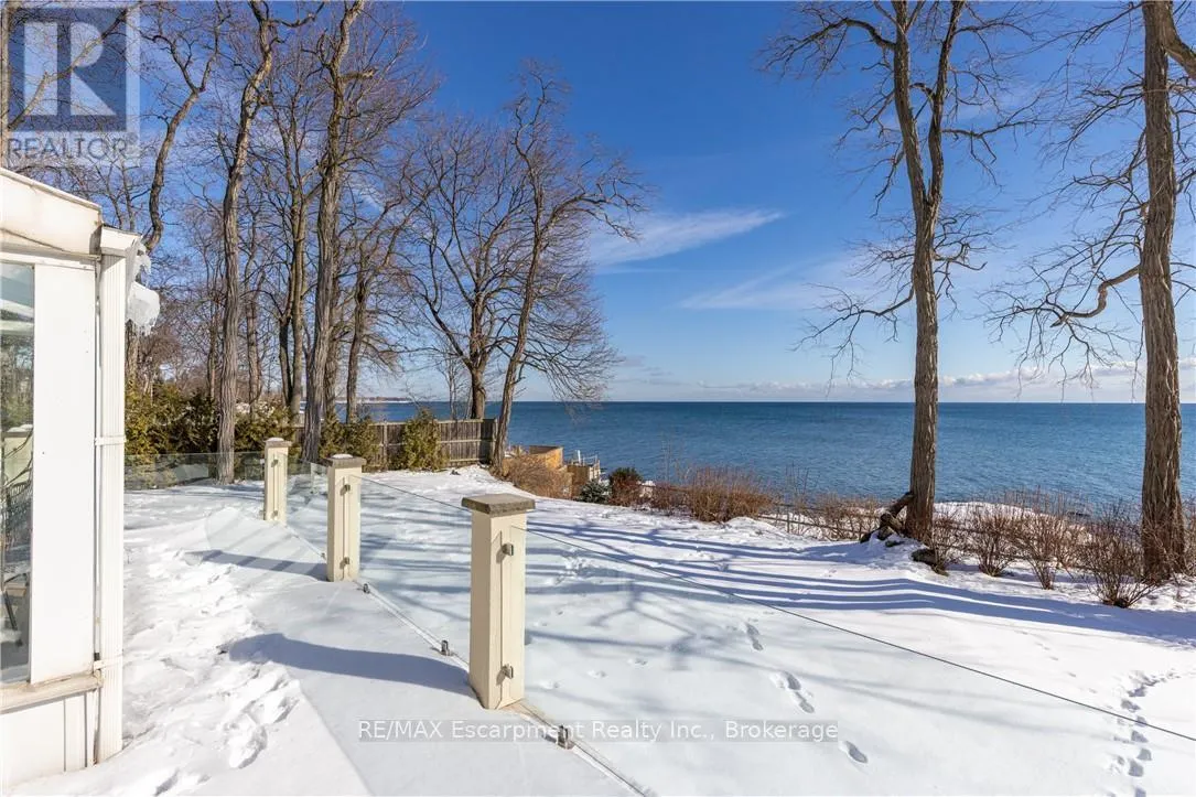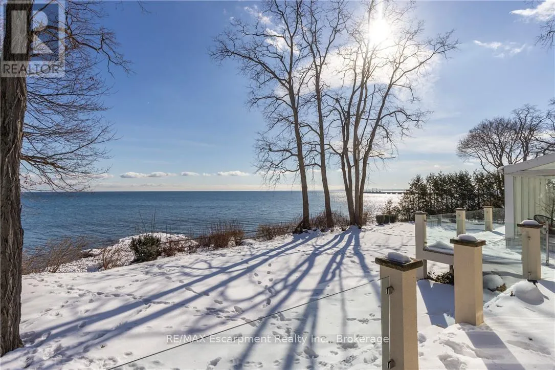 Lakeshore Rd W & Great Lakes Blvd **Stunning Waterfront Living on Lake Ontario**. Nestled along the shores of Lake Ontario with approximately 100 feet of lake frontage, this exceptional 4+1 bedroom, 3+1 bathroom residence offers an unparalleled lifestyle. A tree-lined driveway welcomes you to this tranquil retreat, where grand entry doors open to a light-filled interior accentuated by expansive windows and skylights throughout. The open-concept Living Room showcases remarkable architectural detail in the skylights, highlighted by a double-sided wood-burning fireplace shared with the breakfast area and kitchen. The spectacular custom kitchen features granite countertops, premium appliances, and a walkout to the sunroom-all commanding unobstructed lake views. The separate dining area is perfect for a more formal evening with family and friends. The principal bedroom provides a five-piece ensuite, walk-in closet, and direct walkout to the backyard overlooking the water. The second bedroom offers deck access with stunning lake vistas, while a versatile third bedroom and loft-level fourth bedroom complete the main living spaces. The finished lower level encompasses a family room, recreation area with wood stove, additional bedroom, laundry, and two-piece bath. This unique property delivers breathtaking waterfront views without the added expense of maintaining a seawall. Conveniently located near Shell Park, the waterfront trail, Burloak Waterfront Park, and Appleby GO Station, this residence represents an extraordinary opportunity for discerning buyers. LUXURY CERTIFIED (id:27476)