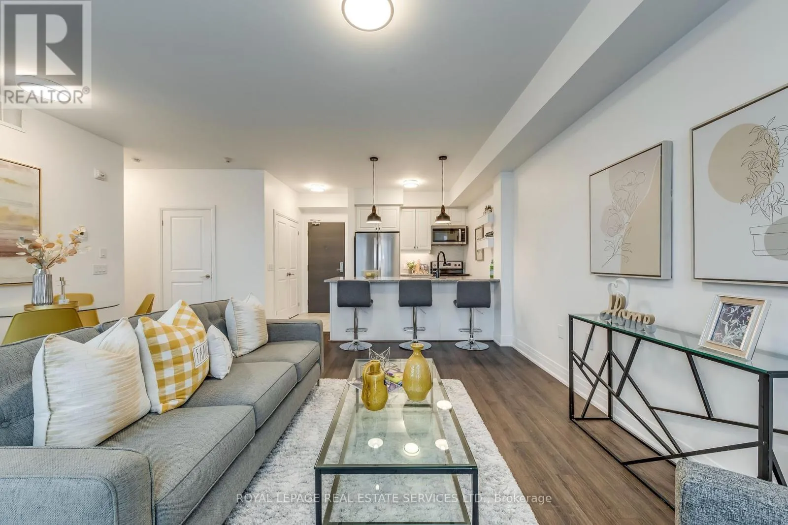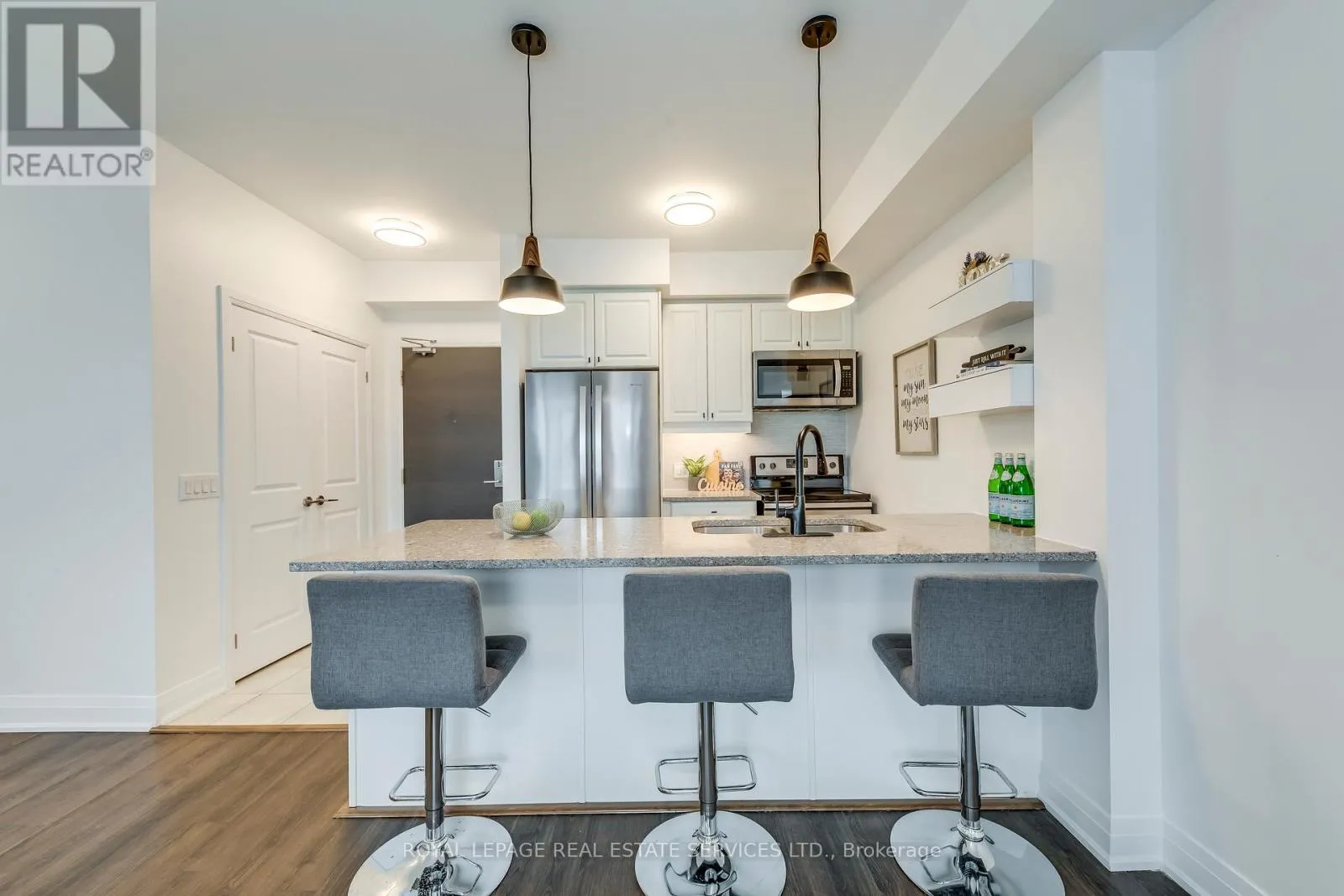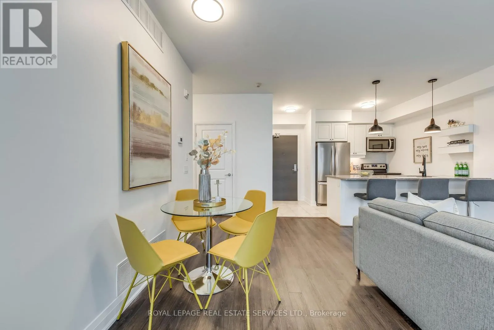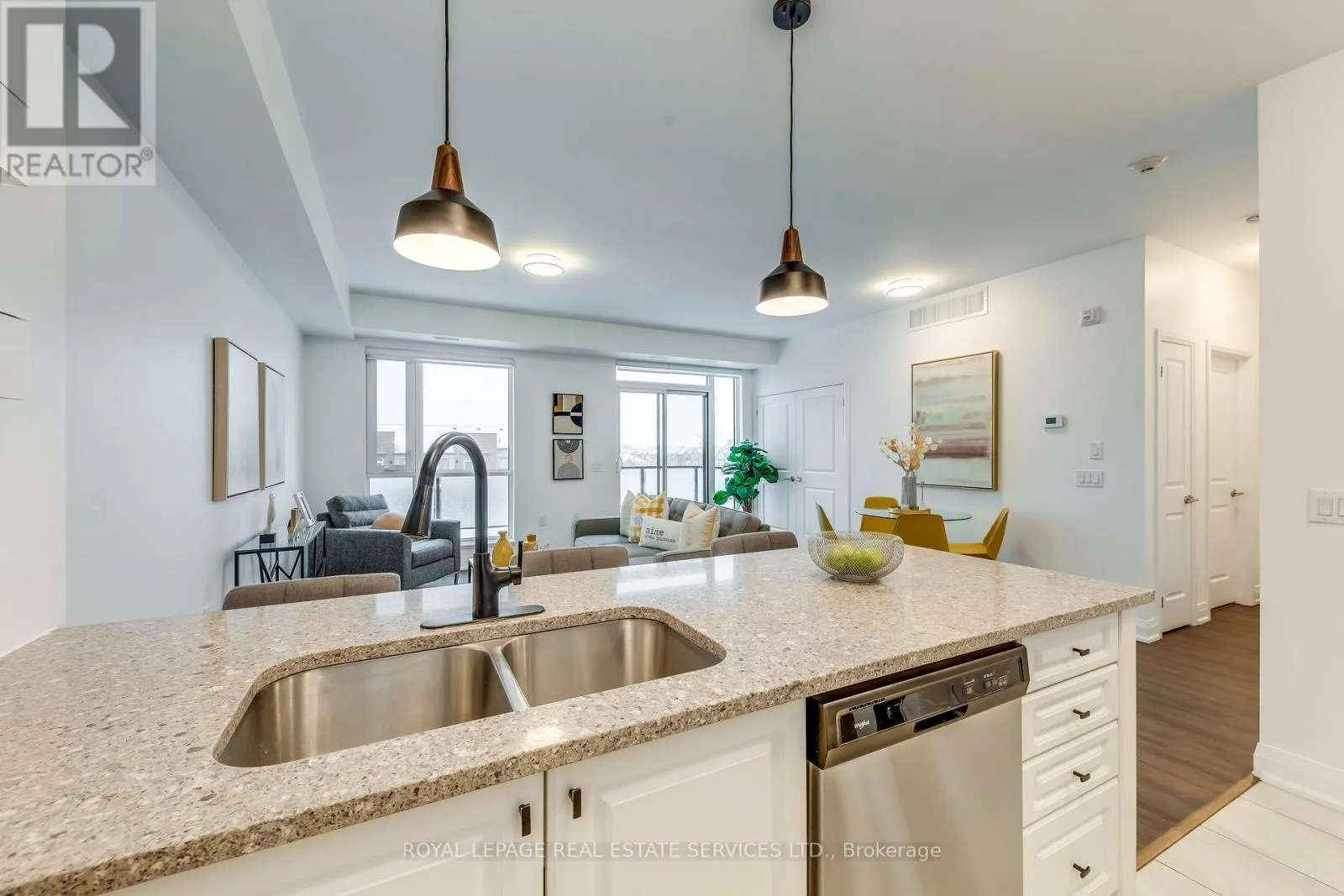 Dundas & Bronte Welcome to this beautifully upgraded top-corner stacked townhome offering abundant natural light and clear southwest views. Featuring 2 bedrooms and 2 full bathrooms, this well-designed layout provides both comfort and functionality. The open-concept living and dining area flows seamlessly into a modern kitchen complete with quartz countertops, stainless steel appliances, and a breakfast bar - perfect for everyday living and entertaining. Dark laminate flooring runs throughout the home, adding warmth and elegance. The primary bedroom includes a private 3-piece ensuite, while the second full bathroom features a bathtub and serves the spacious second bedroom. Enjoy oversized windows that fill the home with natural light all day long. Step outside to your large private balcony/terrace with gas hook-up - ideal for BBQs and relaxing while taking in beautiful sunset views. Includes 2 parking spaces (attached garage + driveway) and a rare, very large locker within the unit, providing exceptional storage convenience. Conveniently located in a sought-after school zone, just steps to public transit, Oakville Trafalgar Memorial Hospital, and with quick access to major highways.A fantastic opportunity for first-time buyers, downsizers, or investors! (id:27476)