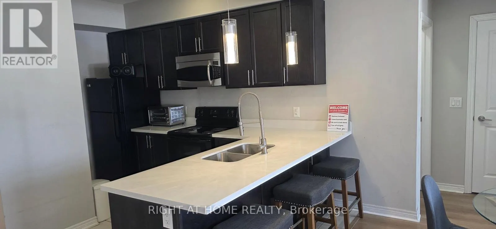 Trafalgar / Dundas Top-floor corner unit offering exceptional privacy, unobstructed views, and modern upgrades in the heart of Oakville's Uptown Core. This bright 2-bed, 2-bath layout features a primary bedroom with a spacious ensuite, walk-in shower, and large walk-in closet. Brand-new engineered hardwood flooring throughout, plus a contemporary kitchen with Frigidaire appliances, white quartz countertops, and range microwave. Enjoy a generous balcony with BBQ, perfect for outdoor dining. Includes a private garage with 1 parking space, an attached oversized storage room, and an additional driveway parking spot. Steps to restaurants, shops, Walmart, Superstore, and transit, with quick access to major highways. A rare combination of location, privacy, and modern living. (id:27476)