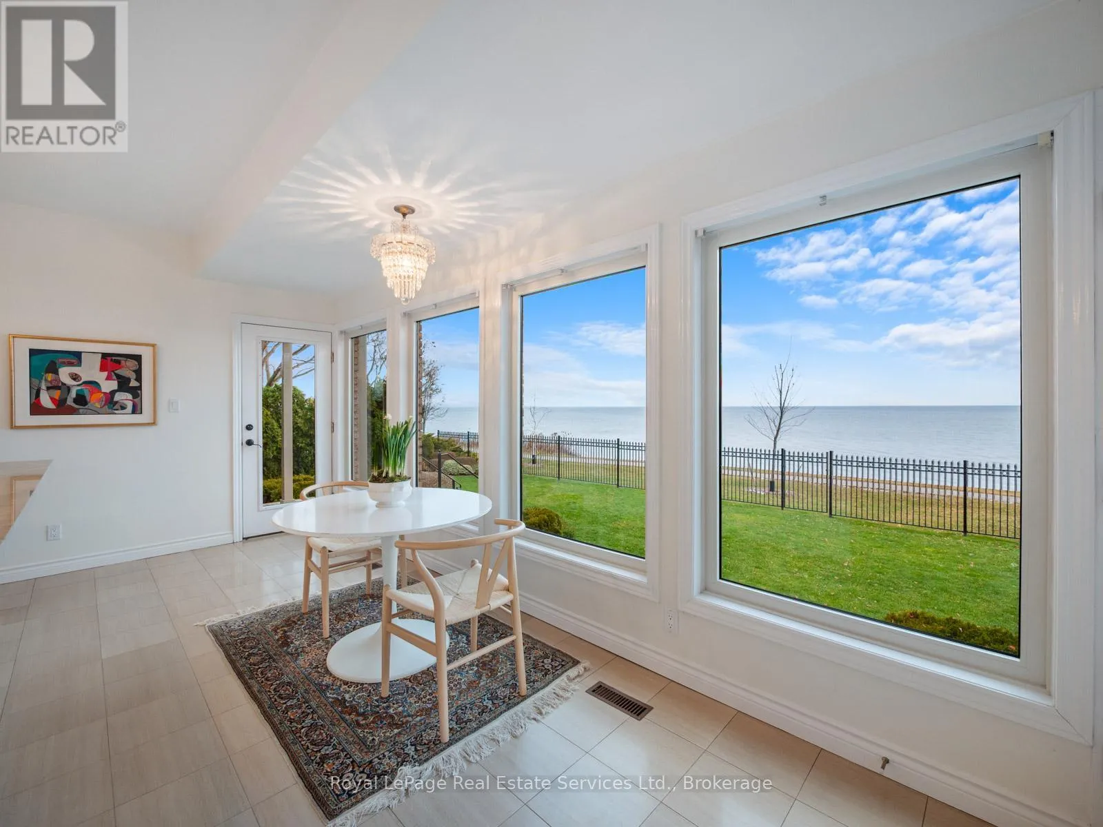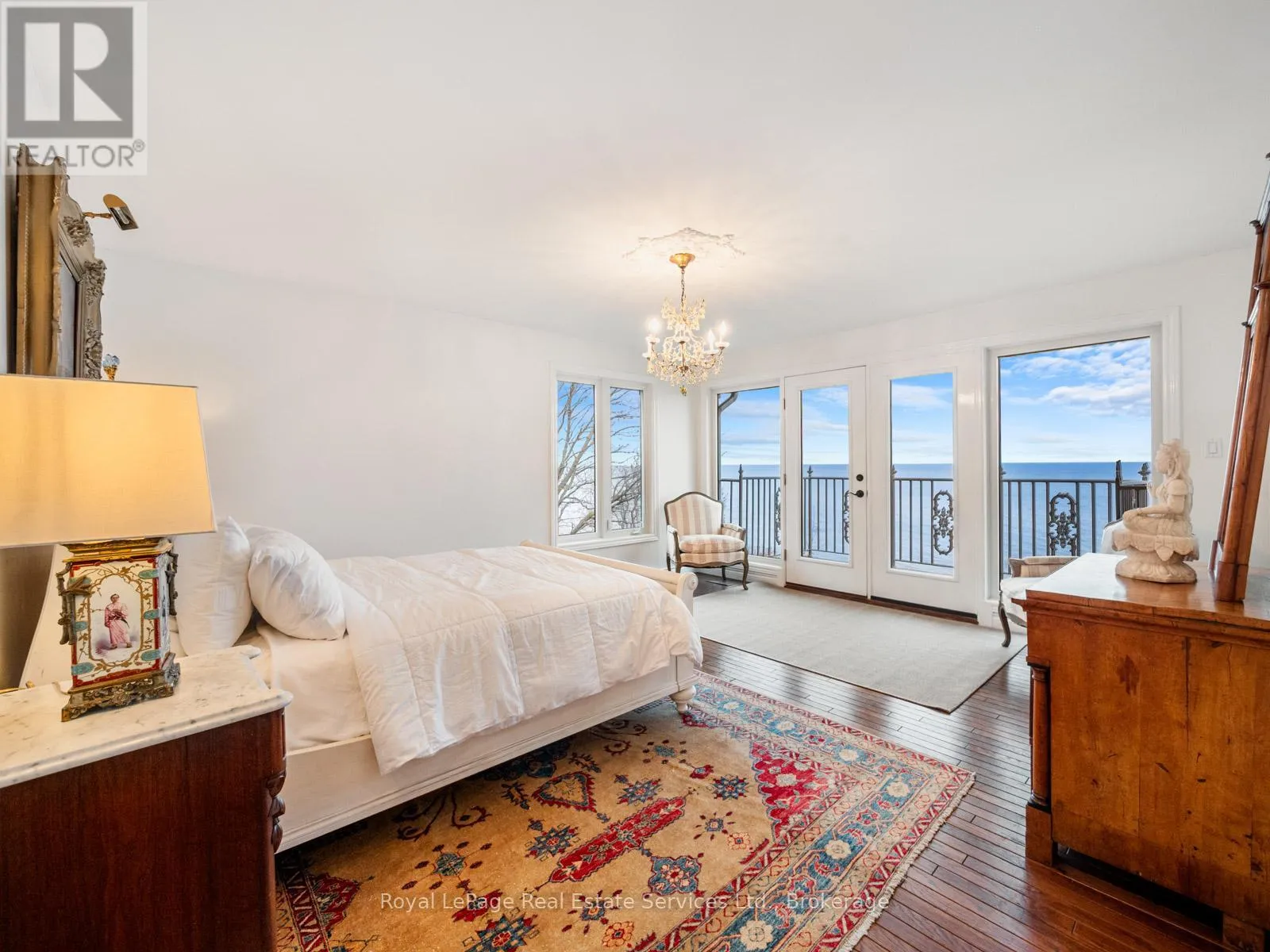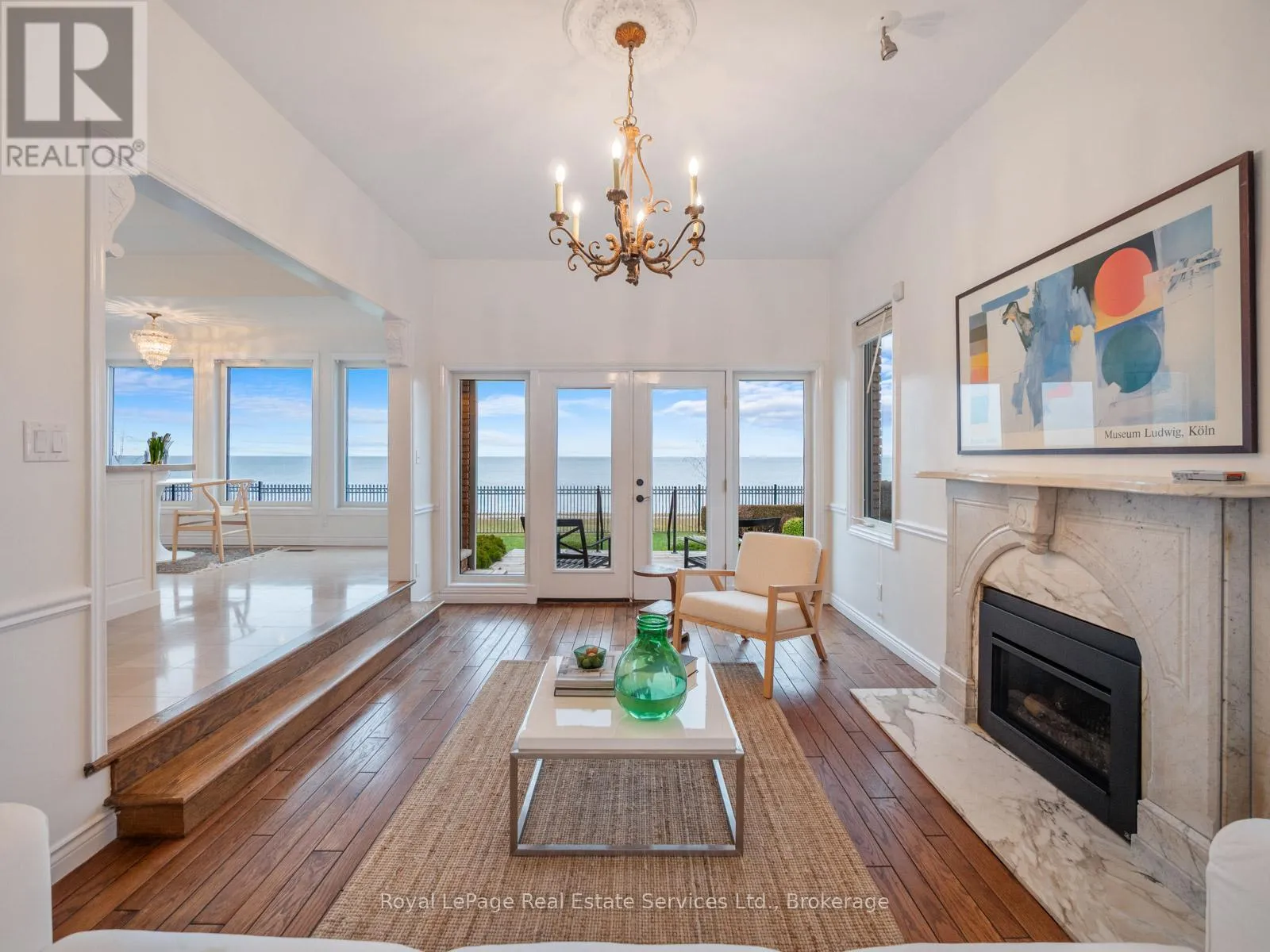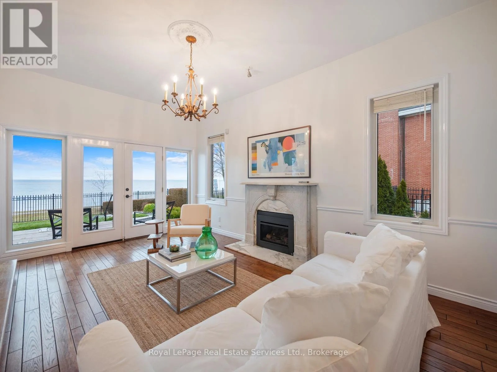 Lakeshore Road W to Shelburne Pl. Spectacular lakefront property with 93' frontage on Lake Ontario. Located on a quiet, mature cul-de-sac, this custom built, family home offers 4+1 Bedrooms, 3.5 Baths with over 2800SF above-grade + 1400 SF Finished Lower Level. Architecturally designed with wall-to-wall windows overlooking the lake, solid brick construction with clay tile roofing, this home was built to last. 9 and 10 ceilings on the main floor. Oak hardwood floors throughout both levels. Grand entrance foyer with oak staircase. Beautiful Living Room with fabulous antique marble fireplace surround with gas insert open to Dining Room with wall to wall patio doors to the terrace with incredible lake views. Fabulous Kitchen/Breakfast Room is a blank canvas with the perfect space to install the waterfront Kitchen of your dreams. Walk-outs to both decks and open to the the Family Room with stunning marble fireplace with gas insert. The main floor features a mudroom with side entry and inside entry from full-sized two-car garage. The Primary suite features oversized windows and a walk-out to second floor balcony with outstanding lake views, luxury ensuite bathroom and walk-in closet. Two more Bedrooms overlook the lake with oversized windows. The front Bedroom opens to a bonus room above the garage which could be handy as a Den or quiet retreat. The Lower Level has excellent ceilings height, good windows and features 1Bedroom, 3-Piece Bathroom, Recreation Room, Den, Laundry Room, storage and more. Beautifully landscaped and maintained property fully fenced with wrought iron gate access to the lake. Cobblestone driveway accommodates 4 cars. Outstanding value on Lake Ontario. A must see (id:27476)