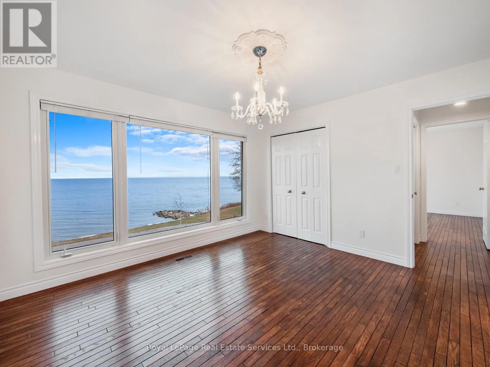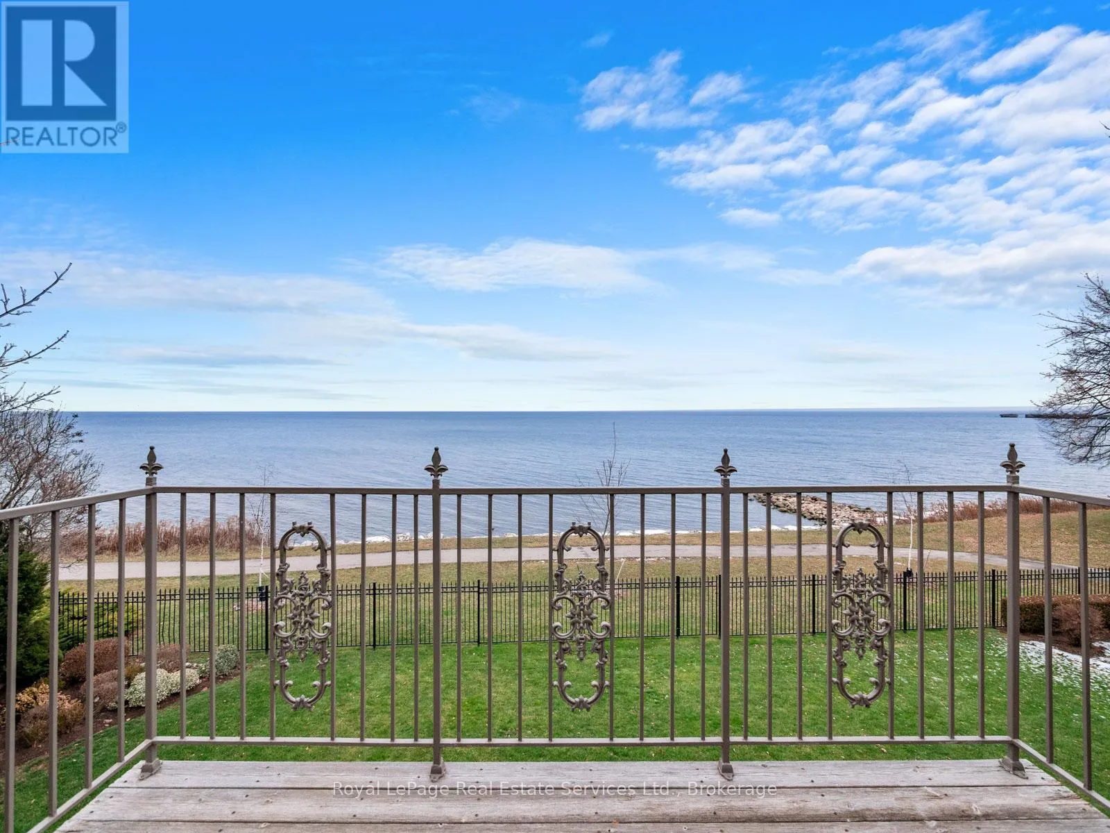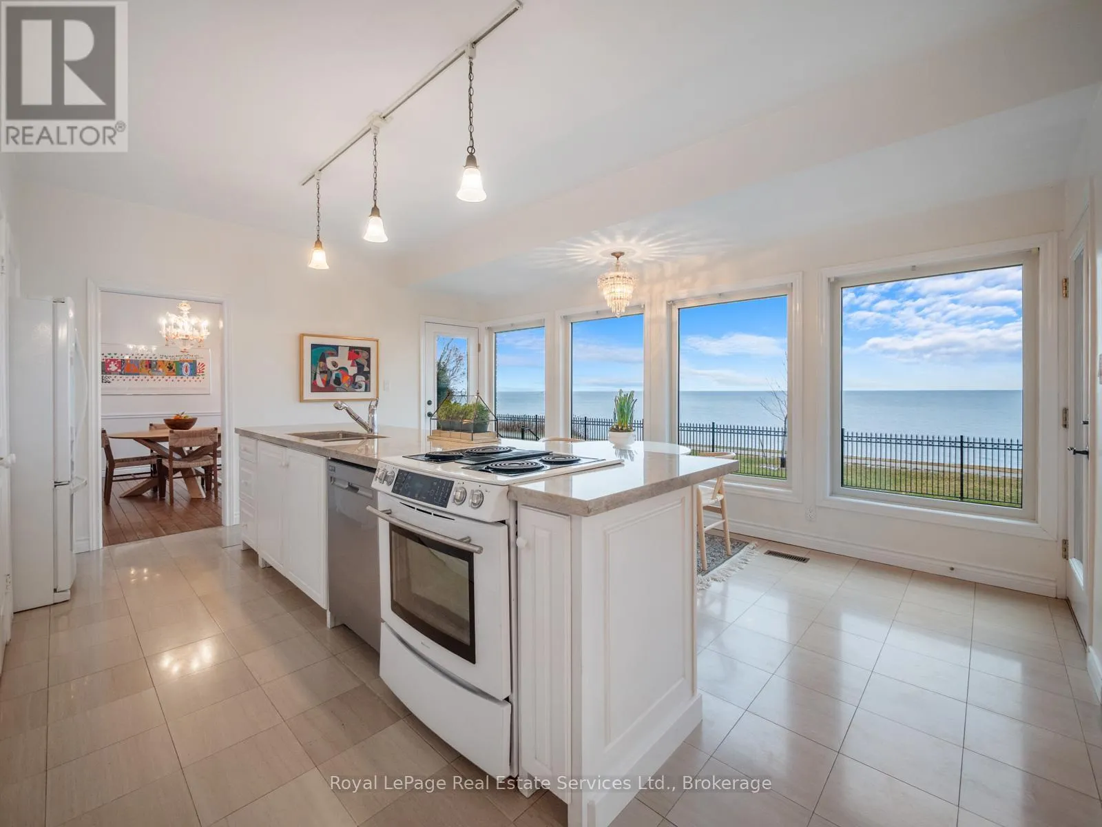 Lakeshore Road W to Shelburne Pl. Spectacular lakefront property with 93' frontage on Lake Ontario. Located on a quiet, mature cul-de-sac, this custom built, family home offers 4+1 Bedrooms, 3.5 Baths with over 2800SF above-grade + 1400 SF Finished Lower Level. Architecturally designed with wall-to-wall windows overlooking the lake, solid brick construction with clay tile roofing, this home was built to last. 9 and 10 ceilings on the main floor. Oak hardwood floors throughout both levels. Grand entrance foyer with oak staircase. Beautiful Living Room with fabulous antique marble fireplace surround with gas insert open to Dining Room with wall to wall patio doors to the terrace with incredible lake views. Fabulous Kitchen/Breakfast Room is a blank canvas with the perfect space to install the waterfront Kitchen of your dreams. Walk-outs to both decks and open to the the Family Room with stunning marble fireplace with gas insert. The main floor features a mudroom with side entry and inside entry from full-sized two-car garage. The Primary suite features oversized windows and a walk-out to second floor balcony with outstanding lake views, luxury ensuite bathroom and walk-in closet. Two more Bedrooms overlook the lake with oversized windows. The front Bedroom opens to a bonus room above the garage which could be handy as a Den or quiet retreat. The Lower Level has excellent ceilings height, good windows and features 1Bedroom, 3-Piece Bathroom, Recreation Room, Den, Laundry Room, storage and more. Beautifully landscaped and maintained property fully fenced with wrought iron gate access to the lake. Cobblestone driveway accommodates 4 cars. Outstanding value on Lake Ontario. A must see (id:27476)