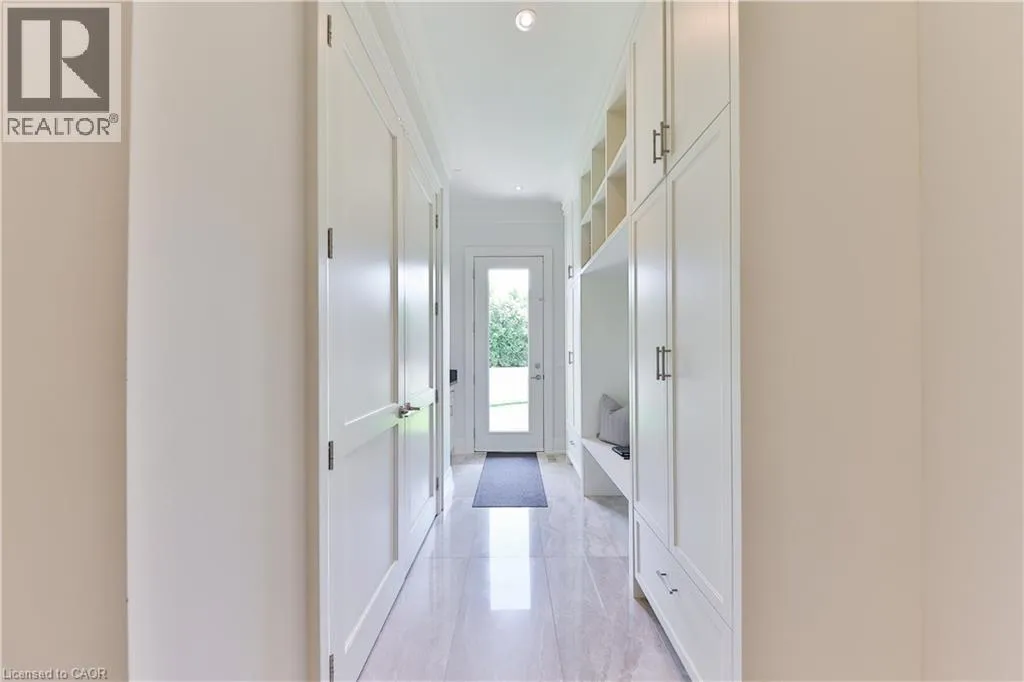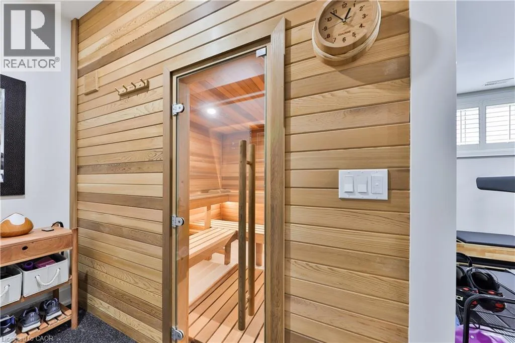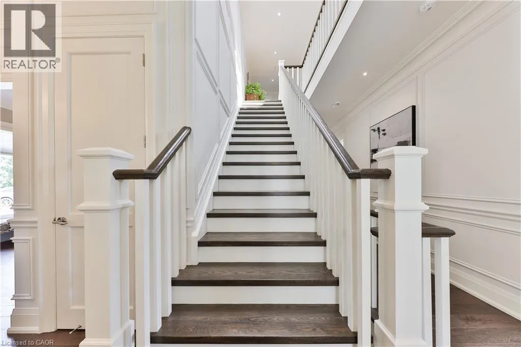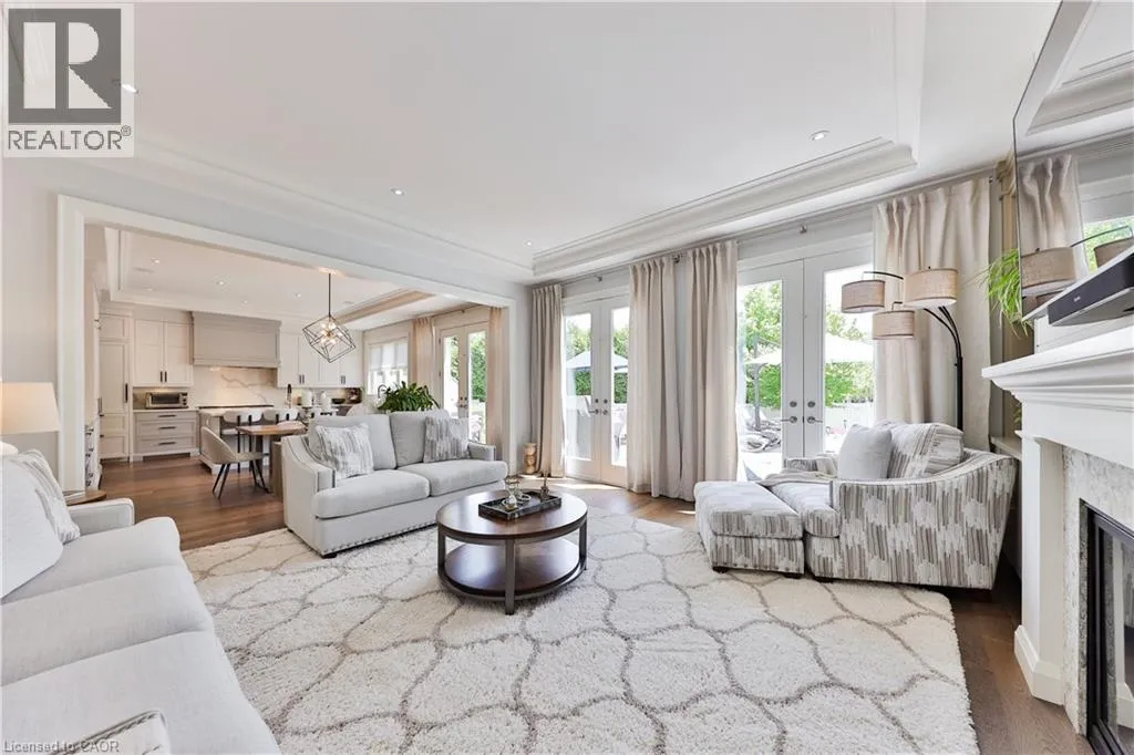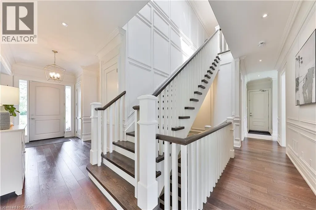 West of 3rd at Tansley A landmark custom residence of exceptional scale and architectural presence, gracefully set back on a quiet West Oakville crescent just 2 km to the lake and a short walk to Bronte Village. Its beautifully composed façade creates striking curb appeal, while coveted south facing rear exposure floods the home with natural light from morning through sunset, offering over 6,100 sq. ft. of refined, open living space. Built in 2018 and impeccably maintained, the home presents as pristine inside and out. Wide plank hardwood flooring flows throughout, while extensive custom millwork adds architectural depth. At its heart, the open concept kitchen, breakfast area, and family room span the rear of the home, framed by expansive windows and French doors overlooking the private gardens. A well appointed mudroom with rear access and adjoining powder room adds convenience, ideal for poolside living. The result is a bright, airy space designed for entertaining and comfortable family life. Beyond the main living area, the level includes a formal dining room, sitting room, and private office, offering flexibility and separation. Upstairs, the primary suite is a serene retreat with a spa inspired ensuite and generous dressing area. Three additional bedrooms are served by a spacious second floor laundry room. The finished lower level offers recreation space with wet bar, gym, sauna, additional bedroom, and full bath, ideal for guests or multigenerational living. Outdoors, south facing gardens enjoy uninterrupted sunlight. Premium composite decking, a heated saltwater pool with waterfall, tiered lounging areas, mature hedging, ambient lighting, and multi zone in ground irrigation create a private setting for long summer evenings. A true double garage with tandem depth accommodates two SUVs plus a third vehicle or substantial storage. (id:27476)