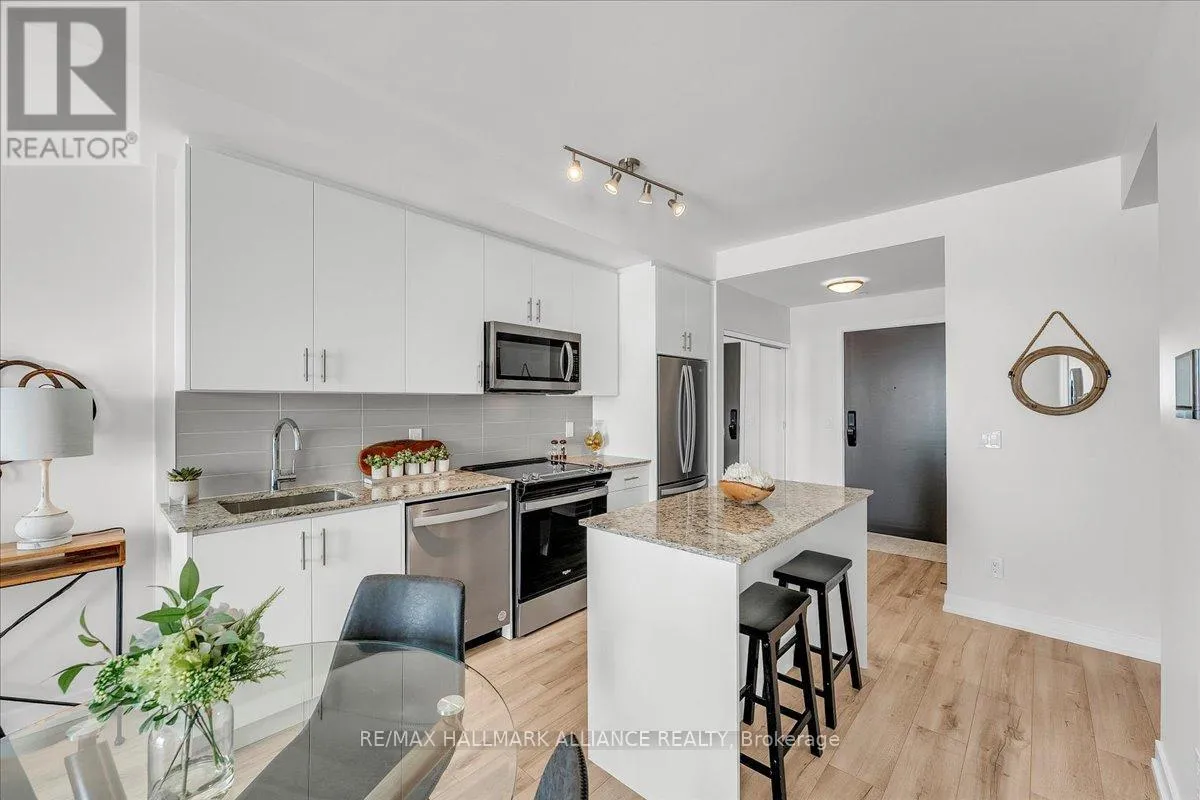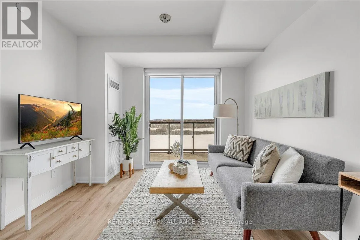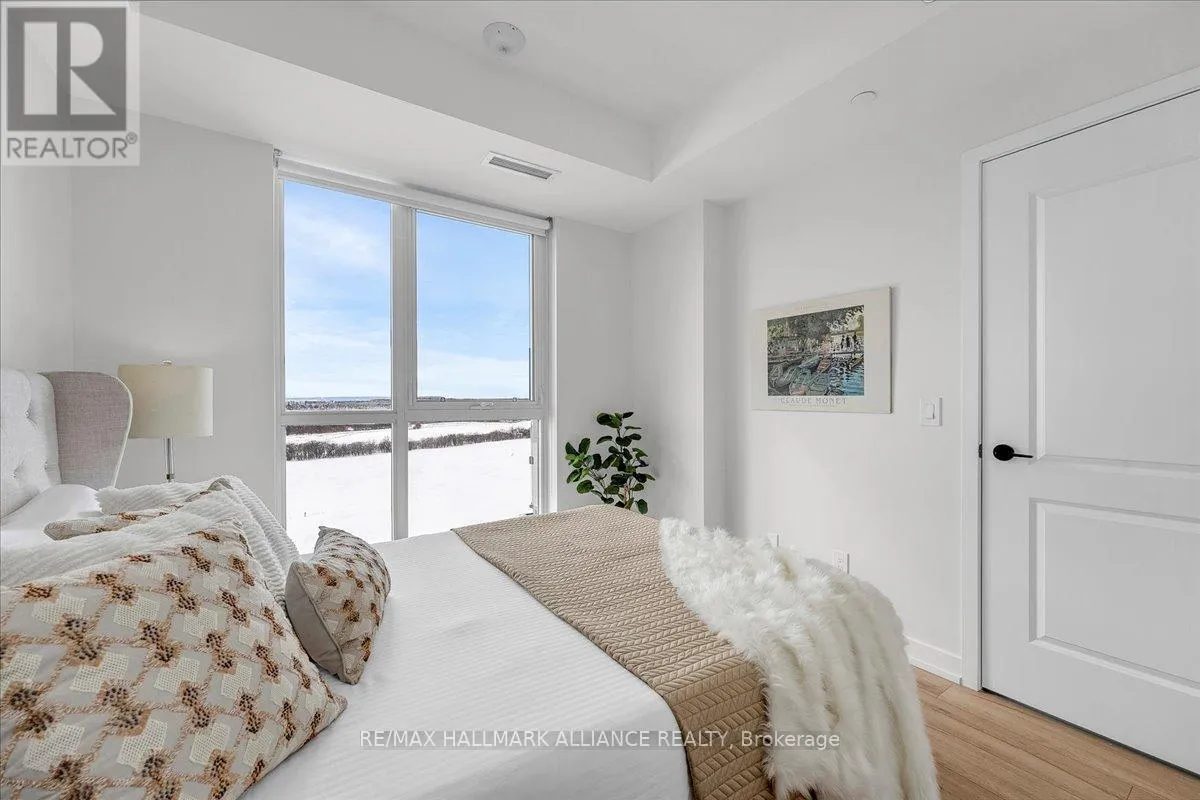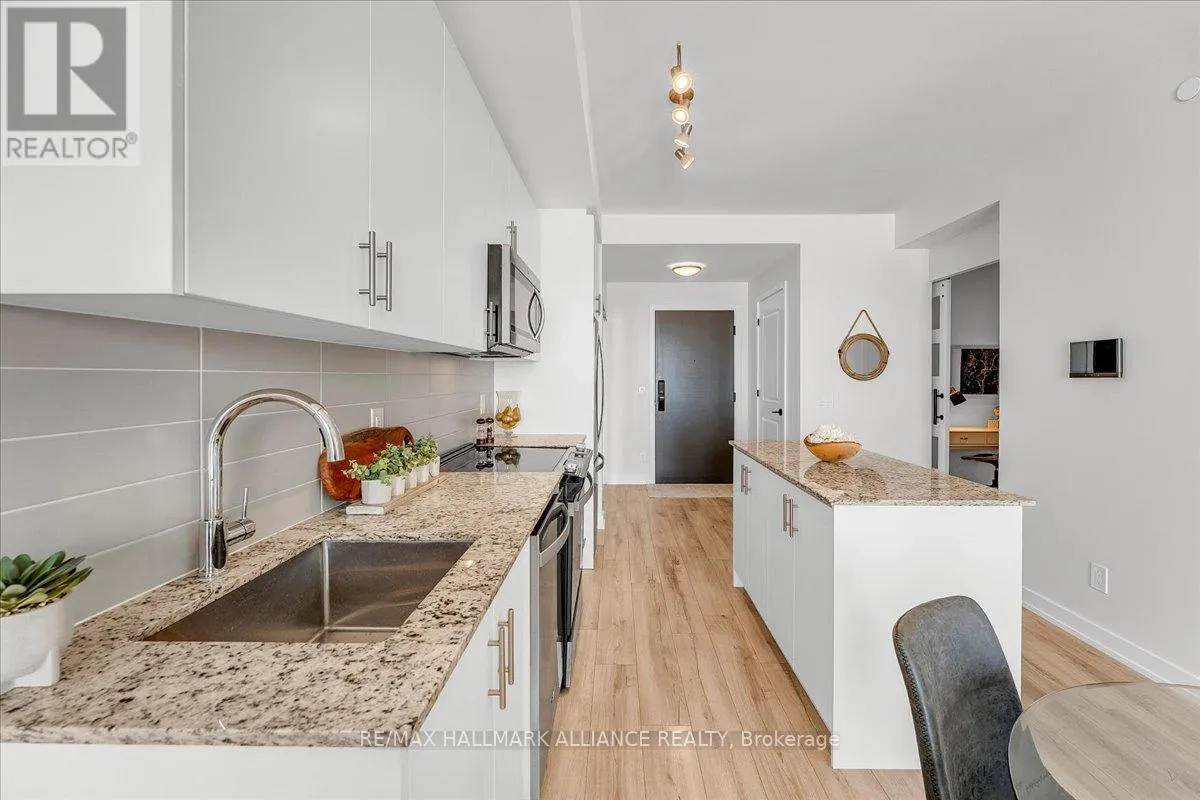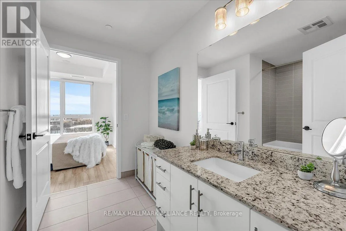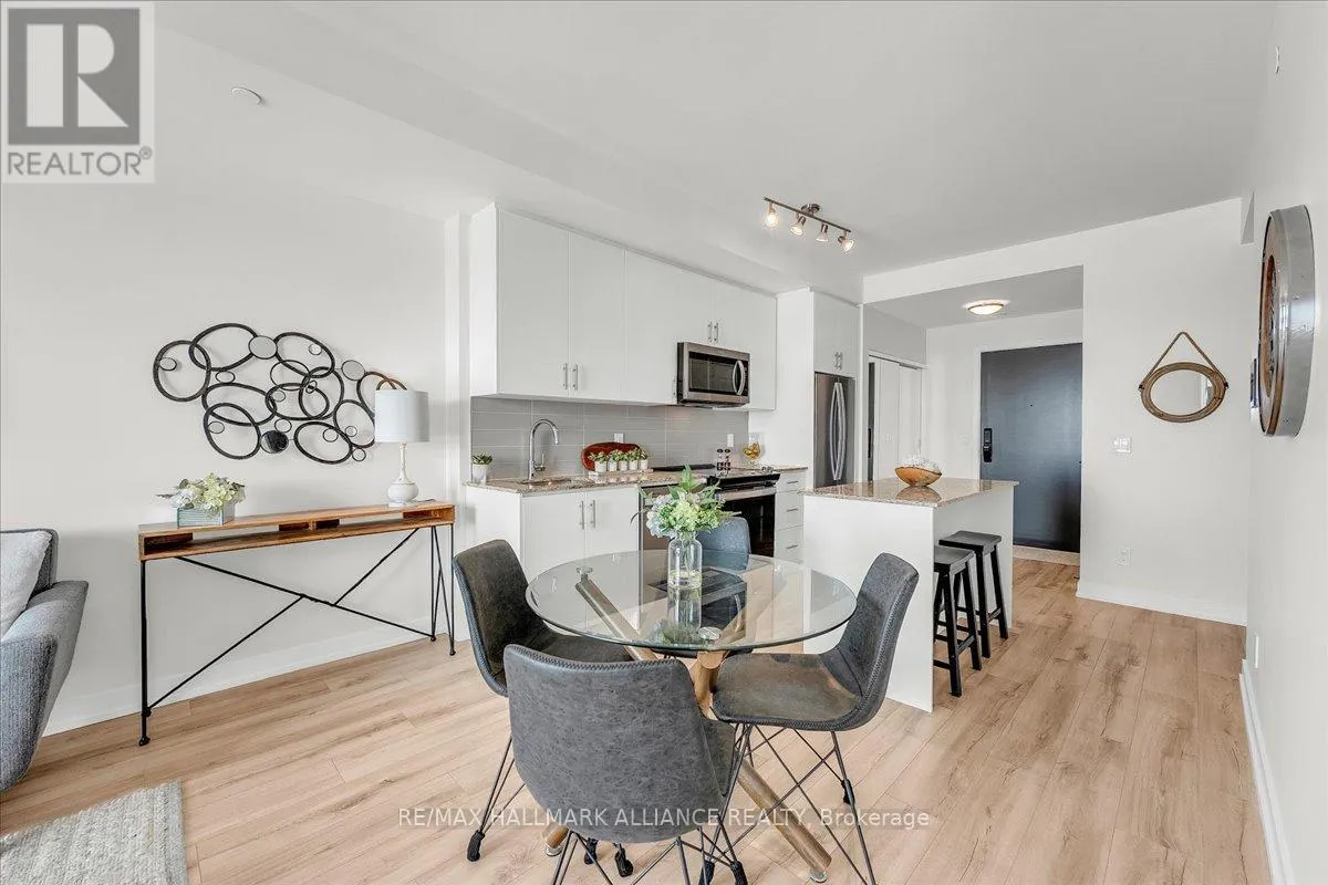 Cross Streets: Trafalgar & Dundas. ** Directions: Off Trafalgar, north of Dundas. Countryside & water views await in this gorgeous, newly upgraded residence, the LARGEST 1+Den suite in the building, offering an expansive, functional *accessible* layout with 34" doors that lives like a true 2-bdrm. Set on a higher floor with unobstructed panoramic views, this rare offering boasts almost 700 sqft of beautifully upgraded interior space plus a 55 sqft sun-soaked balcony (745 sqft total). Enjoy breathtaking Niagara Escarpment sunsets, tranquil greenspace, southern water views, & sweeping vistas over Oakville from home. Flooded with natural light through floor-to-ceiling windows and complemented by 9 ft ceilings, the open-concept living, dining & kitchen area exudes warmth and modern style. The white kitchen features a breakfast island with bar seating, quartz countertops, designer backsplash, soft-close cabinetry, built-in microwave & stainless-steel appliances, ideal for daily living and entertaining. Rare for a 1+Den, this suite fits a full dining and living room setup in addition to island seating, creating excellent flow for hosting and family meals. Luxurious flooring, decorative fixtures & upgraded window coverings, including blackout treatments in the primary and light-filtering shades in living areas, enhance comfort throughout. The queen-sized primary offers stunning views, an oversized walk-in closet with organization & semi-ensuite access to the upgraded oversized bath. The generous den (10'3" x 8'6"), the largest in the building, includes a custom sliding barn door & semi-ensuite access, perfect as a home office, guest suite, or easily converted 2nd bdrm. Located in luxurious Oakvillage by Minto, enjoy premium amenities: gym, party room & rooftop terrace with BBQs & skyline water views. Steps to restaurants, shops, Walmart, Superstore, Longo's, Starbucks, banks, parks, trails, top-ranked schools & transit; minutes to Highways 403/407 & GO. A rare opportunity to own one of the building's best layouts with exceptional views, it's a must-s (id:27476)