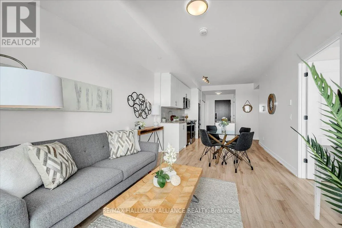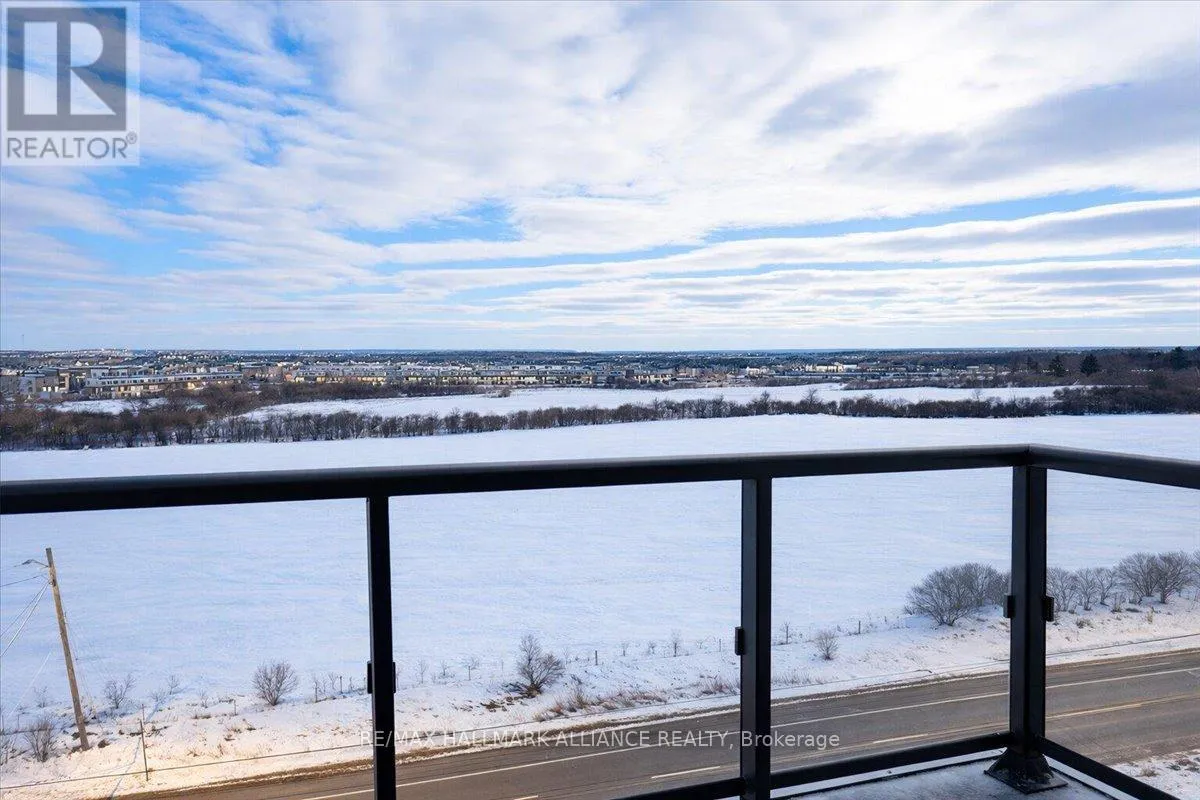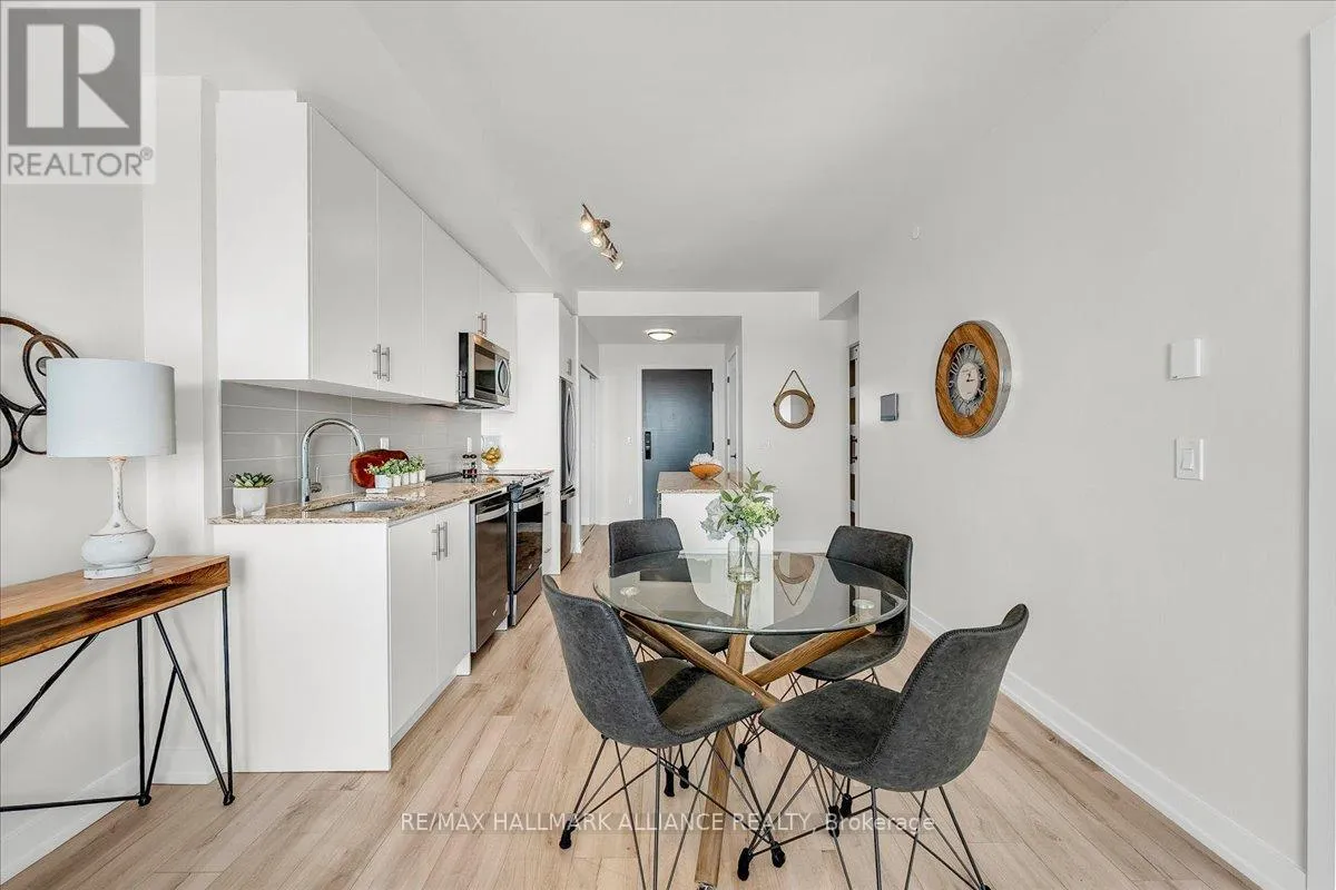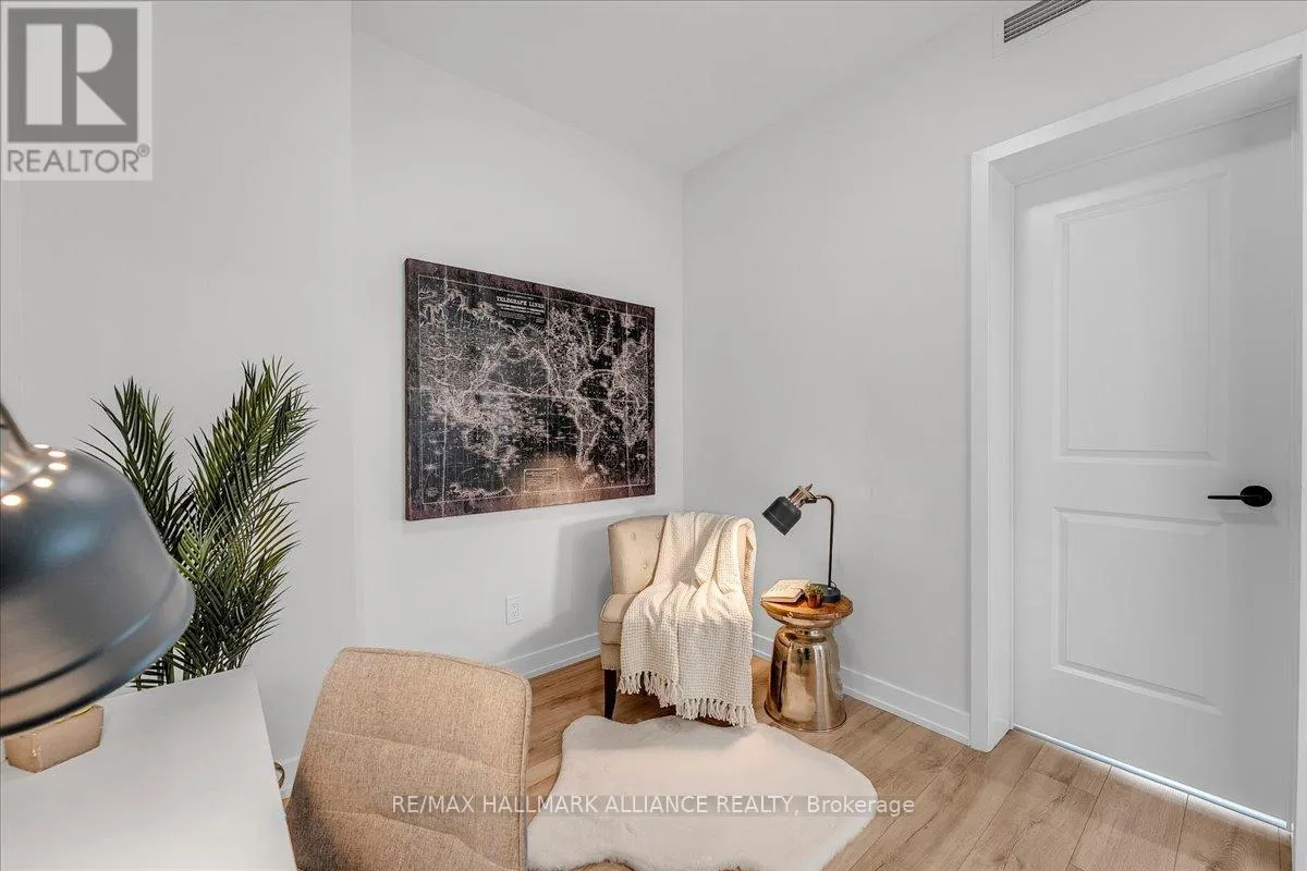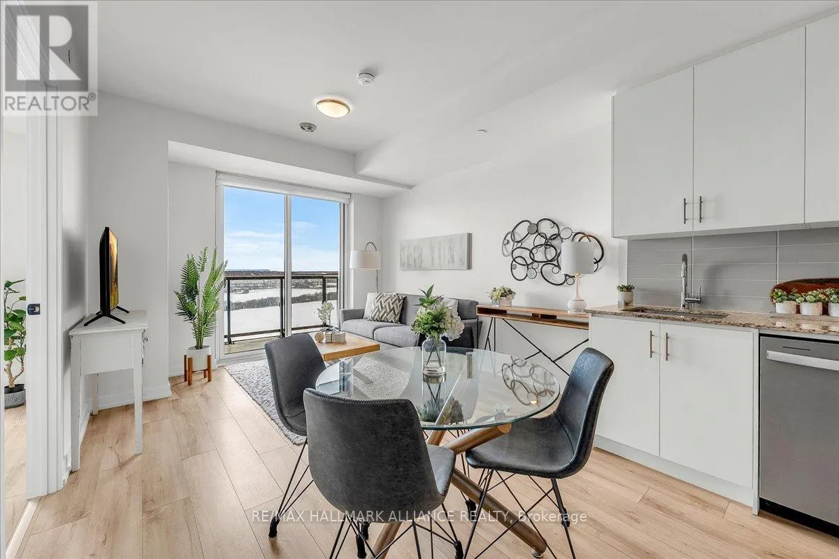 Cross Streets: Trafalgar & Dundas. ** Directions: Off Trafalgar, north of Dundas. Countryside & water views await in this gorgeous, newly upgraded residence, the LARGEST 1+Den suite in the building, offering an expansive, functional *accessible* layout with 34" doors that lives like a true 2-bdrm. Set on a higher floor with unobstructed panoramic views, this rare offering boasts almost 700 sqft of beautifully upgraded interior space plus a 55 sqft sun-soaked balcony (745 sqft total). Enjoy breathtaking Niagara Escarpment sunsets, tranquil greenspace, southern water views, & sweeping vistas over Oakville from home. Flooded with natural light through floor-to-ceiling windows and complemented by 9 ft ceilings, the open-concept living, dining & kitchen area exudes warmth and modern style. The white kitchen features a breakfast island with bar seating, quartz countertops, designer backsplash, soft-close cabinetry, built-in microwave & stainless-steel appliances, ideal for daily living and entertaining. Rare for a 1+Den, this suite fits a full dining and living room setup in addition to island seating, creating excellent flow for hosting and family meals. Luxurious flooring, decorative fixtures & upgraded window coverings, including blackout treatments in the primary and light-filtering shades in living areas, enhance comfort throughout. The queen-sized primary offers stunning views, an oversized walk-in closet with organization & semi-ensuite access to the upgraded oversized bath. The generous den (10'3" x 8'6"), the largest in the building, includes a custom sliding barn door & semi-ensuite access, perfect as a home office, guest suite, or easily converted 2nd bdrm. Located in luxurious Oakvillage by Minto, enjoy premium amenities: gym, party room & rooftop terrace with BBQs & skyline water views. Steps to restaurants, shops, Walmart, Superstore, Longo's, Starbucks, banks, parks, trails, top-ranked schools & transit; minutes to Highways 403/407 & GO. A rare opportunity to own one of the building's best layouts with exceptional views, it's a must-s (id:27476)
