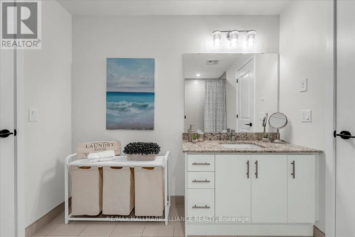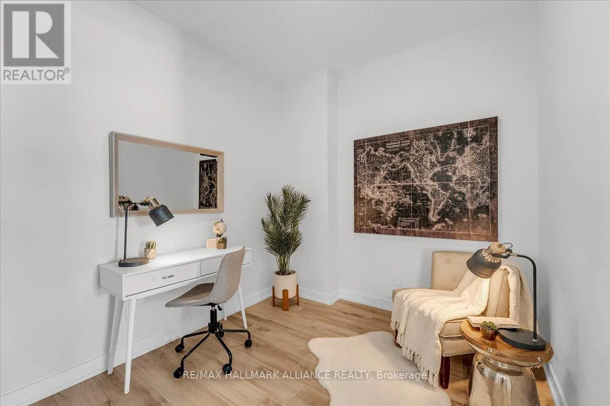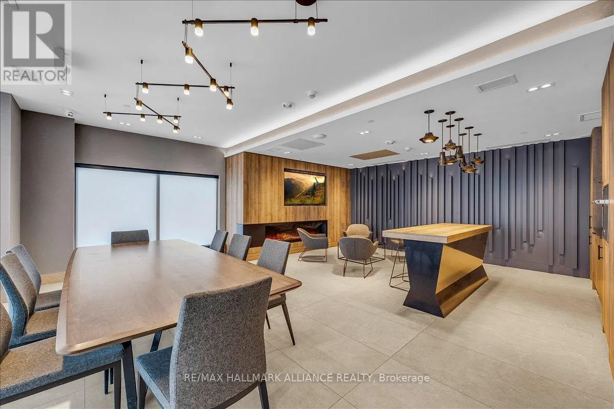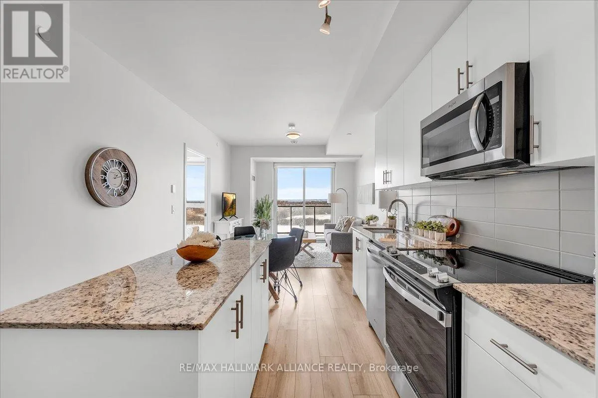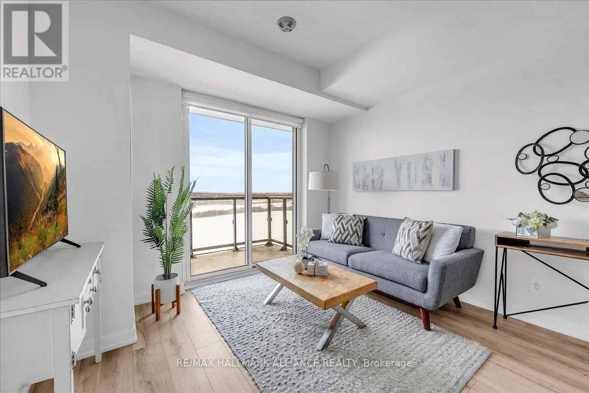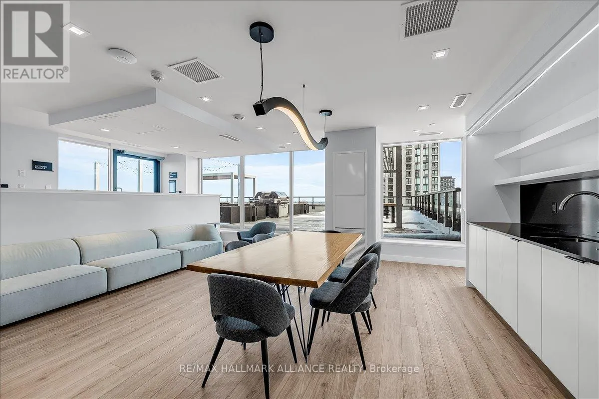 Cross Streets: Trafalgar & Dundas. ** Directions: Off Trafalgar, north of Dundas. Countryside & water views await in this gorgeous, newly upgraded residence, the LARGEST 1+Den suite in the building, offering an expansive, functional *accessible* layout with 34" doors that lives like a true 2-bdrm. Set on a higher floor with unobstructed panoramic views, this rare offering boasts almost 700 sqft of beautifully upgraded interior space plus a 55 sqft sun-soaked balcony (745 sqft total). Enjoy breathtaking Niagara Escarpment sunsets, tranquil greenspace, southern water views, & sweeping vistas over Oakville from home. Flooded with natural light through floor-to-ceiling windows and complemented by 9 ft ceilings, the open-concept living, dining & kitchen area exudes warmth and modern style. The white kitchen features a breakfast island with bar seating, quartz countertops, designer backsplash, soft-close cabinetry, built-in microwave & stainless-steel appliances, ideal for daily living and entertaining. Rare for a 1+Den, this suite fits a full dining and living room setup in addition to island seating, creating excellent flow for hosting and family meals. Luxurious flooring, decorative fixtures & upgraded window coverings, including blackout treatments in the primary and light-filtering shades in living areas, enhance comfort throughout. The queen-sized primary offers stunning views, an oversized walk-in closet with organization & semi-ensuite access to the upgraded oversized bath. The generous den (10'3" x 8'6"), the largest in the building, includes a custom sliding barn door & semi-ensuite access, perfect as a home office, guest suite, or easily converted 2nd bdrm. Located in luxurious Oakvillage by Minto, enjoy premium amenities: gym, party room & rooftop terrace with BBQs & skyline water views. Steps to restaurants, shops, Walmart, Superstore, Longo's, Starbucks, banks, parks, trails, top-ranked schools & transit; minutes to Highways 403/407 & GO. A rare opportunity to own one of the building's best layouts with exceptional views, it's a must-s (id:27476)