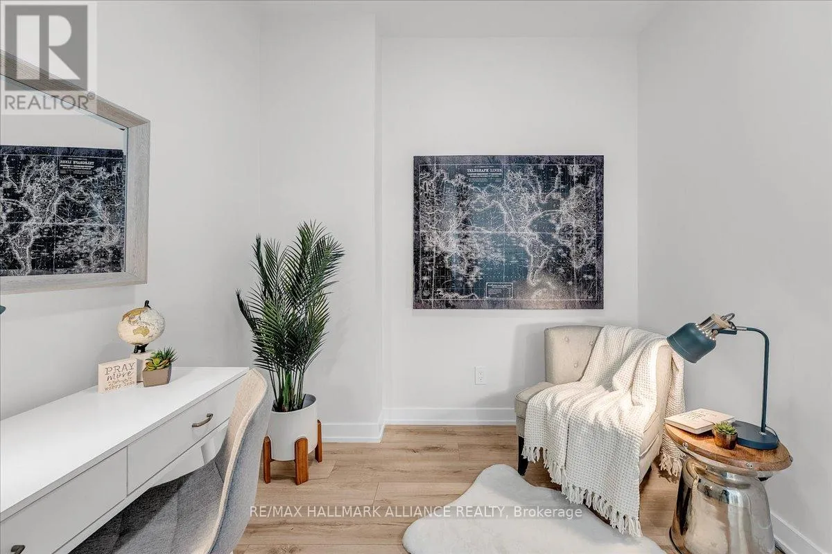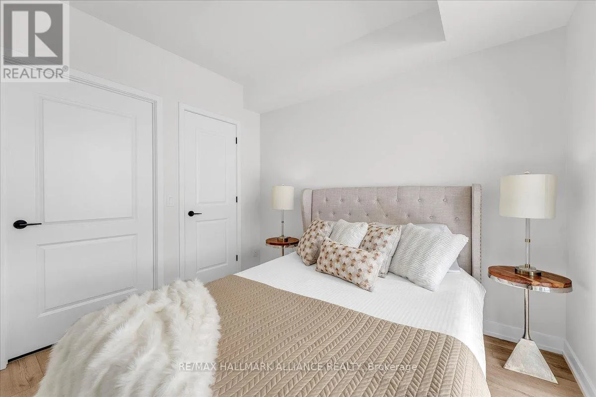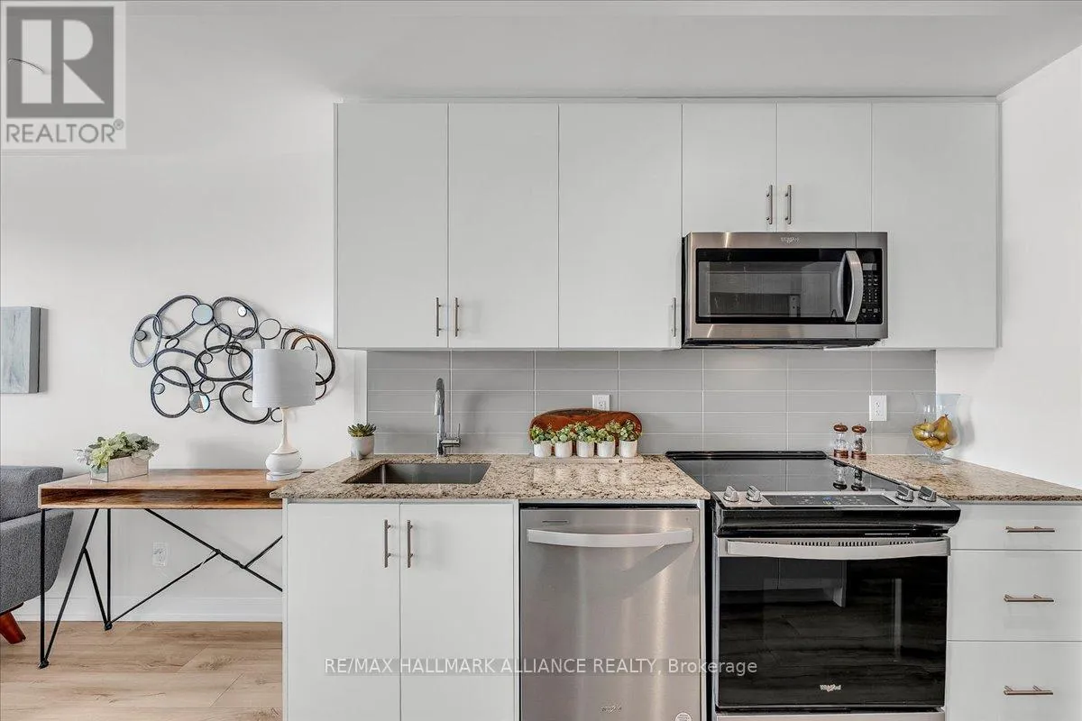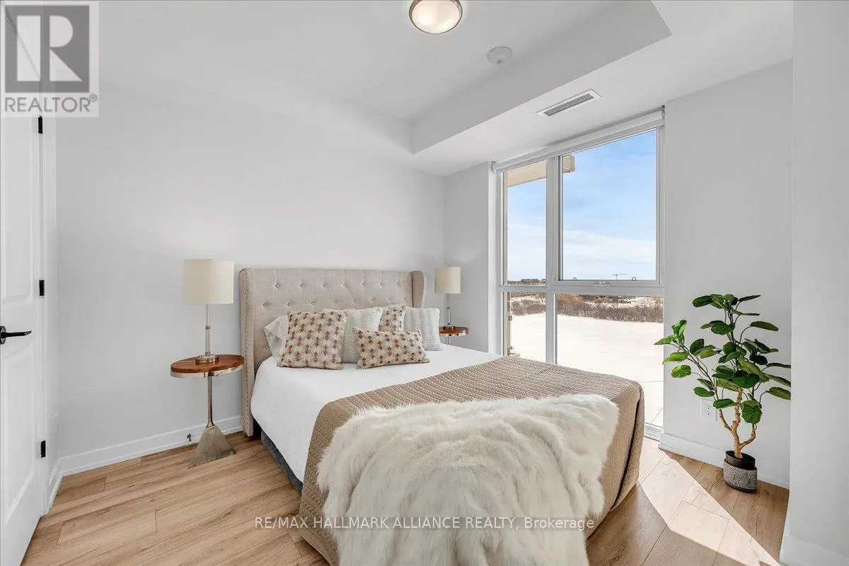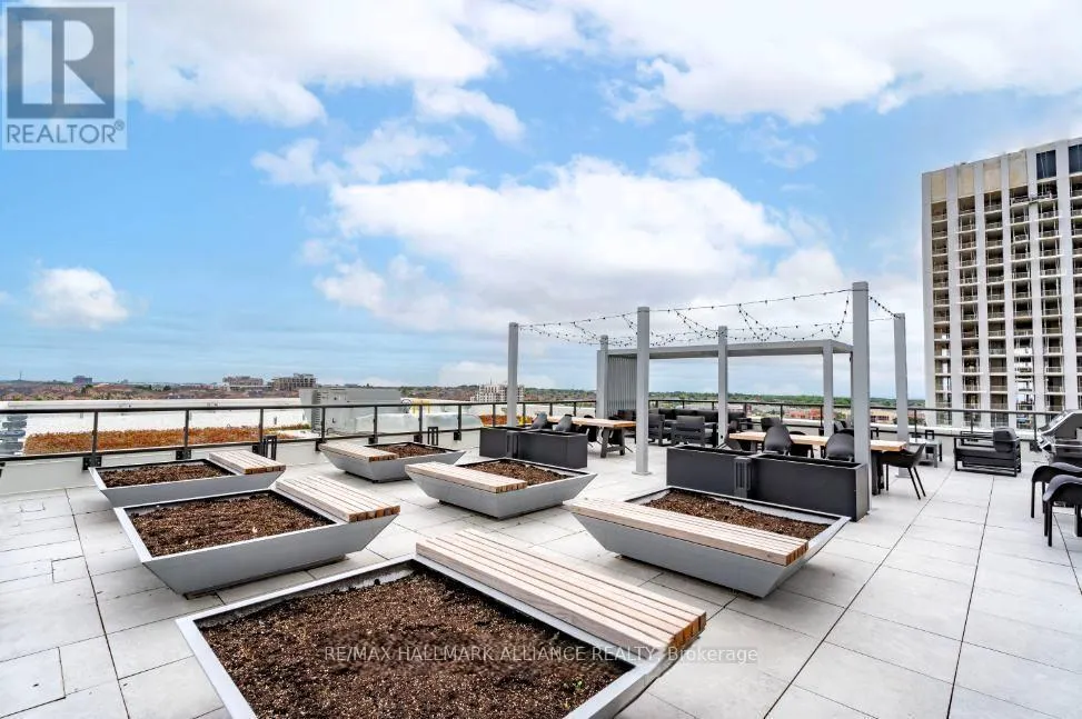 Cross Streets: Trafalgar & Dundas. ** Directions: Off Trafalgar, north of Dundas. Countryside & water views await in this gorgeous, newly upgraded residence, the LARGEST 1+Den suite in the building, offering an expansive, functional *accessible* layout with 34" doors that lives like a true 2-bdrm. Set on a higher floor with unobstructed panoramic views, this rare offering boasts almost 700 sqft of beautifully upgraded interior space plus a 55 sqft sun-soaked balcony (745 sqft total). Enjoy breathtaking Niagara Escarpment sunsets, tranquil greenspace, southern water views, & sweeping vistas over Oakville from home. Flooded with natural light through floor-to-ceiling windows and complemented by 9 ft ceilings, the open-concept living, dining & kitchen area exudes warmth and modern style. The white kitchen features a breakfast island with bar seating, quartz countertops, designer backsplash, soft-close cabinetry, built-in microwave & stainless-steel appliances, ideal for daily living and entertaining. Rare for a 1+Den, this suite fits a full dining and living room setup in addition to island seating, creating excellent flow for hosting and family meals. Luxurious flooring, decorative fixtures & upgraded window coverings, including blackout treatments in the primary and light-filtering shades in living areas, enhance comfort throughout. The queen-sized primary offers stunning views, an oversized walk-in closet with organization & semi-ensuite access to the upgraded oversized bath. The generous den (10'3" x 8'6"), the largest in the building, includes a custom sliding barn door & semi-ensuite access, perfect as a home office, guest suite, or easily converted 2nd bdrm. Located in luxurious Oakvillage by Minto, enjoy premium amenities: gym, party room & rooftop terrace with BBQs & skyline water views. Steps to restaurants, shops, Walmart, Superstore, Longo's, Starbucks, banks, parks, trails, top-ranked schools & transit; minutes to Highways 403/407 & GO. A rare opportunity to own one of the building's best layouts with exceptional views, it's a must-s (id:27476)