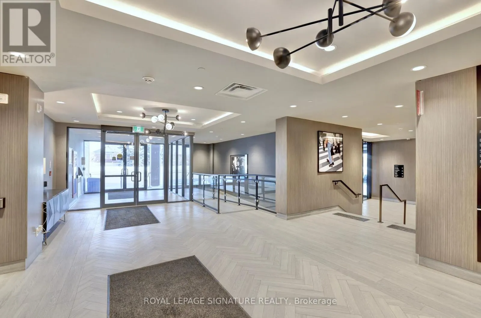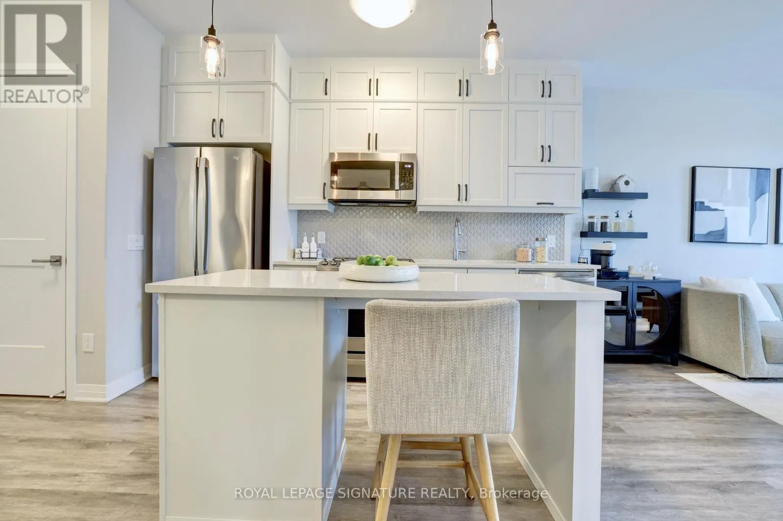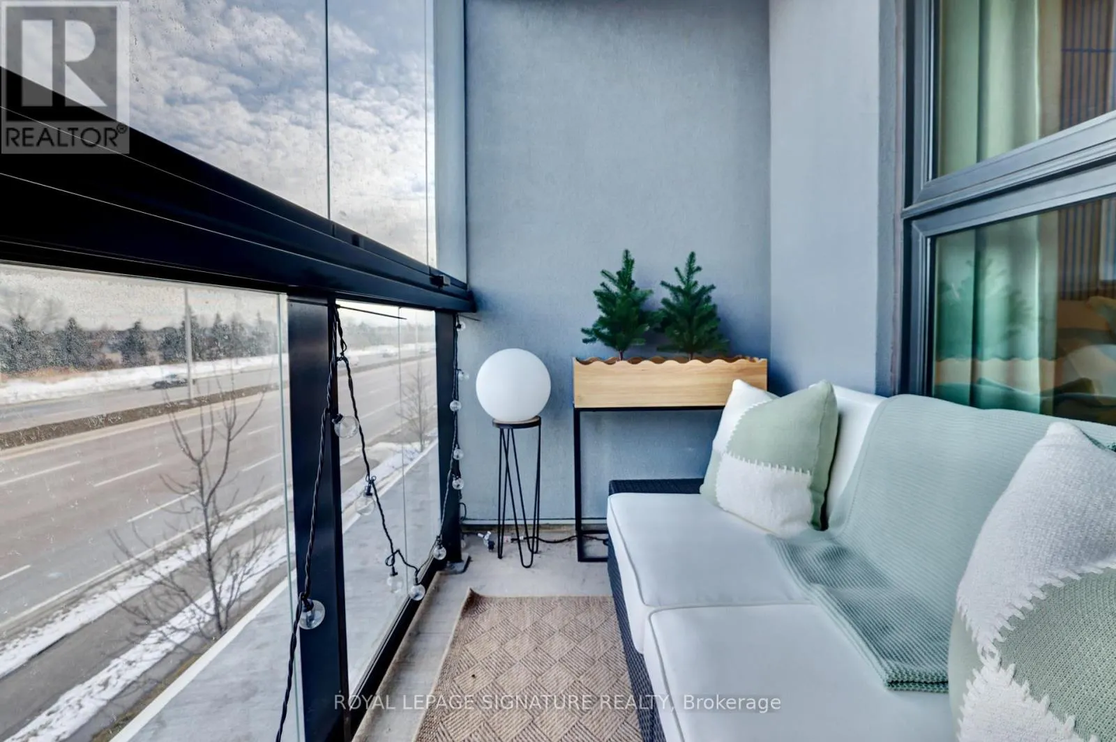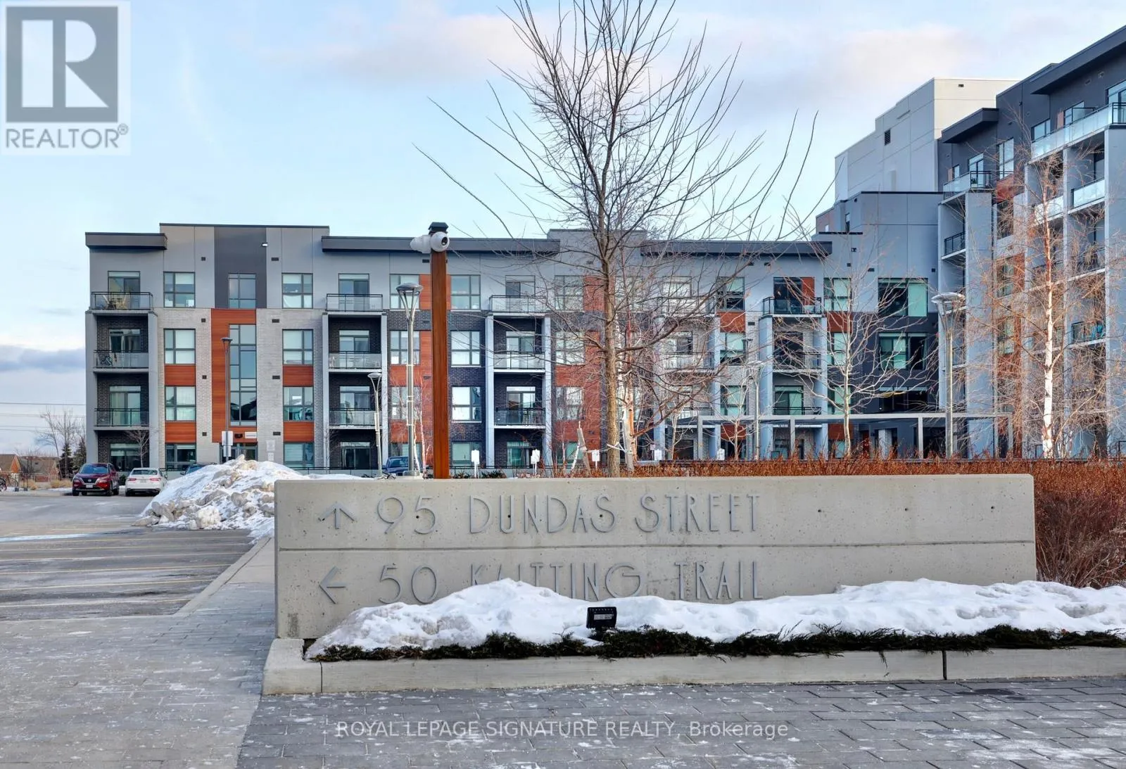Dundas and Sixth Line Beautiful NEW Low Rise Condo 661 Sq Ft. with 1 Bedroom and Den ceilings are 9ft. Convenient Main floor Access with Balcony on Second Level (very safe). Balcony is 37 Sq Ft private with Lumon Retractable Glass ($6K premium) to allow for open balcony or enclosed. Kitchen is open to Living Room, Kitchen Island has seating and hanging light Pendants, Linen closet, Bedroom Wall has been Soundproofed plus Acoustic Wood Feature wall added. Flooring is Vinyl and Den is large enough for Office, Nursery or Day Bed. Building Amenities includes Gym and Party Room, Rooftop Lounge with BBQ. The underground parking is on Main Level and very bright, Visitor parking is surface and convenient. Location is Excellent close to Hospital, Hwy and tons of Shopping options. SEE VIRTUAL TOUR ATTACHED TO LISTING. (id:27476)
