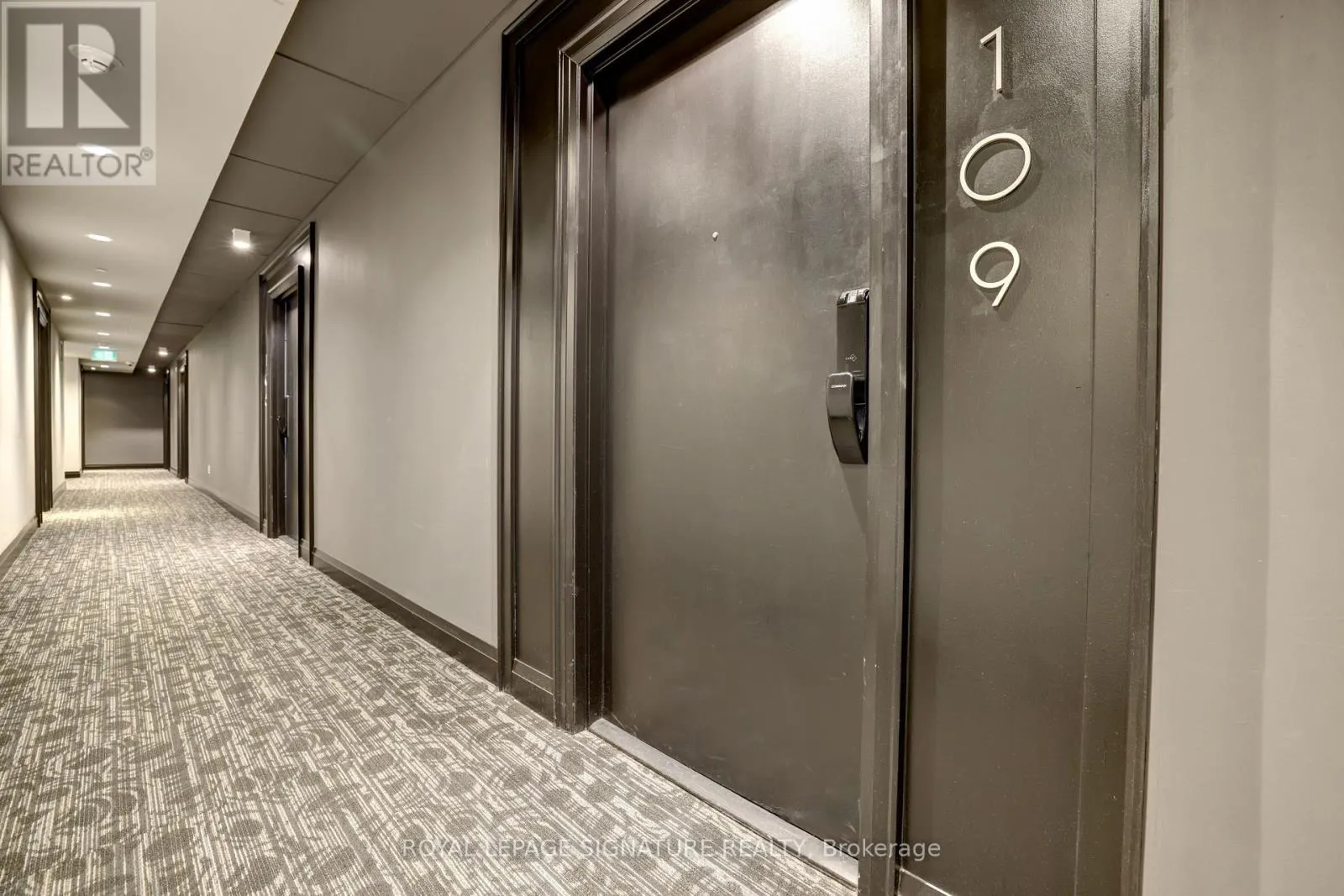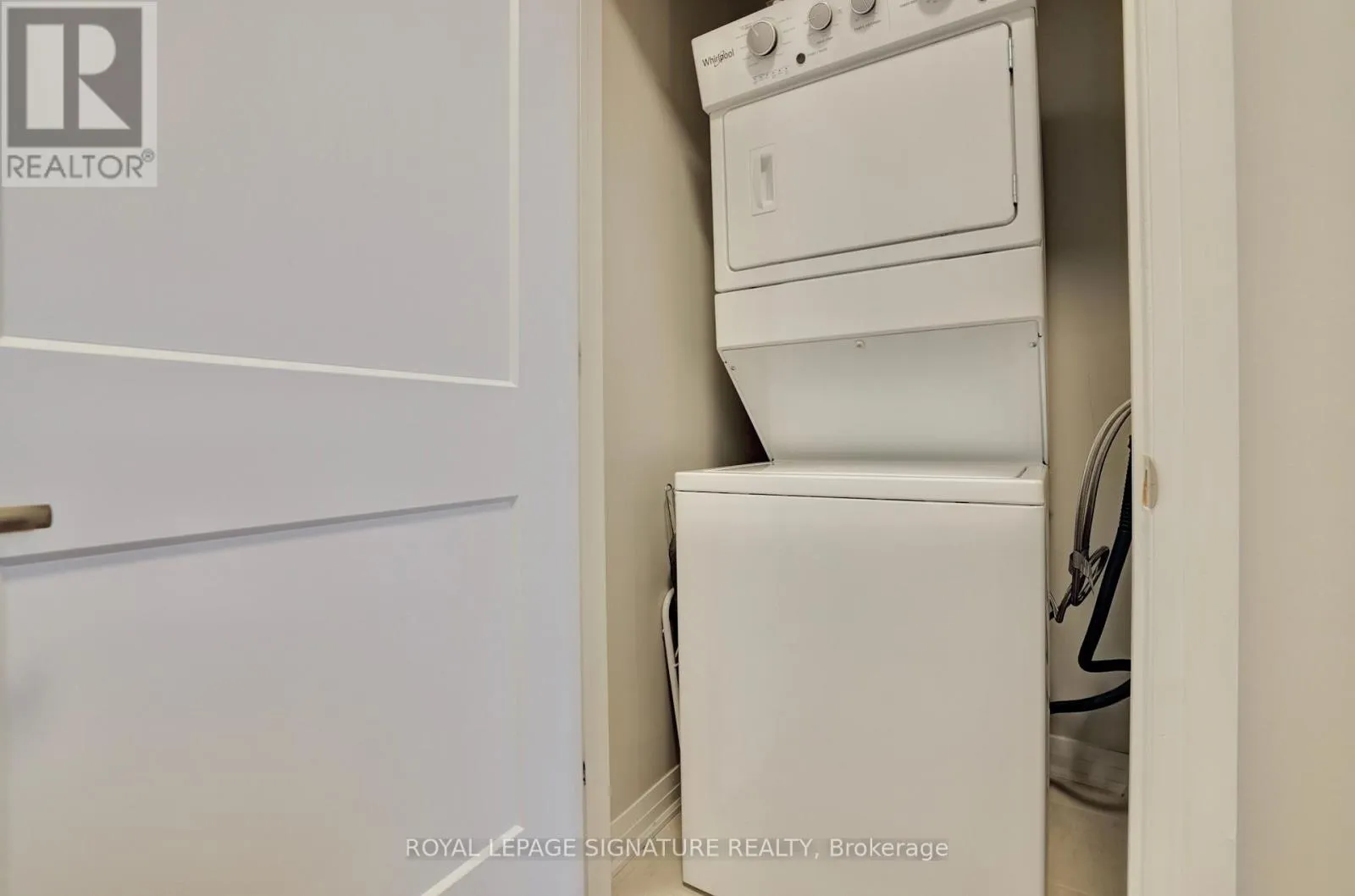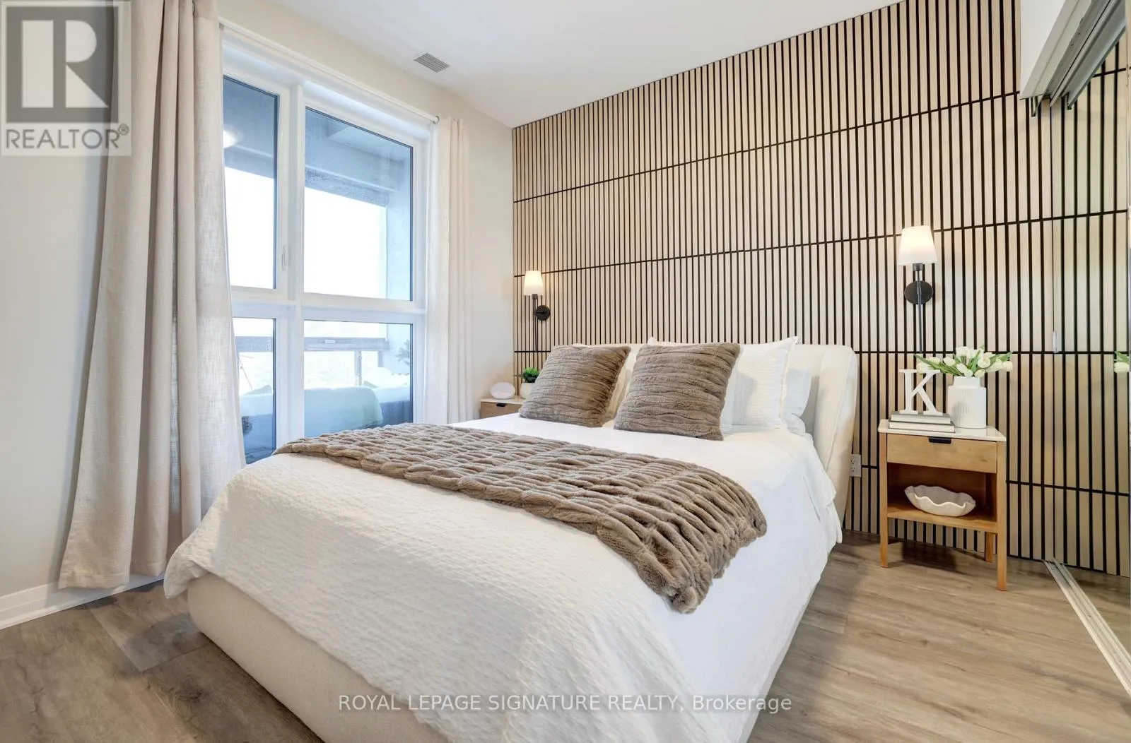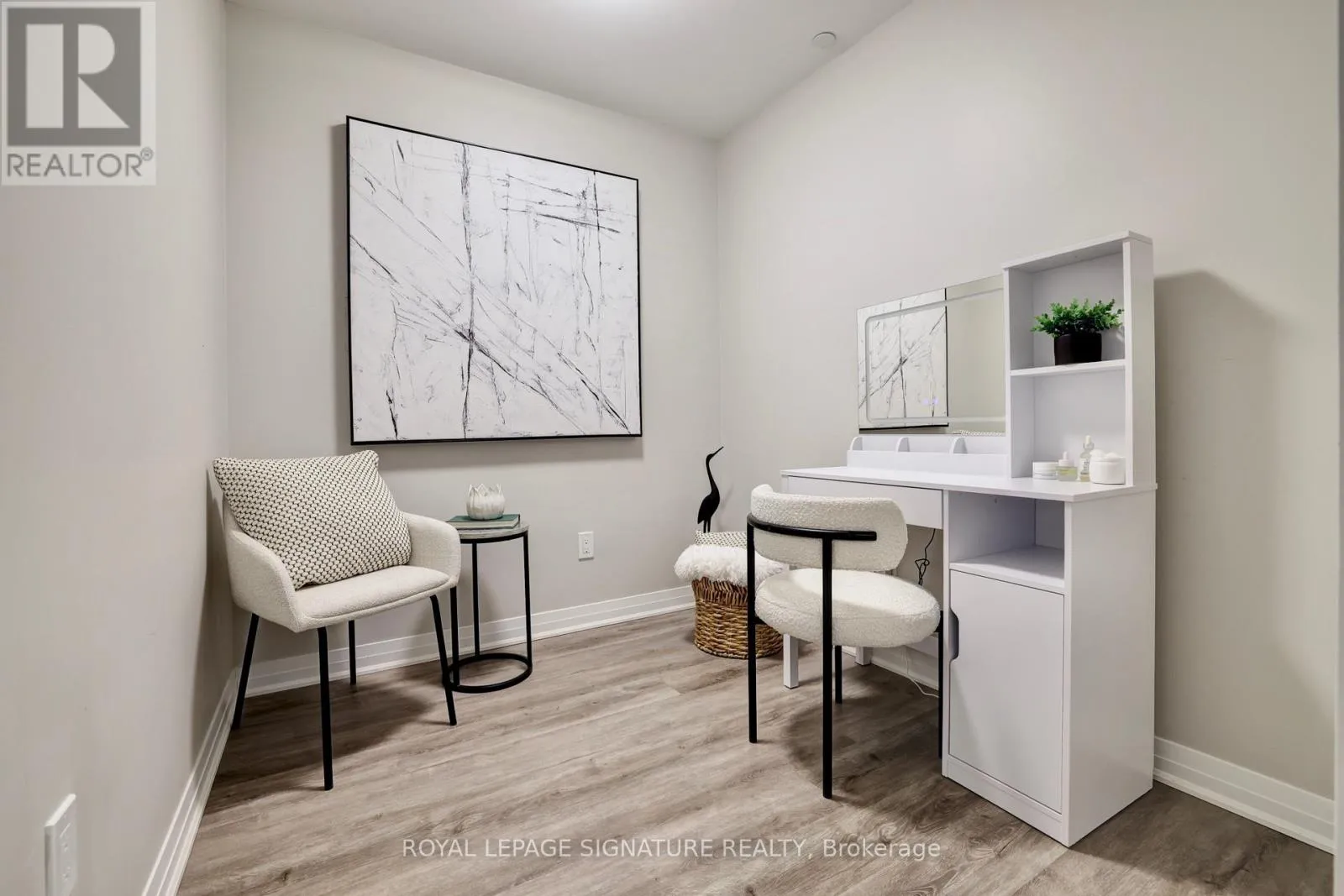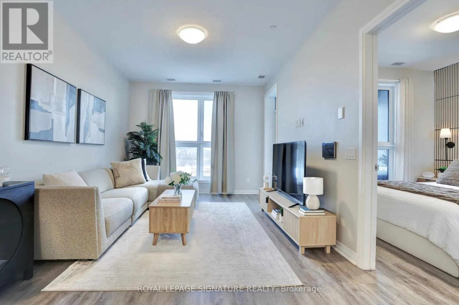 Dundas and Sixth Line Beautiful NEW Low Rise Condo 661 Sq Ft. with 1 Bedroom and Den ceilings are 9ft. Convenient Main floor Access with Balcony on Second Level (very safe). Balcony is 37 Sq Ft private with Lumon Retractable Glass ($6K premium) to allow for open balcony or enclosed. Kitchen is open to Living Room, Kitchen Island has seating and hanging light Pendants, Linen closet, Bedroom Wall has been Soundproofed plus Acoustic Wood Feature wall added. Flooring is Vinyl and Den is large enough for Office, Nursery or Day Bed. Building Amenities includes Gym and Party Room, Rooftop Lounge with BBQ. The underground parking is on Main Level and very bright, Visitor parking is surface and convenient. Location is Excellent close to Hospital, Hwy and tons of Shopping options. SEE VIRTUAL TOUR ATTACHED TO LISTING. (id:27476)