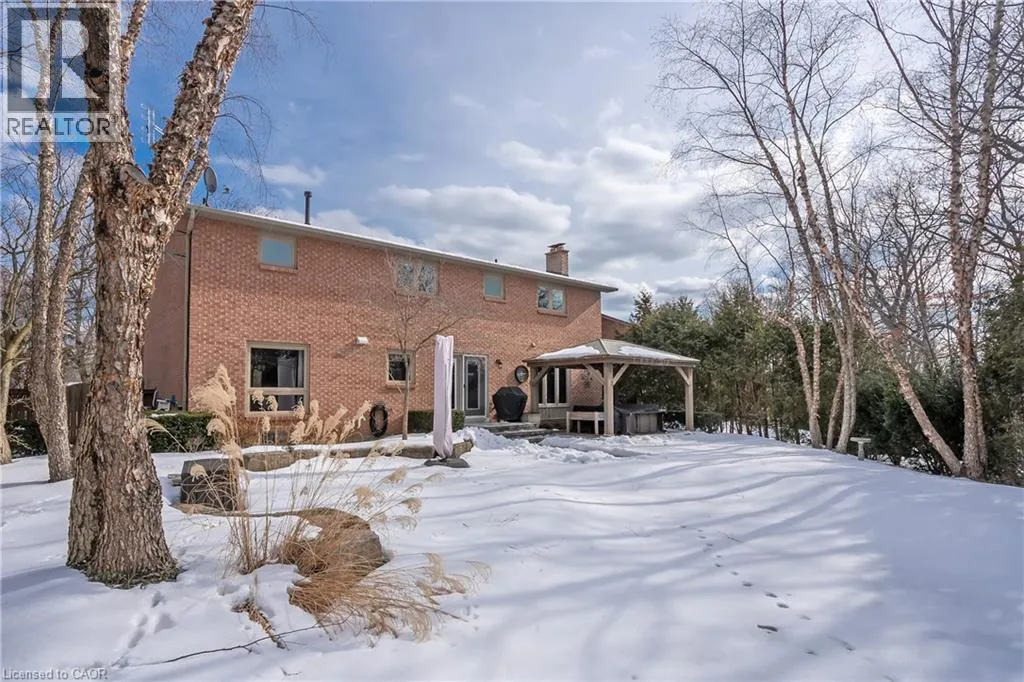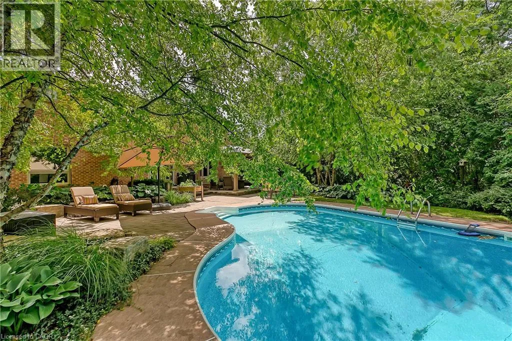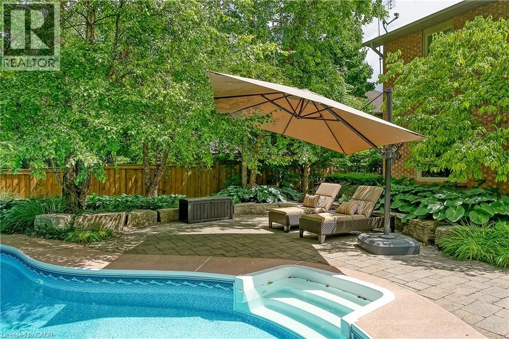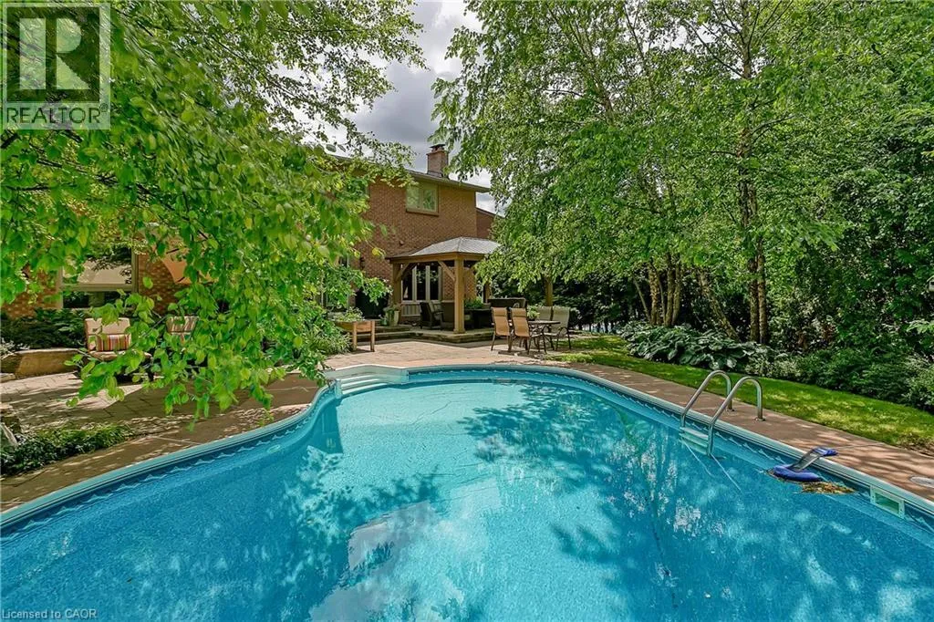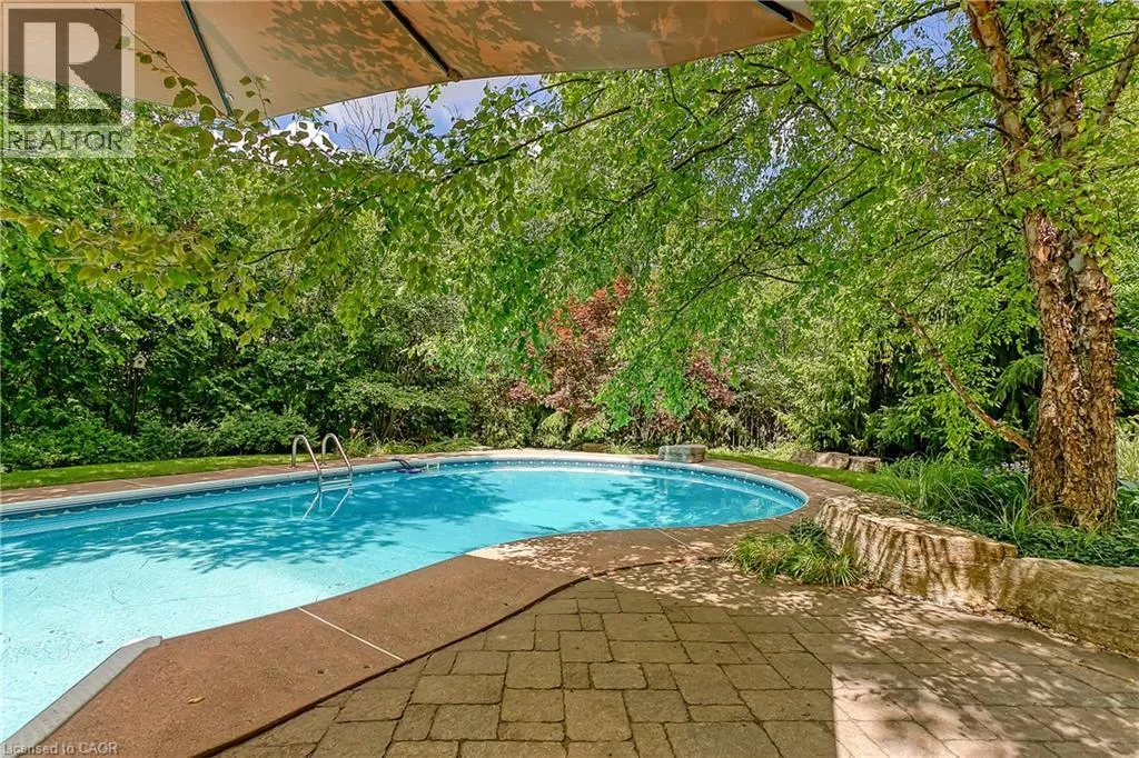 OLD UPPER MIDDLE-MCCRANEY-ROYAL ALBERT An outstanding and truly irreplaceable property backing onto 16 Mile Creek and the world-renowned Glen Abbey Golf Course. The gorgeous, private lot features an in-ground pool and charming cabanaâan ideal setting for outdoor entertaining and family gatherings. This impeccably maintained four-bedroom family home has been thoughtfully updated throughout. The stunning cream kitchen features stainless steel appliances, granite countertops, and an oversized island, seamlessly opening to a warm and inviting family room with a wood-burning fireplace. Maple hardwood flooring runs throughout. Elegant formal dining room, complemented by a bright living room with a charming bay window. The upper level offers four generously sized bedrooms, an updated main bath, and a delightful reading nook. The primary retreat includes a walk-in closet and a beautifully renovated, spa-inspired ensuite with a freestanding soaker tub and separate shower. The fully finished basement provides exceptional additional living space with a wood-burning fireplace, recreational area, and an additional three-piece bathroom. (id:27476)