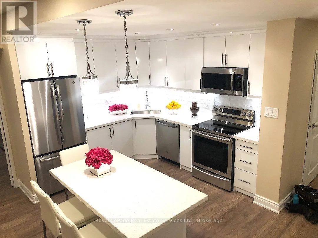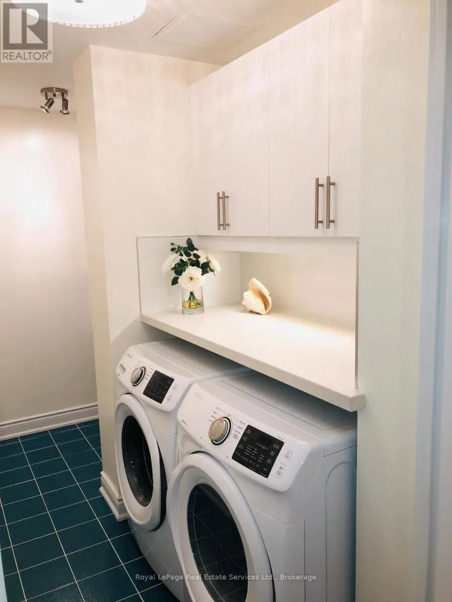 Cross Streets: 3rd Line & Marine Drive. ** Directions: East of 3rd Line. Welcome to refined, effortless living in the heart of prestigious Bronte - just steps from Lake Ontario, waterfront trails, boutique shops, restaurants, parks, and top-rated schools.This fully renovated executive condo offers approximately 1,300 square feet of elegant, open-concept space, designed for both comfort and style.From the moment you walk in, you're greeted by stunning views of lush greenery and manicured grounds, filling the oversized living and dining area with natural light.The custom designer kitchen features premium finishes, thoughtful storage, and a layout that's perfect for everyday living or entertaining.The spacious primary suite includes beautifully built-in cabinetry, while the second bedroom offers flexibility for guests, a home office, or family. You'll also love the rare, oversized laundry room with extensive custom storage.The spa-inspired main bathroom brings a true sense of luxury, and custom velvet drapery throughout adds warmth and sophistication.Located on the main floor, this unit offers exceptional convenience - no stairs, no elevator - making it ideal for executive couples, downsizers, or anyone seeking easy, turnkey living.All within a quiet, impeccably managed building in one of the most desirable lakeside communities.This is a rare opportunity to own a fully renovated, move-in-ready home in an unbeatable location.To book your private showing, contact Robert Wodz at 905-334-8040 (id:27476)