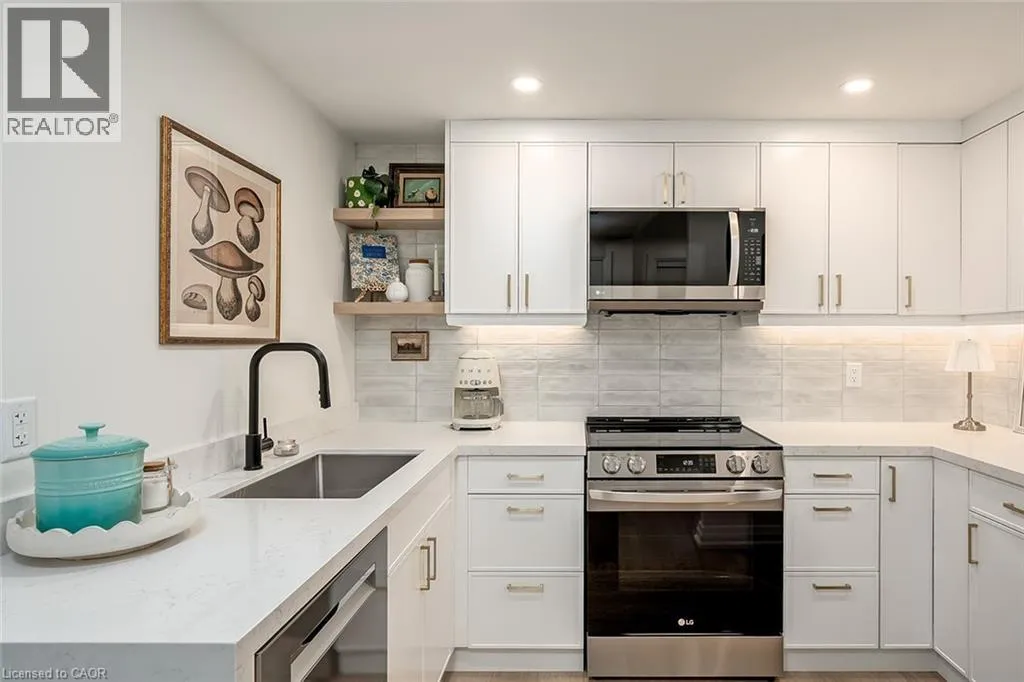 South of Lakeshore Road Gorgeous 1 bed 1 bath fully renovated unit with chic finishes in Bronte's boutique Pier 12 condo in the heart of Bronte Village. The updated kitchen features stainless appliances, quartz counters, pot lights and undermount sink. The bright living room/dining room faces east and features engineered flooring, and the beautiful bathroom has a glass step in shower with gold accents. You can access your balcony from the living room or bedroom. Enjoy stunning sunsets and outstanding views of the harbor, lake, historic boat yard, and the main strip, and enjoy sunrises, sunsets and BBQs with guests from the updated roof top terrace with 360-degree views. Fantastic amenities include a roof top library and party room, indoor pool, sauna, and exercise room. Steps to the lake, marina, restaurants, and shops and all Bronte has to offer. Includes two underground parking garages. Lockers are available to rent for $20/Month. (id:27476)