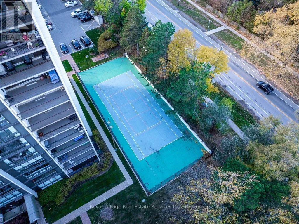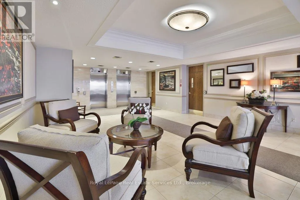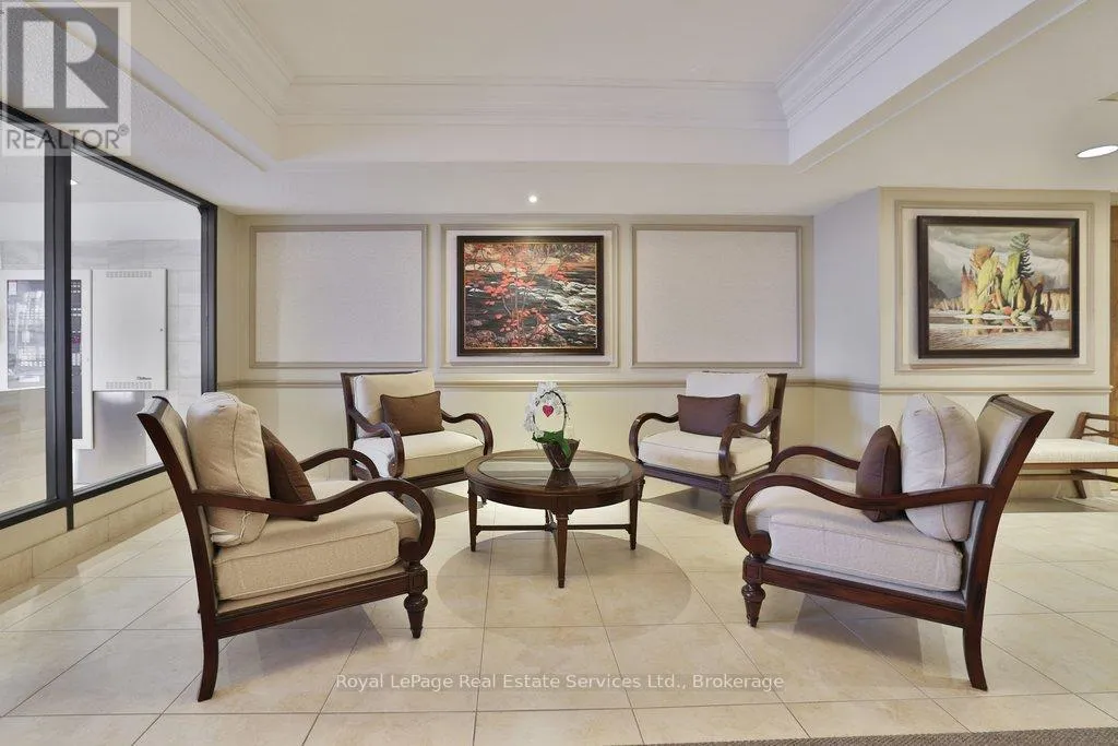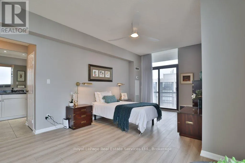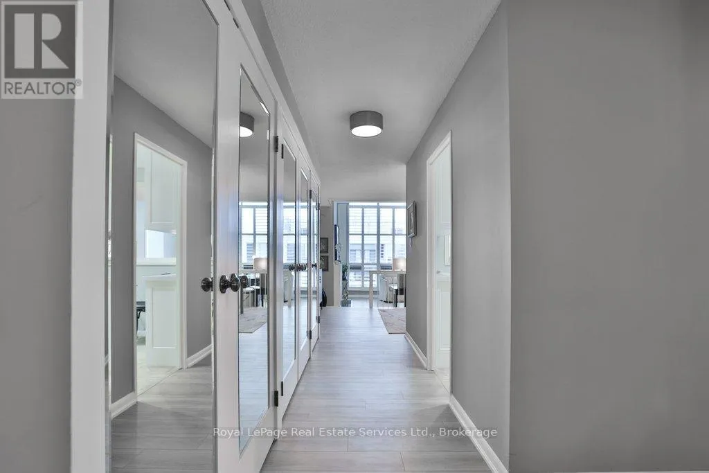 Cross Streets: Lakeshore & Bronte. ** Directions: Lakeshore-Bronte-Marine. Corner penthouse with east & south lakeviews in the highly sought after Ennisclare on the Lake. 1600sqft of renovated space, 2 bed + proper den, and 2 full bathrooms. 2 parking spots & locker. 3 walkouts to a large balcony! A great fit for those looking to downsize without compromising on space. Not only is the unit a turnkey home, Ennisclare on the Lake offers an active lifestyle, with like-minded neighbours, easy access to the lake, marina, community centre and downtown Bronte. Enjoy fantastic restaurants, shopping & recreation at your fingertips. With an enviable range of amenities including indoor pool, poolside lounge, party room, gym, billiards room, golf practice room, outdoor tennis & more! Spacious foyer welcomes you to the unit with 2 double coat closets & single storage closet, leading to the modern kitchen. Updated kitchen with stainless steel appliances, quartz counters & custom cabinets opens to dining room & sunken living room. The living room boasts vaulted ceilings, electric fireplace, California shutters, walkout to large balcony with lakeviews. Adjacent proper den with walkout & lakeviews! Expansive primary bedroom with large closet space, walkout & 3pc ensuite. Spacious 2nd bedroom, full bathroom, and separate laundry room. Everything you could need! Perfect! Improvements include but are not limited to kitchen reno (new cabinets, stainless steel appliances, counters) ('23) front hallway closet doors & flooring ('23), solar control film (east facing living rm windows & den window) ('23), shower door (2022), electric fireplace ('22), bathroom mirrors (2022), premium vinyl flooring (2021) (id:27476)