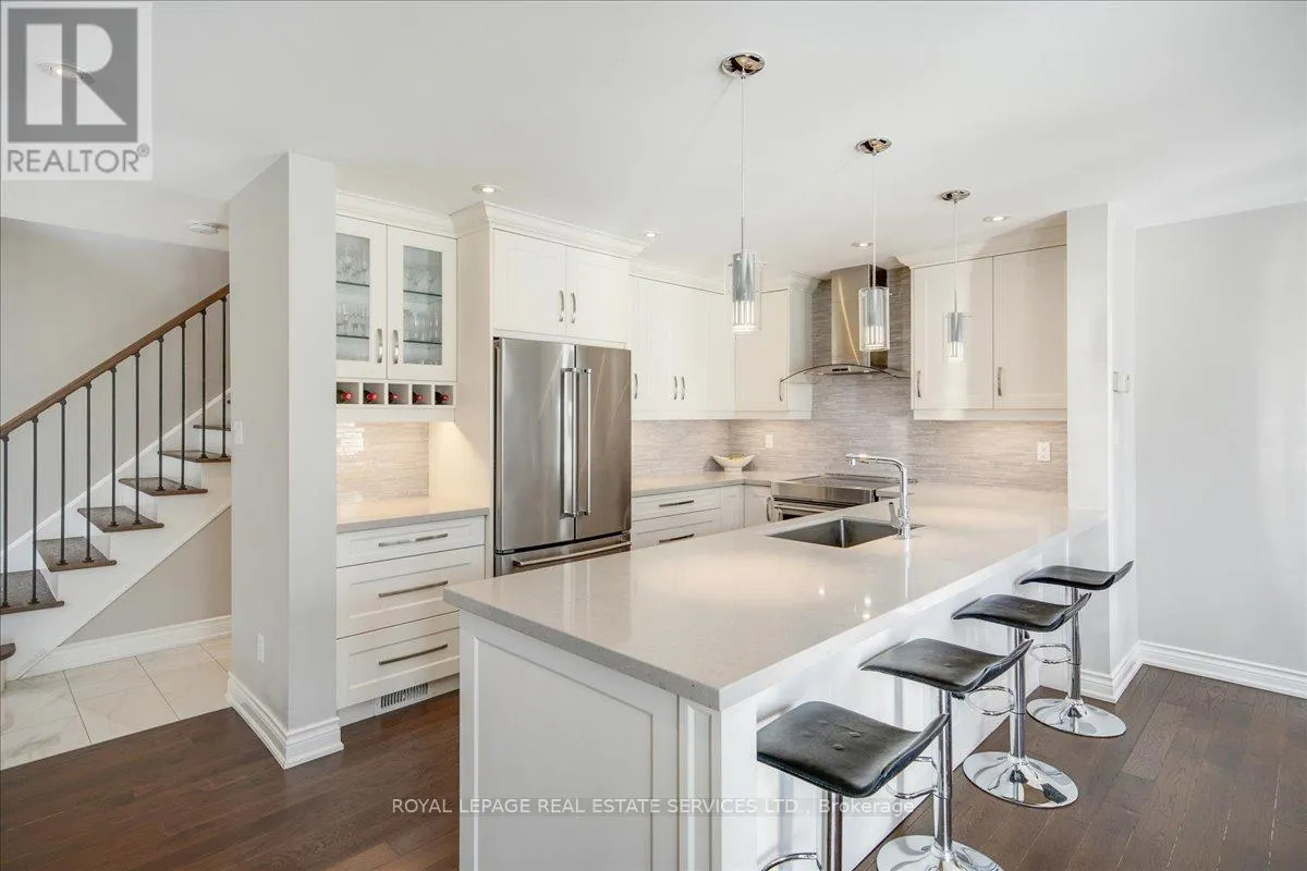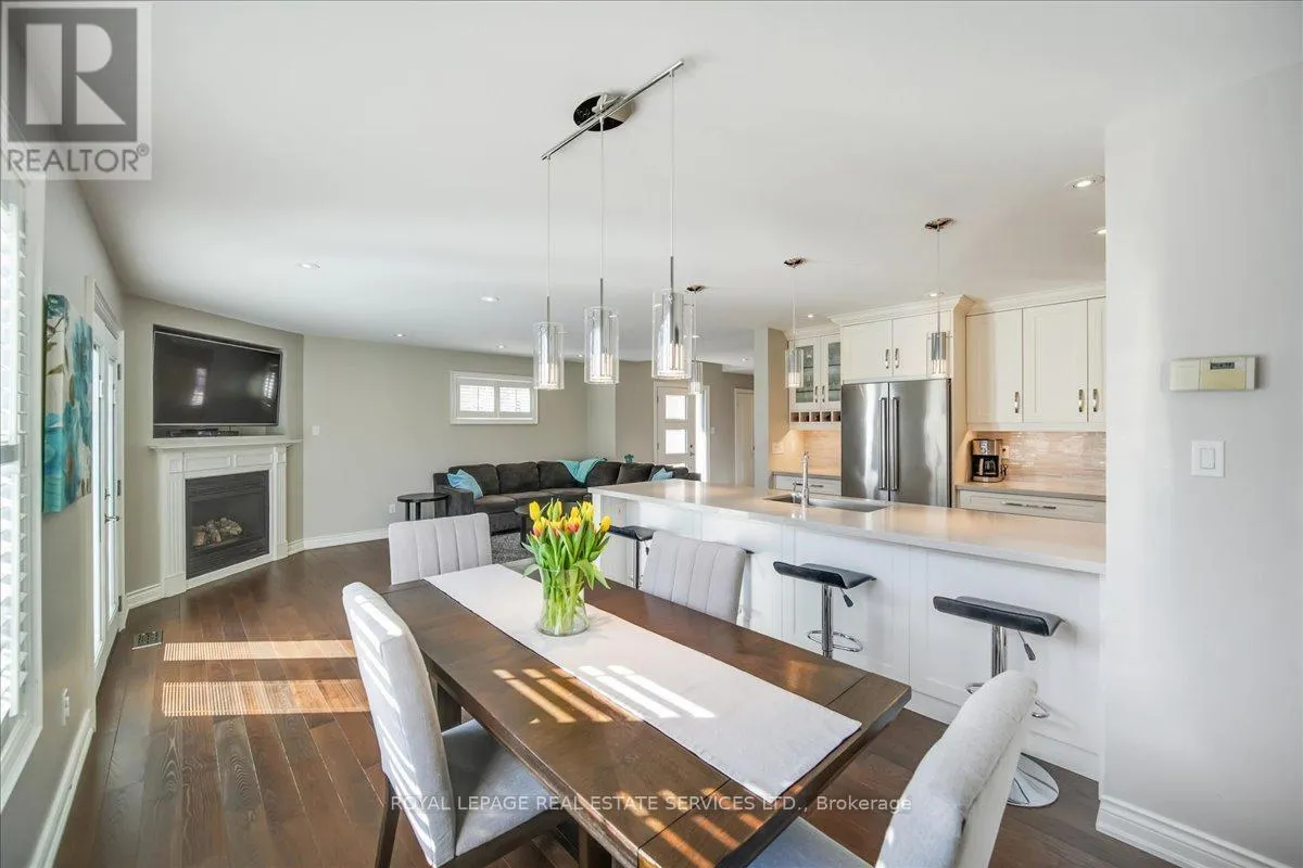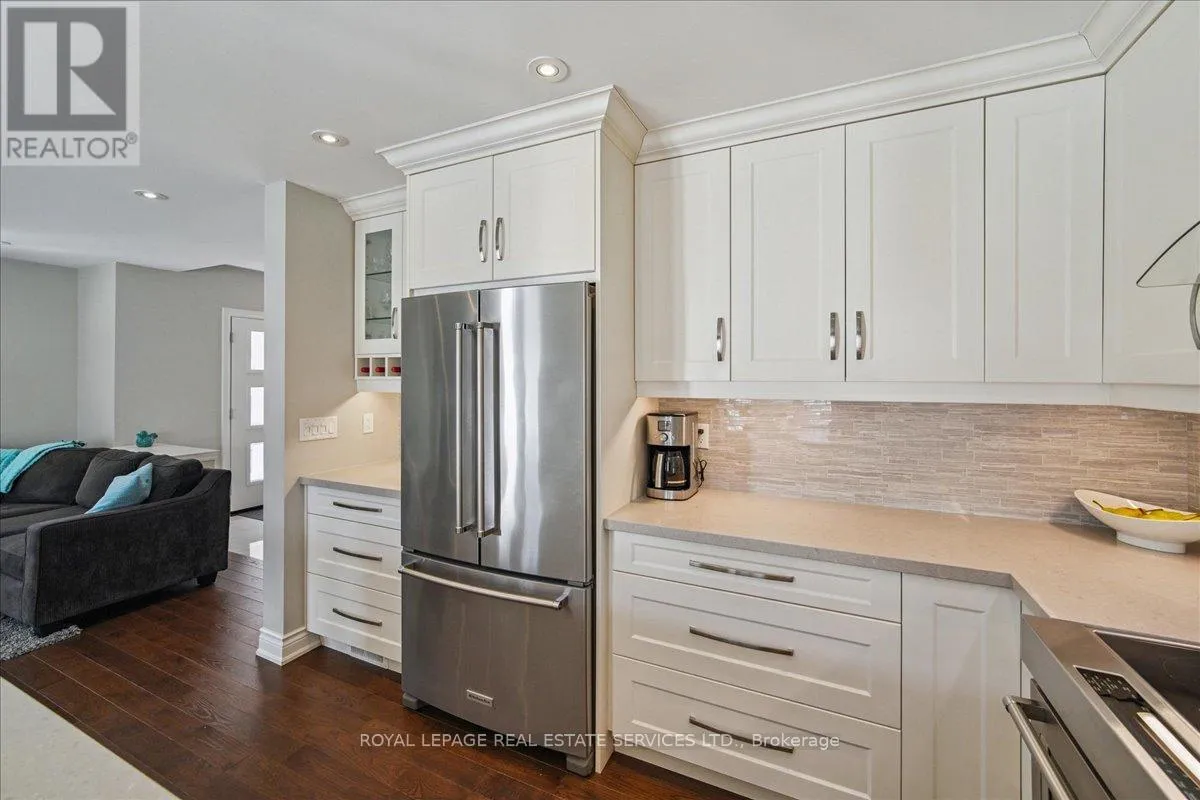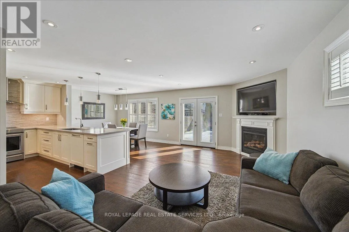 Fourth Line & Westoak Trails Blvd This exceptional freehold end-unit townhome lives like a semi-detached and sits on a rare oversized pie-shaped lot framed by mature trees, offering remarkable outdoor space seldom found in this style of home. Complete with a double car garage and a driveway accommodating up to four vehicles, the property combines space, privacy, and convenience. Designed with 3 bedrooms and 3+1 bathrooms, the home features a bright open-concept layout ideal for both entertaining and everyday living, with hardwood flooring throughout. The main level showcases spacious living and dining areas filled with natural light, pot lights throughout, and a gas fireplace with a classic white mantel and wall-mounted TV above. The designer kitchen, renovated in 2018, features custom cabinetry, quartz countertops, and a large peninsula with an undermount sink and breakfast bar seating beneath modern pendant lighting. Premium stainless steel KitchenAid appliances include a refrigerator, induction range, custom panel dishwasher, and sleek range hood, complemented by a stylish tile backsplash and built-in wine storage with glass display cabinets. A convenient laundry room with cabinetry, laundry sink, and inside access to the double car garage completes the main level. Upstairs, three spacious bedrooms include a beautiful primary retreat with a spa-inspired 5-piece ensuite featuring a freestanding soaker tub, oversized glass walk-in shower with rainfall showerhead, and double vanity with quartz countertop. A well-appointed 4-piece bathroom serves the additional bedrooms. The finished lower level offers a large recreation room with pot lights, a 3-piece bathroom, and generous storage. Outside, the expansive pie-shaped backyard features a patterned concrete patio and walkway, gas BBQ hookup, and custom garden shed. Ideally located just moments from scenic trails along 16 Mile Creek and within walking distance to both public and Catholic elementary schools. (id:27476)