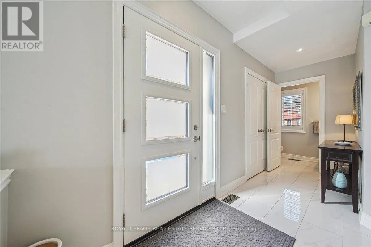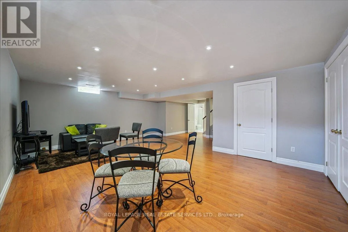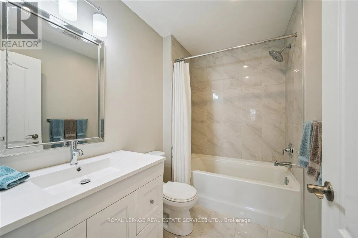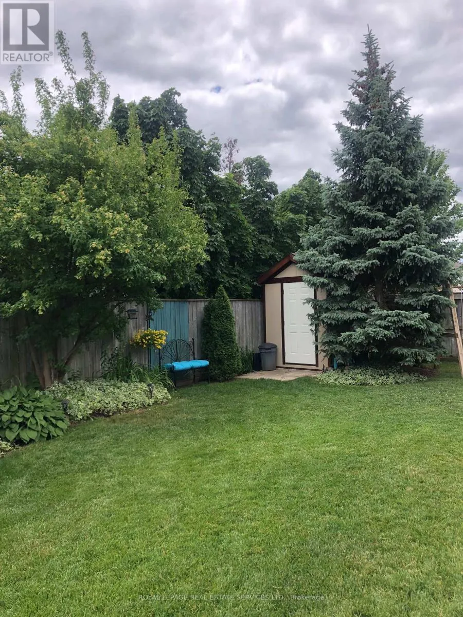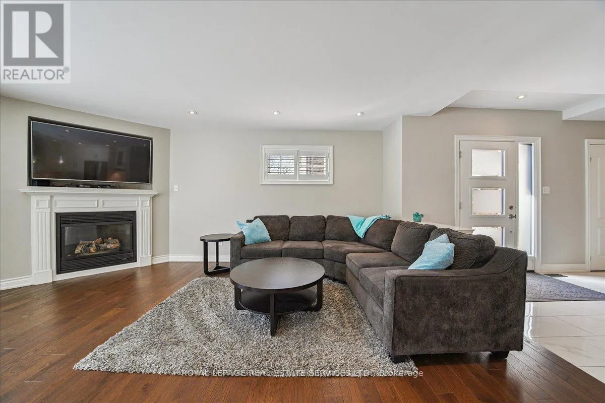 Fourth Line & Westoak Trails Blvd This exceptional freehold end-unit townhome lives like a semi-detached and sits on a rare oversized pie-shaped lot framed by mature trees, offering remarkable outdoor space seldom found in this style of home. Complete with a double car garage and a driveway accommodating up to four vehicles, the property combines space, privacy, and convenience. Designed with 3 bedrooms and 3+1 bathrooms, the home features a bright open-concept layout ideal for both entertaining and everyday living, with hardwood flooring throughout. The main level showcases spacious living and dining areas filled with natural light, pot lights throughout, and a gas fireplace with a classic white mantel and wall-mounted TV above. The designer kitchen, renovated in 2018, features custom cabinetry, quartz countertops, and a large peninsula with an undermount sink and breakfast bar seating beneath modern pendant lighting. Premium stainless steel KitchenAid appliances include a refrigerator, induction range, custom panel dishwasher, and sleek range hood, complemented by a stylish tile backsplash and built-in wine storage with glass display cabinets. A convenient laundry room with cabinetry, laundry sink, and inside access to the double car garage completes the main level. Upstairs, three spacious bedrooms include a beautiful primary retreat with a spa-inspired 5-piece ensuite featuring a freestanding soaker tub, oversized glass walk-in shower with rainfall showerhead, and double vanity with quartz countertop. A well-appointed 4-piece bathroom serves the additional bedrooms. The finished lower level offers a large recreation room with pot lights, a 3-piece bathroom, and generous storage. Outside, the expansive pie-shaped backyard features a patterned concrete patio and walkway, gas BBQ hookup, and custom garden shed. Ideally located just moments from scenic trails along 16 Mile Creek and within walking distance to both public and Catholic elementary schools. (id:27476)