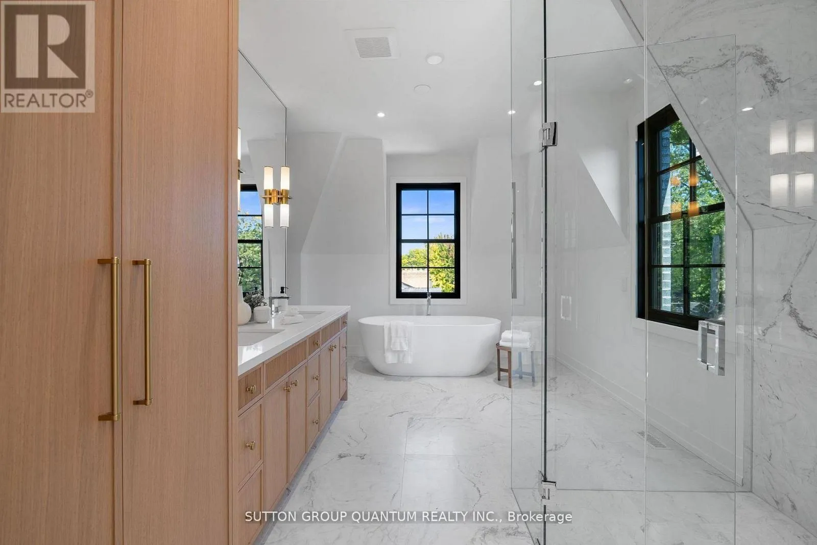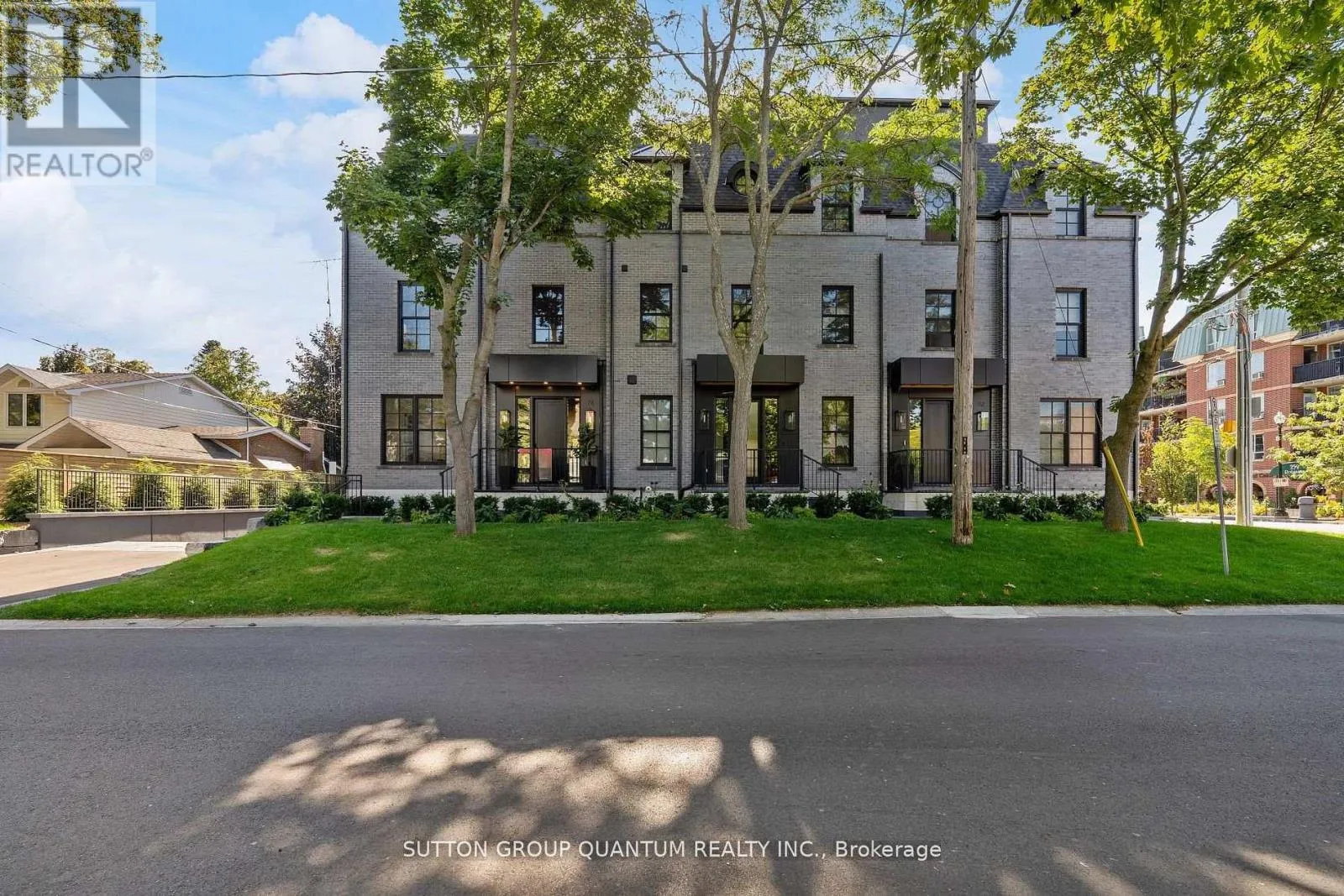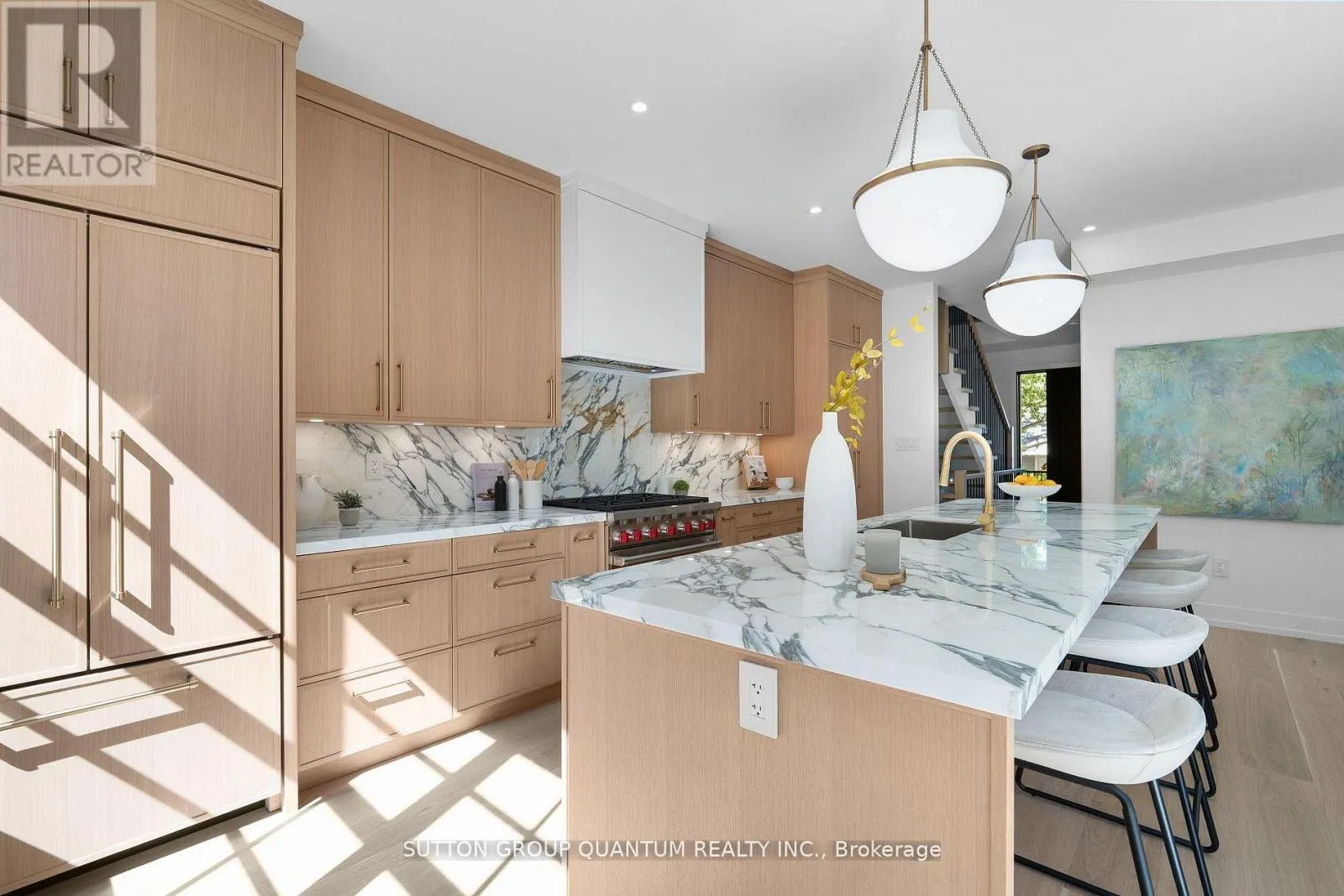 Trafalgar and Lakeshore Welcome to this stunning, never before lived in custom-built 3-storey townhouse in the heart of downtown Oakville, offering 3 bedrooms, 4 bathrooms, and over 3,100 total square feet of luxurious living spaces. Designed for sophisticated urban living, this home features a private in-home elevator providing easy access to all levels, from the finished basement with heated concrete floors to the expansive rooftop terrace. The chef's kitchen boasts top-of-the-line Sub Zero, Wolfe and Miele appliances, custom white oak cabinetry with gold touches, and gorgeous marble countertops. An oversized 11' island overlooks the bright living and dining area complete with a custom plaster fireplace design flanking built-in cabinetry. French doors lead to a walk-out balcony, enhancing the living space with an outdoor area for bbquing and relaxing. The second floor offers two generously sized bedrooms, each with its own ensuite bath and walk-in closet, providing comfort and privacy for family and/or guests. The spacious laundry room with full size stacked washer/dryer is conveniently located just outside these bedrooms. A lovely primary retreat space is found on the third floor, featuring a private balcony, a huge walk-in closet, and a spa-inspired 5-piece ensuite featuring heated floors, a soaker tub, and smart toilet. Additional highlights include a massive rooftop terrace ideal for outdoor entertaining, and on a clear day you can catch a view of Lake Ontario. A finished double car garage with sleek epoxy heated floors, as well as a heated driveway, make up the garage space, while providing direct access to the home. Showcasing premium finishes throughout, this home is ideally located steps from Oakville's lakefront, shops, dining, and top-rated schools. Offering a flexible move in date, this turn key residence is a rare opportunity to own a brand-new, luxury home in one of Oakville's most desirable neighborhoods. (id:27476)
