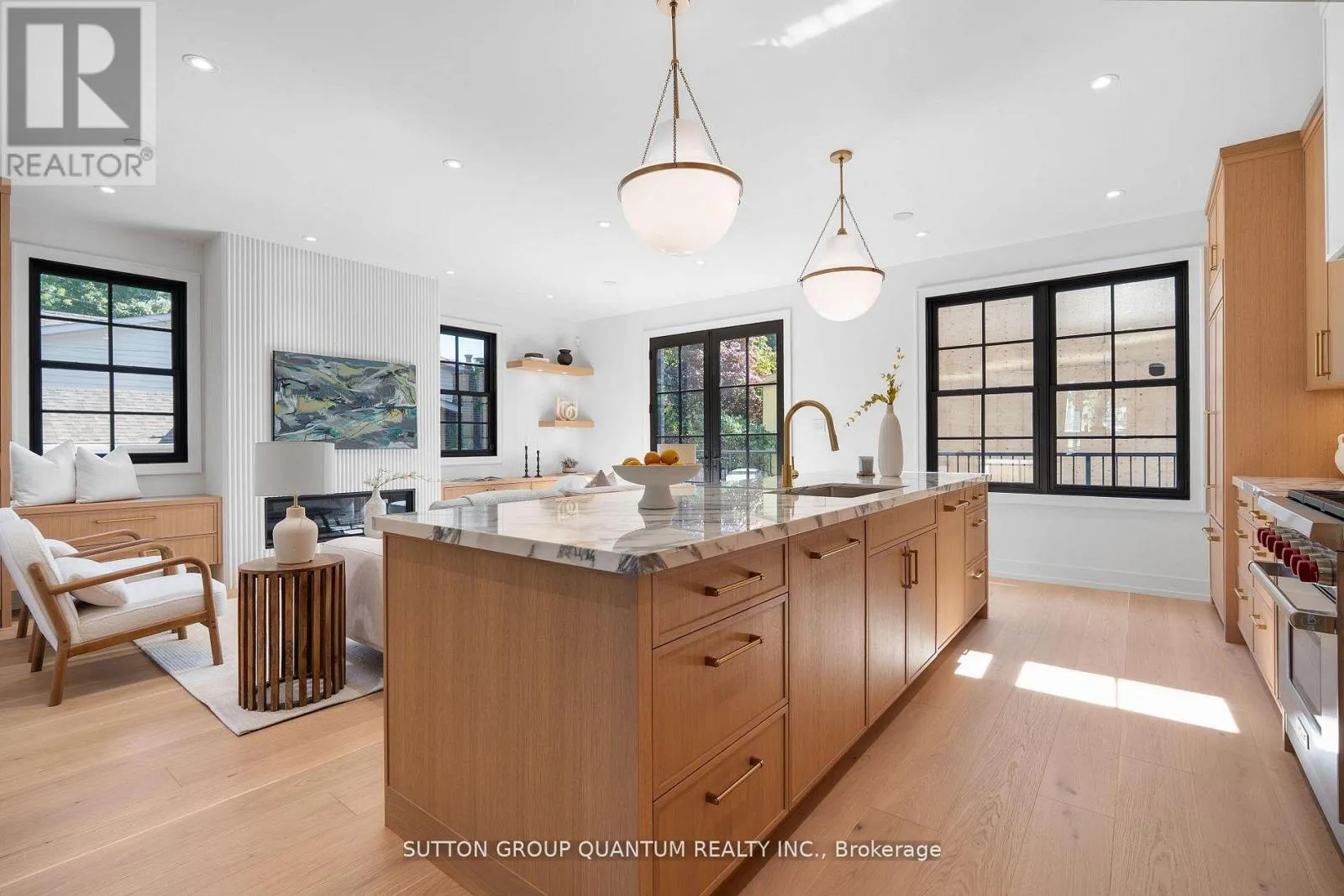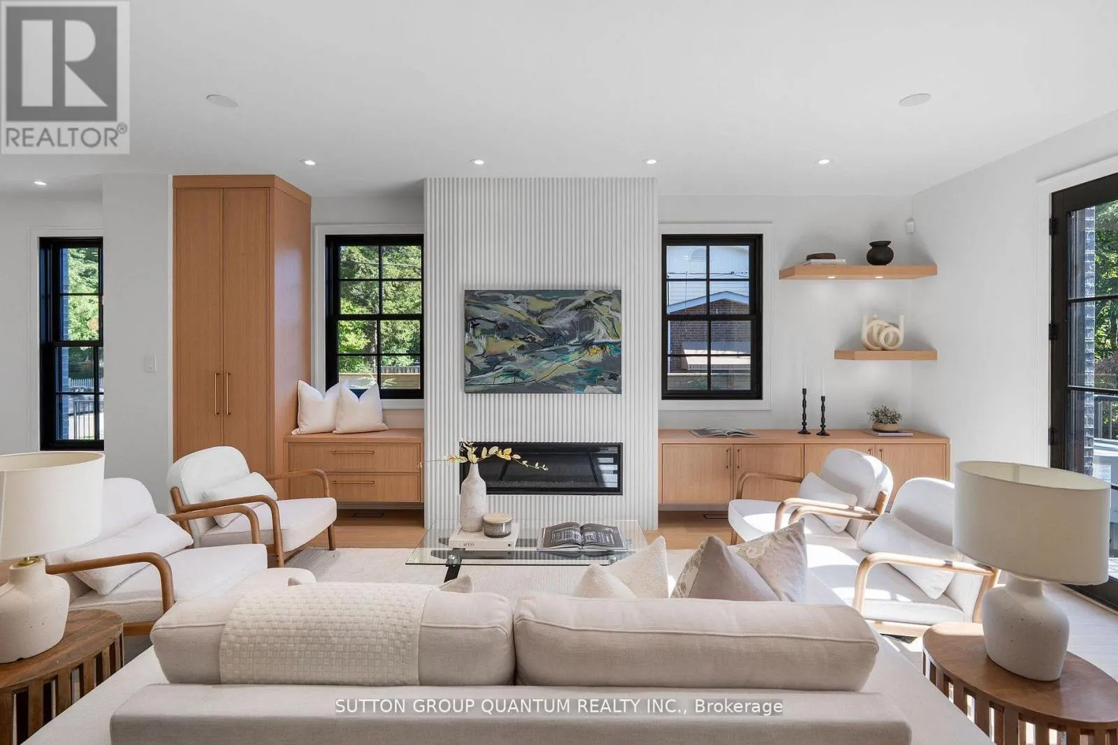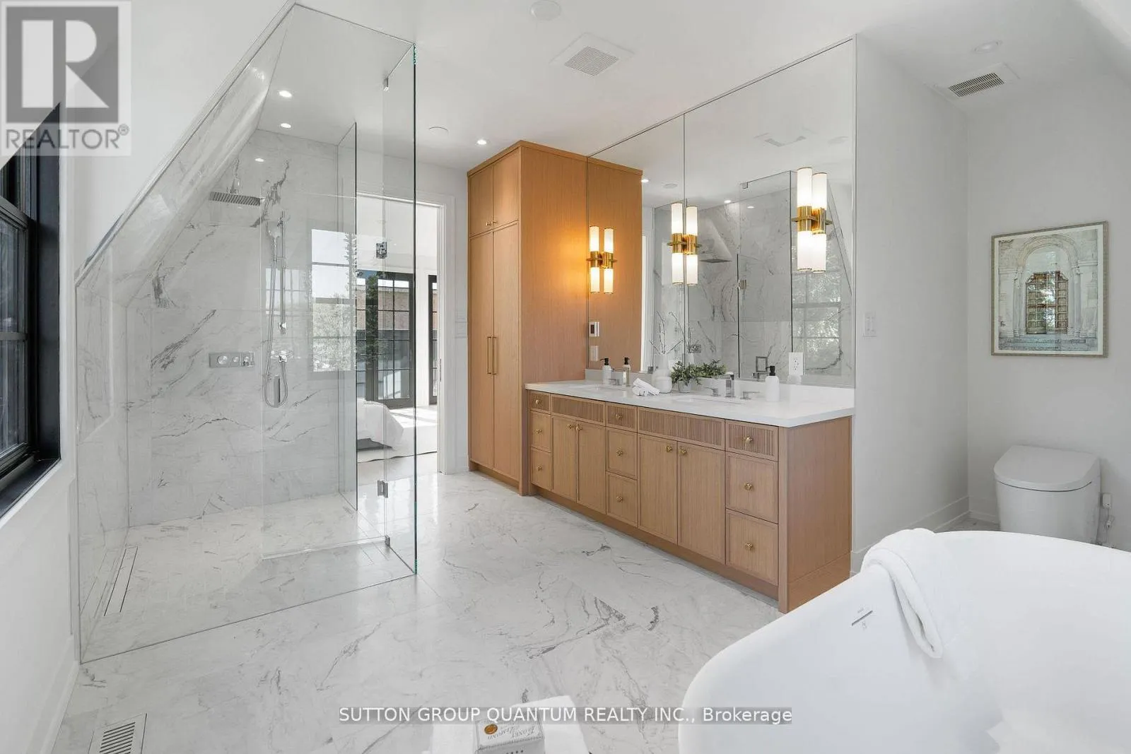 Trafalgar and Lakeshore Welcome to this stunning, never before lived in custom-built 3-storey townhouse in the heart of downtown Oakville, offering 3 bedrooms, 4 bathrooms, and over 3,100 total square feet of luxurious living spaces. Designed for sophisticated urban living, this home features a private in-home elevator providing easy access to all levels, from the finished basement with heated concrete floors to the expansive rooftop terrace. The chef's kitchen boasts top-of-the-line Sub Zero, Wolfe and Miele appliances, custom white oak cabinetry with gold touches, and gorgeous marble countertops. An oversized 11' island overlooks the bright living and dining area complete with a custom plaster fireplace design flanking built-in cabinetry. French doors lead to a walk-out balcony, enhancing the living space with an outdoor area for bbquing and relaxing. The second floor offers two generously sized bedrooms, each with its own ensuite bath and walk-in closet, providing comfort and privacy for family and/or guests. The spacious laundry room with full size stacked washer/dryer is conveniently located just outside these bedrooms. A lovely primary retreat space is found on the third floor, featuring a private balcony, a huge walk-in closet, and a spa-inspired 5-piece ensuite featuring heated floors, a soaker tub, and smart toilet. Additional highlights include a massive rooftop terrace ideal for outdoor entertaining, and on a clear day you can catch a view of Lake Ontario. A finished double car garage with sleek epoxy heated floors, as well as a heated driveway, make up the garage space, while providing direct access to the home. Showcasing premium finishes throughout, this home is ideally located steps from Oakville's lakefront, shops, dining, and top-rated schools. Offering a flexible move in date, this turn key residence is a rare opportunity to own a brand-new, luxury home in one of Oakville's most desirable neighborhoods. (id:27476)