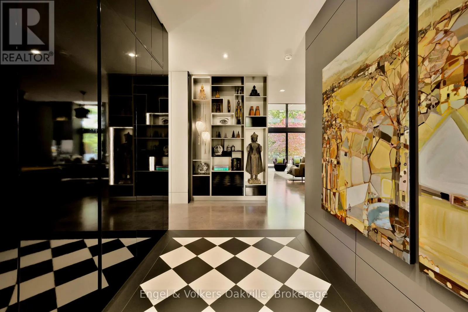 Cross Streets: Duncan Rd/Maplegrove Dr. ** Directions: Maple Grove Dr, West on Duncan Rd. This bold "Jewel-Box" design bungalow in SE Oakville epitomizes the concept of "Home as a Gallery" where architecture & décor blend to create high drama, unparalleled luxury w fully integrated Smart-Home technology. Almost 5,000 sqft. w 3+1 beds & 4 baths.15 ft floor to ceiling glass erase the boundary between the living rm & rear deck creating another complete living space, extending to hardscaping, lighting, & landscaping in the ultra-private rear yard. Striking hallways transition to dramatic principal rooms. Radiant heated concrete floors t/o provide comfort, while high-end custom cabinetry make a sleek minimalist vibe. An eclectic chef's kitchen w top-tier appliances, double ovens, a barista station, & unique wet bar w chilled sparkling & flat water accents the open concept living & dining rms. The luxurious primary offers views to a bamboo court & outdoor gas FP, custom built-in closets, & ens w soaker tub, Toto wash-let toilet w flr to ceiling stained-glass. The office & dressing rm can be converted to bdrms (w rough-in bath). The lower level emphasizes entertainment, w open-con games area, wet bar w granite counters & dishwasher, tiered theatre with 10' screen & full surround sound, versatile fam room/den, guest bedrm w 3-pce ens, laundry, & utility rm. For convenience, an elevator to all levels, including rooftop patio. The over-sized 2 car garage w EV charger has access to large mud-room w dog washing & garbage/recycling chute. Beyond the luxurious finishes, one must also appreciate the complete "Smart-Home" integration. For ease - seamless control of Sonos sound sys thru b/i speakers in & out, climate control, lighting, & security. For efficiency - individual room sensors for climate & lighting when vacant. For low maintenance - faux turf means no lawn cutting, & a snow melt system for the drive & walkways + the rear patio, w heat mode for outdoors when cool. Finally, for peace of mind - retractable exterior steel security blinds at the touch of a (id:27476)