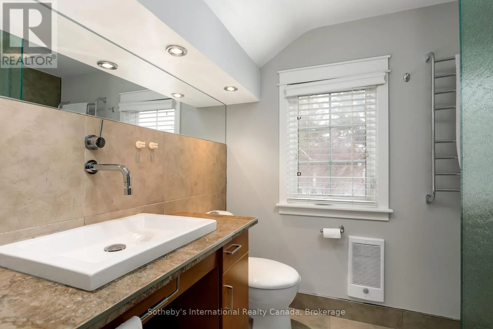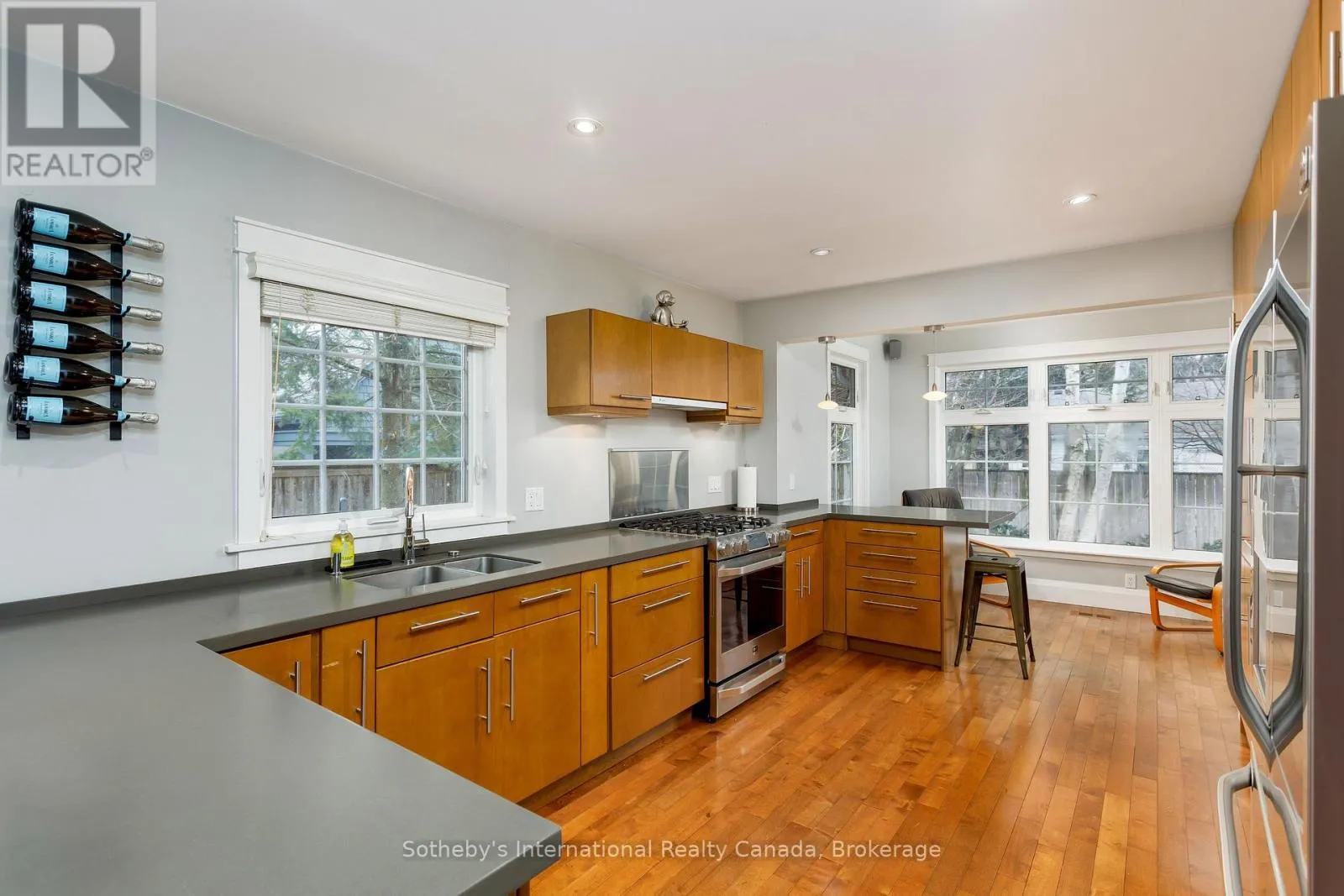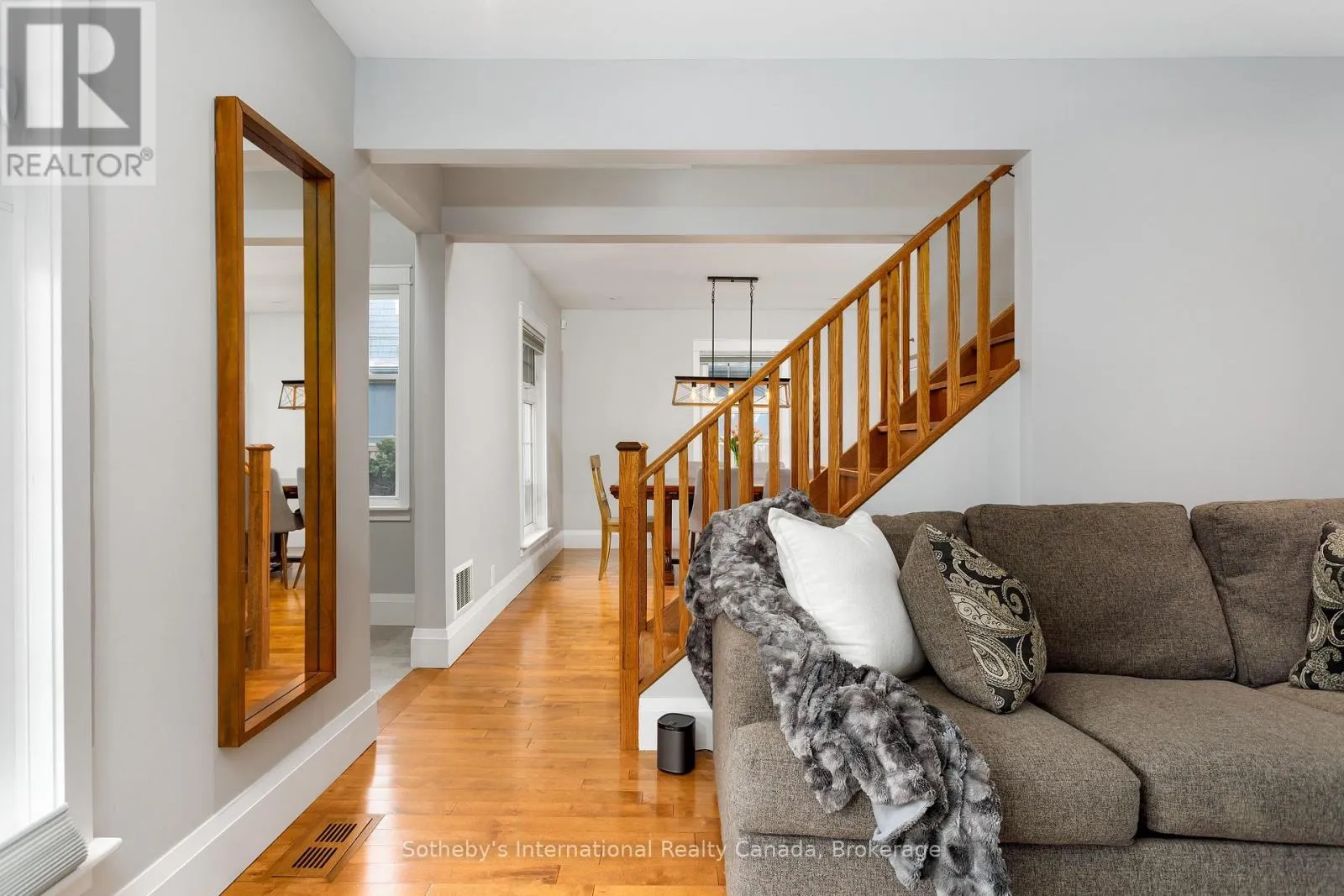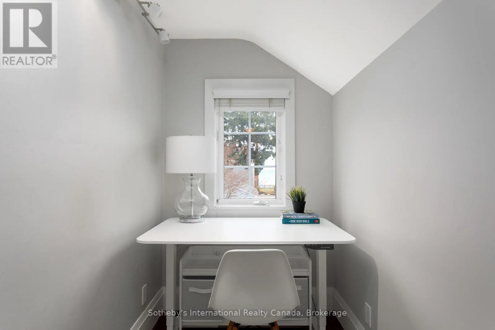 Chisholm St & Anderson St Rarely available in highly sought-after West Harbour, this turnkey home delivers a relaxed, walkable lakeside lifestyle perfect for downsizers or young professionals. The bright interior is modern and move-in ready. Neutral decor and hardwood floors flow seamlessly across the two main levels. Large south-facing windows bring an abundance of natural light. In the living room, custom built-ins flank the ethanol fireplace to add both character and practical storage, while the separate dining room is great for entertaining. The main floor den is a highly flexible space that serves perfectly as a home office or a cozy family room. The chef's kitchen offers a full pantry wall and ample counter space. The adjacent breakfast room is surrounded by large windows and has direct access to the private backyard-the ideal spot for your morning coffee. Upstairs, the primary bedroom features a charming nook with peekaboo lake views, making a lovely spot for a desk, vanity, or reading chair. A spacious second bedroom and an updated 3-piece bathroom with heated floors and towel rack complete the top floor. The finished lower level provides versatile bonus space for a home gym, recreation room, or additional workspace. Outside, the property truly shines. The backyard has undergone extensive landscaping to create a lush, private retreat. The multi-level stone patios provide multiple zones for entertaining and relaxing surrounded by low-maintenance mature perennials. An automated irrigation system and garden shed make maintenance a breeze. A subtle water feature echoes the lakeside setting with its soft, relaxing sounds. Out front, exceptional curb appeal is highlighted by the classic covered porch-the perfect spot to wind down and take in the sunset. The lifestyle here is unbeatable. Leave the car at home and walk straight down to the water, launch your paddleboard or canoe at the harbour-front Tannery Park, or take a short stroll to Oakville's best local shops and restaurants. (id:27476)