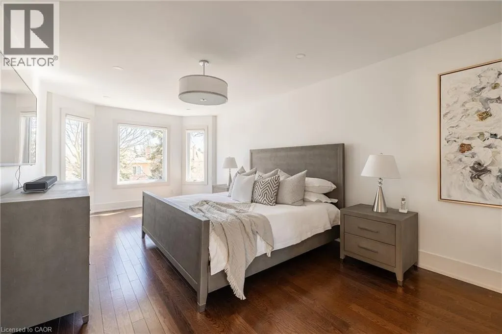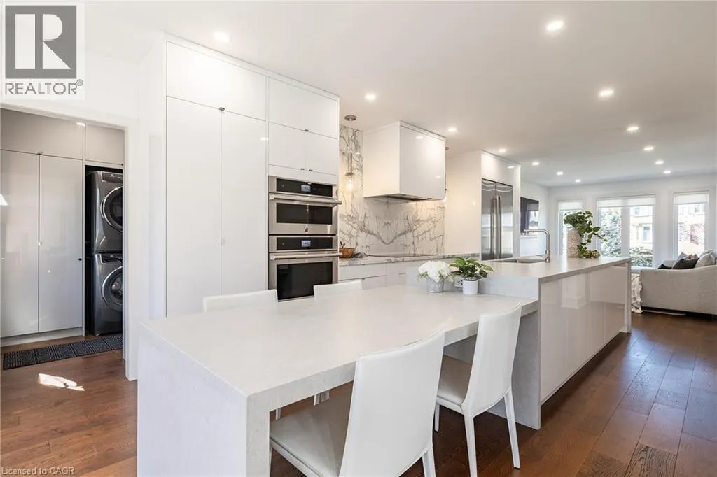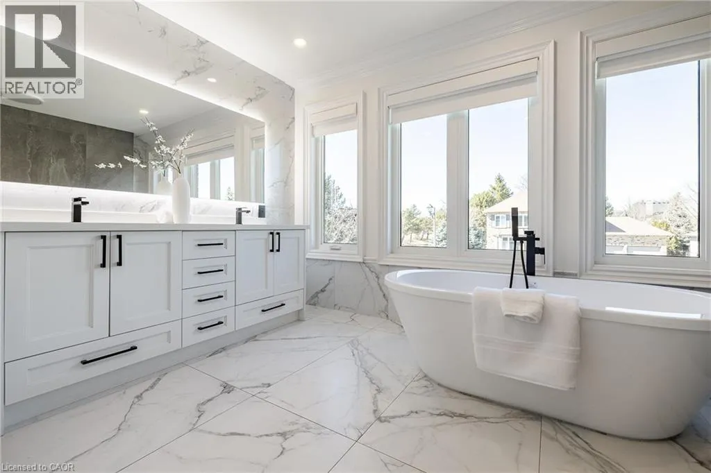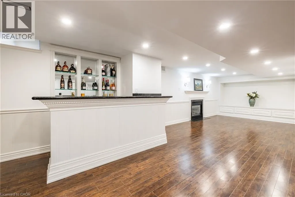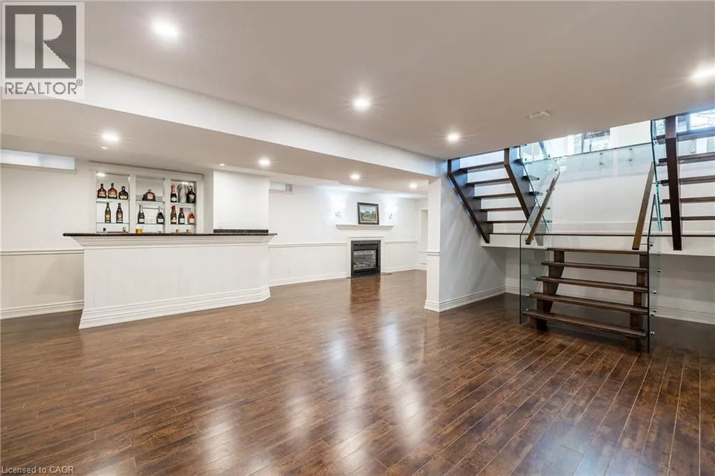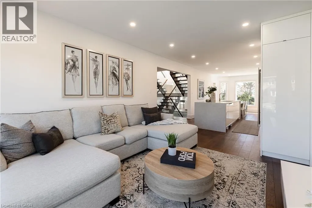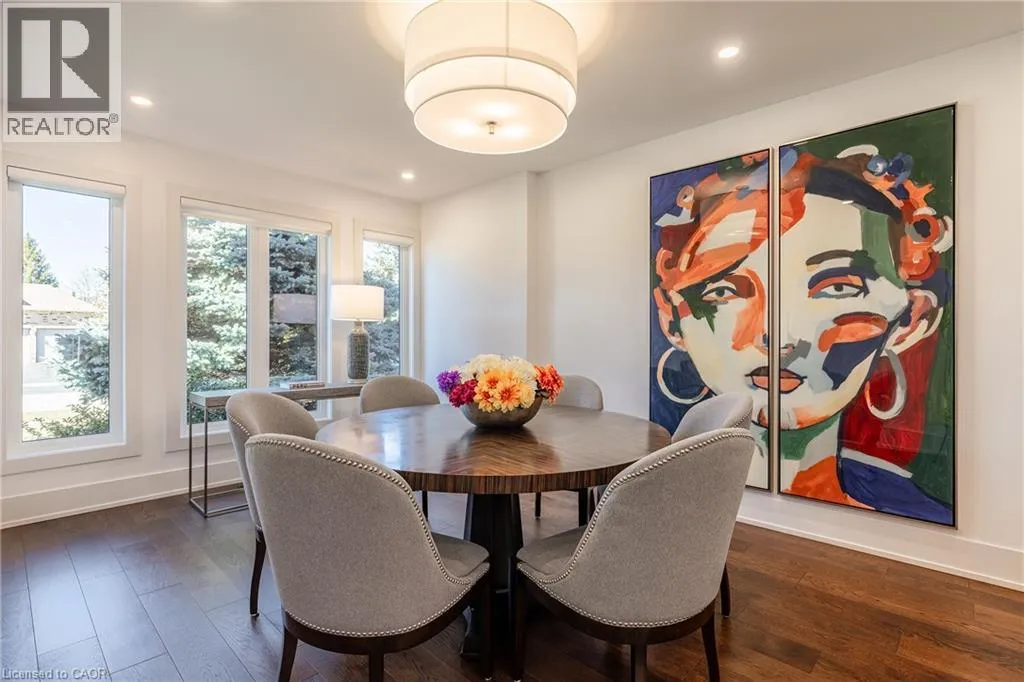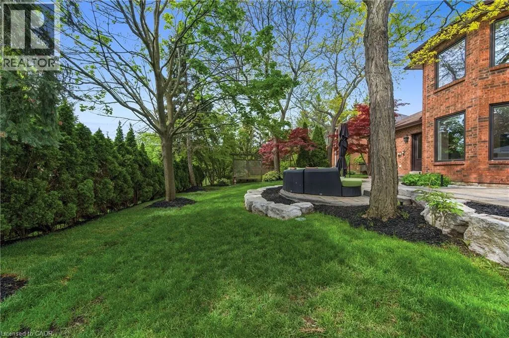 Fairway Hills/The Links Drive Refined traditional family home in the coveted Fairway Hills community in Glen Abbey. Surrounded by natural landscapes + adjacent to the world-renowned Glen Abbey golf course. This executive residence epitomizes modern elegance + refined comfort, offering a sophisticated lifestyle. Renovated w/a refined modern interior w/clean lines, expansive glazing + upscale finishes. Clever layout meets the needs of the modern buyer where principal living areas are connected, but sufficiently defined to provide privacy when desired. Statement feature wall with a contemporary open fireplace separates the dining room + living room & an open den provides a breezeway to the kitchen. Optimizing form + function the custom kitchen will appease the chef in the family with ample prep + cook space, top appliances, generous storage + an integrated table to enjoy meals together. The adjacent mudroom + laundry keep you organized. The main stairs are an architectural gem w/open risers + glass rails + partitions, creating a focal point while also allowing the natural light to flow through. Primary retreat w/double entry doors, expansive sleeping quarters, dressing room + extra closet + a lavish ensuite. The additional 3 bedrooms are generously sized + share the luxurious main bath. Finished lower expands the living space, featuring a cozy family lounge, a wet bar with connected games space and a bonus area that could function as a 5th bedroom + office with ensuite bath. Family sized with 4+1 beds & 3.5 baths. Rear yard expertly landscaped w/multiple stone lounges to accommodate family get-togethers + social events & beautiful framing gardens w/mixed tree canopy provided ample privacy. Offering tremendous curb appeal in a coveted Glen Abbey pocket, this upscale family home is an ideal choice. (id:27476)