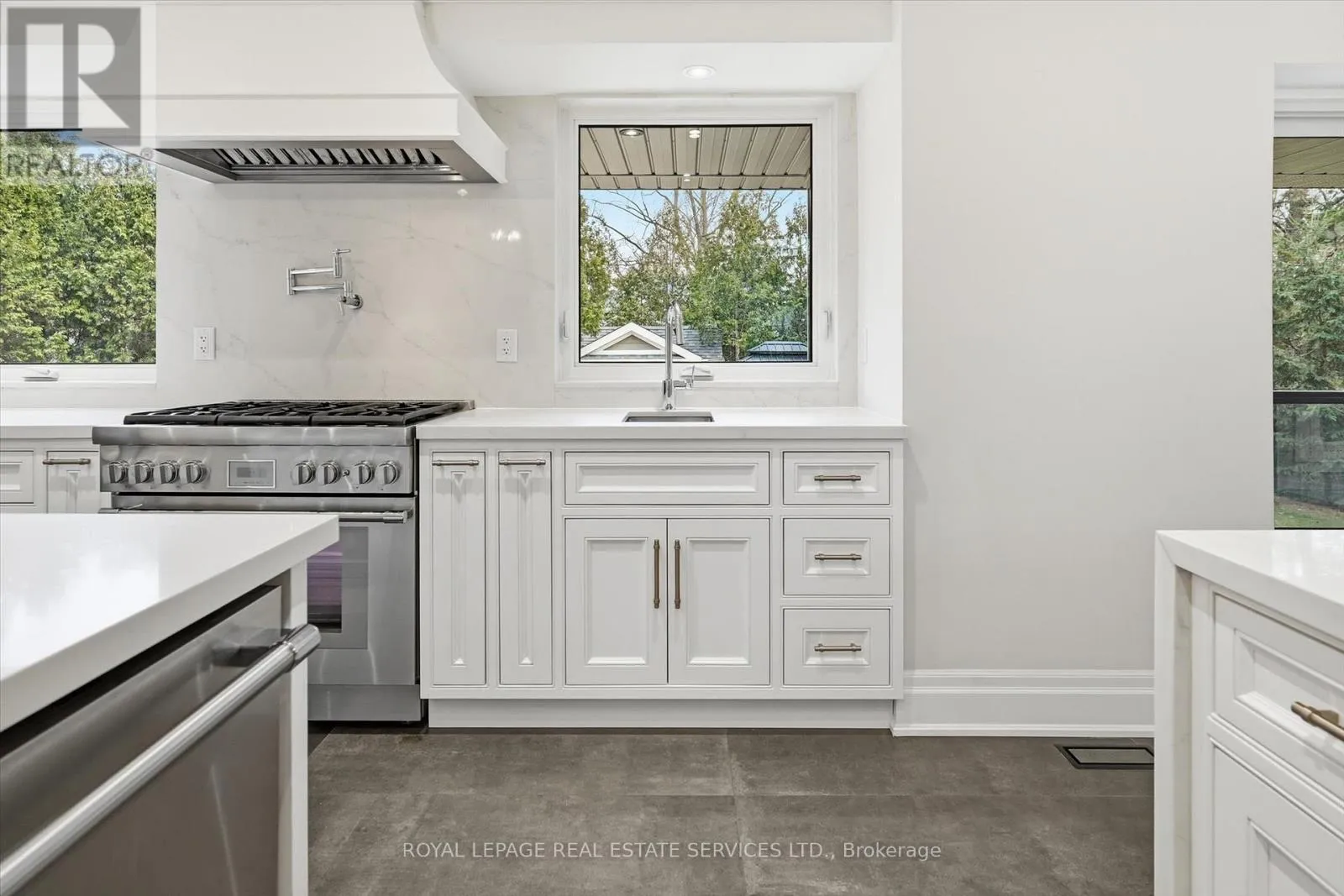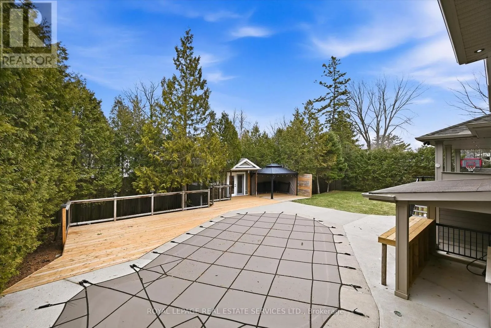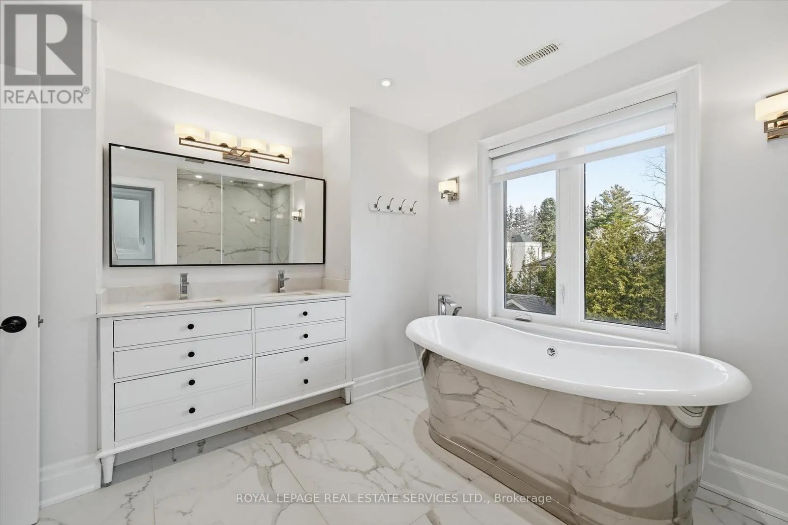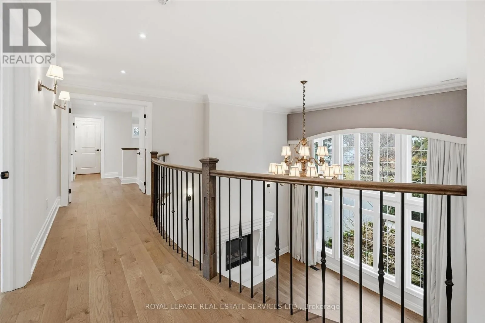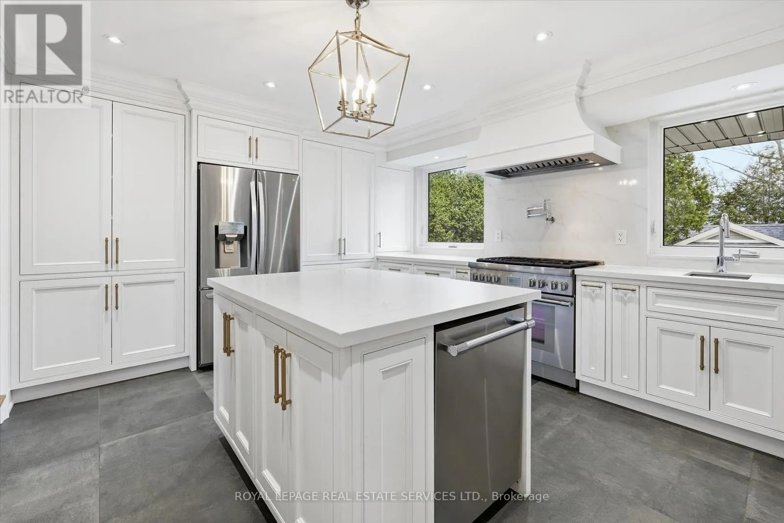 Cross Streets: Lakeshore Road West AND Third Line. ** Directions: Lakeshore Road West / north on Third Line / Venetia Drive. Situated in the prestigious Coronation Park enclave of South-West Oakville, this reimagined custom residence offers over 4,500 square feet of finished living space on a premium 90' x 125' mature lot. Designed for modern family living, the home features 6 bedrooms and 4.5 bathrooms with refined finishes and a highly functional layout. A grand double-height living room with 17' ceiling and architectural windows anchors the main level, complete with a gas fireplace and automated drapery. The chef-inspired kitchen features peninsula seating, a farmhouse sink, separate prep island, quartz surfaces, a 36" Thermador gas range with pot filler, integrated hood, prep sink, and Thermador dishwasher, opening to the dining area with walkout to a composite deck with glass railing. The second level includes two spacious bedrooms, one with a four-piece ensuite, powder room, and a versatile vaulted lounge. The third level is dedicated to a private primary retreat with dual walk-in closets, including a laundry rough-in, and a spa-inspired five-piece ensuite with freestanding tub, oversized glass shower, and heated floor. Two additional bedrooms and a five-piece bath complete this level. The finished lower level offers a media room with built-in shelving and AV rough-in, along with a sixth bedroom or office. A recreation area with walkout, dedicated gym, full bath, laundry, and built-in storage with direct garage access can be found on the basement level. Additional highlights include engineered hardwood flooring throughout, dual HVAC systems, Ecobee thermostats, soffit lighting, a five-car driveway, and a backyard with saltwater pool, outdoor wet bar, pergola, and multiple seating areas. Walking distance to Coronation Park, the lakefront, and top-ranked schools. (certain images have been digitally enhanced and virtually staged) (id:27476)