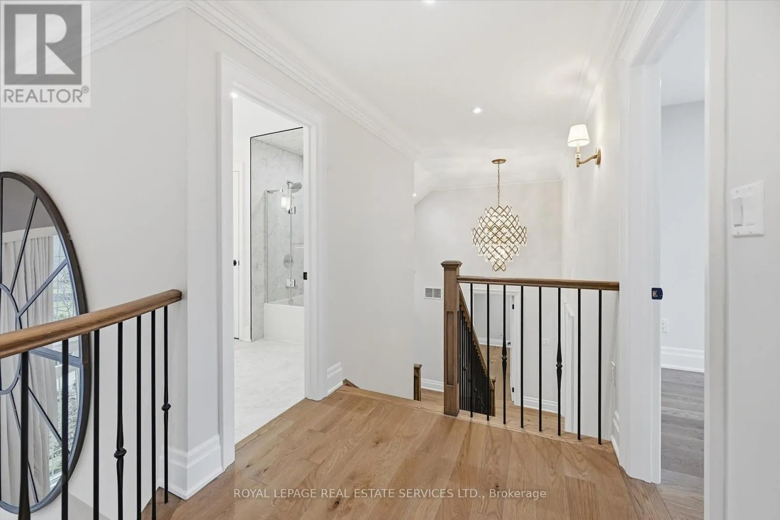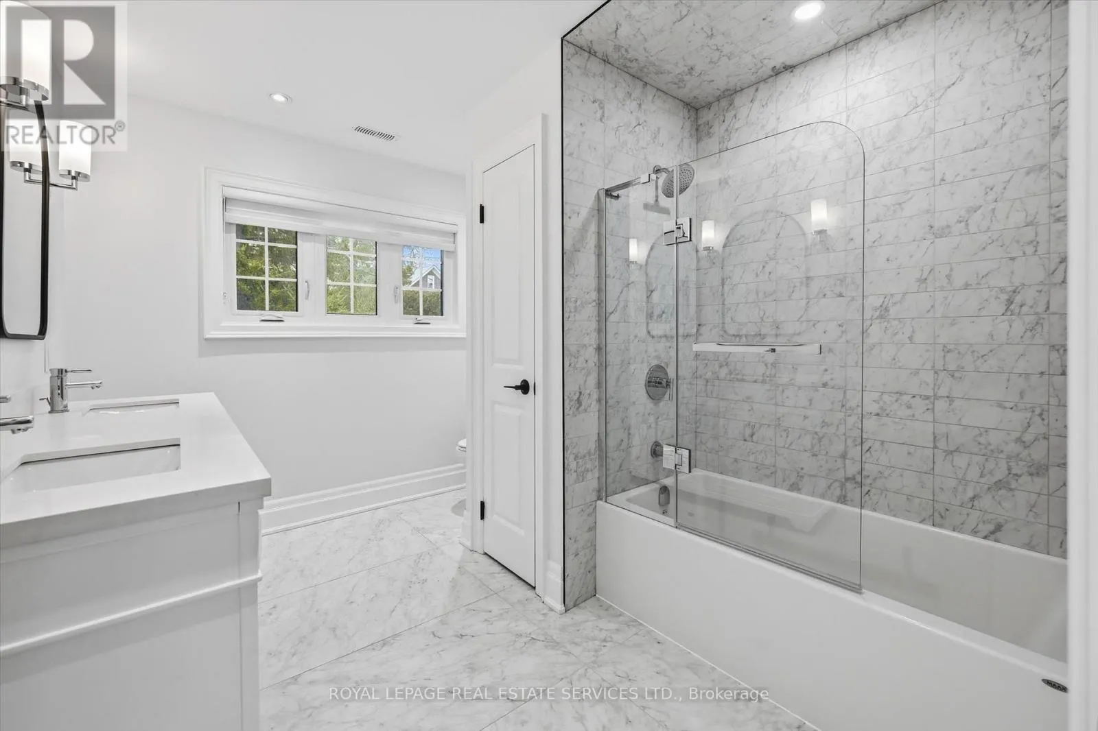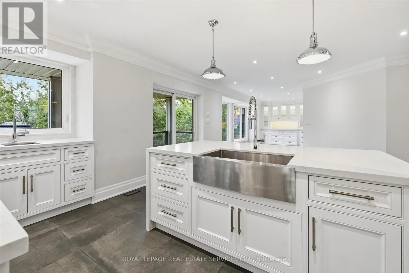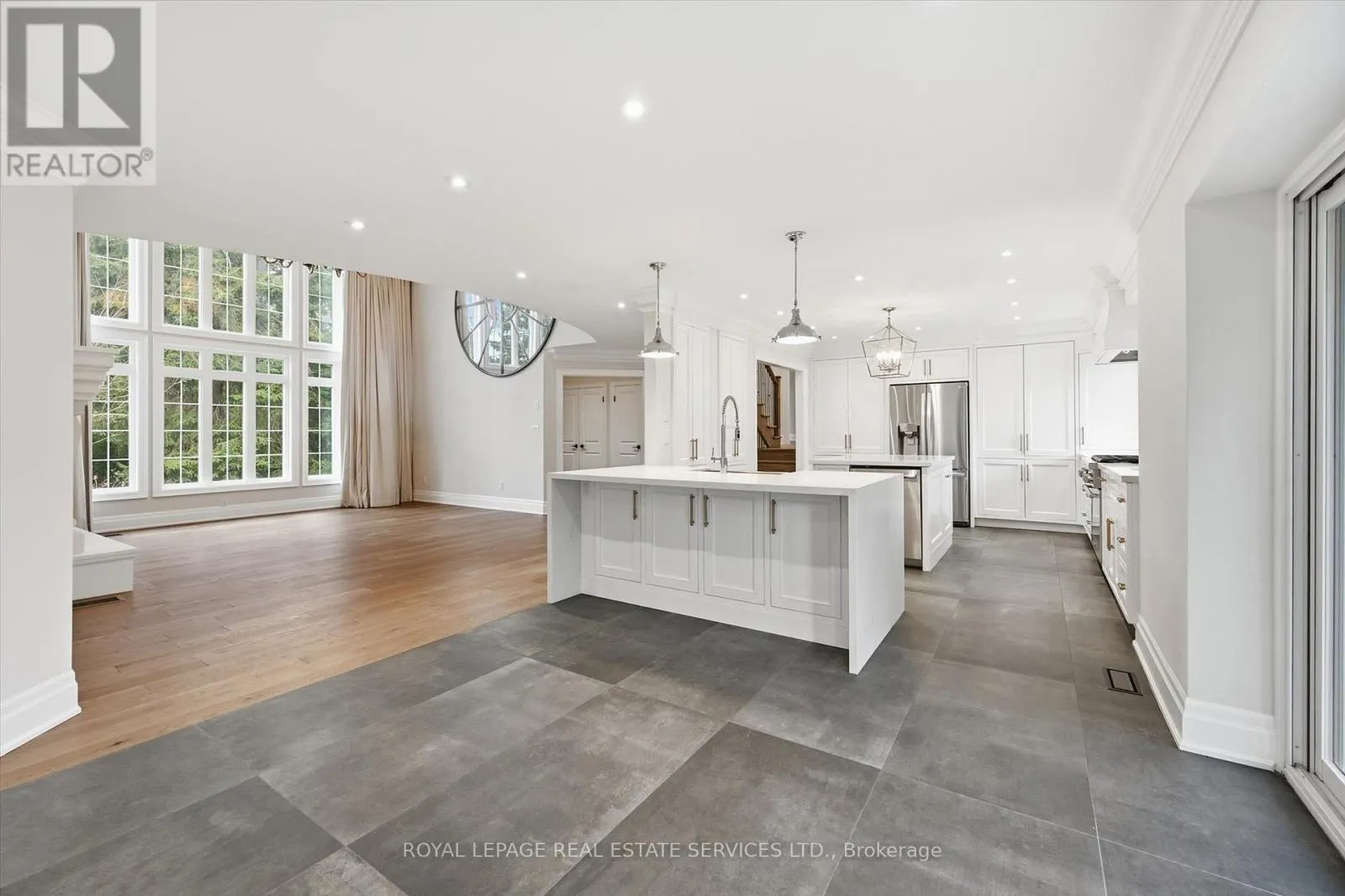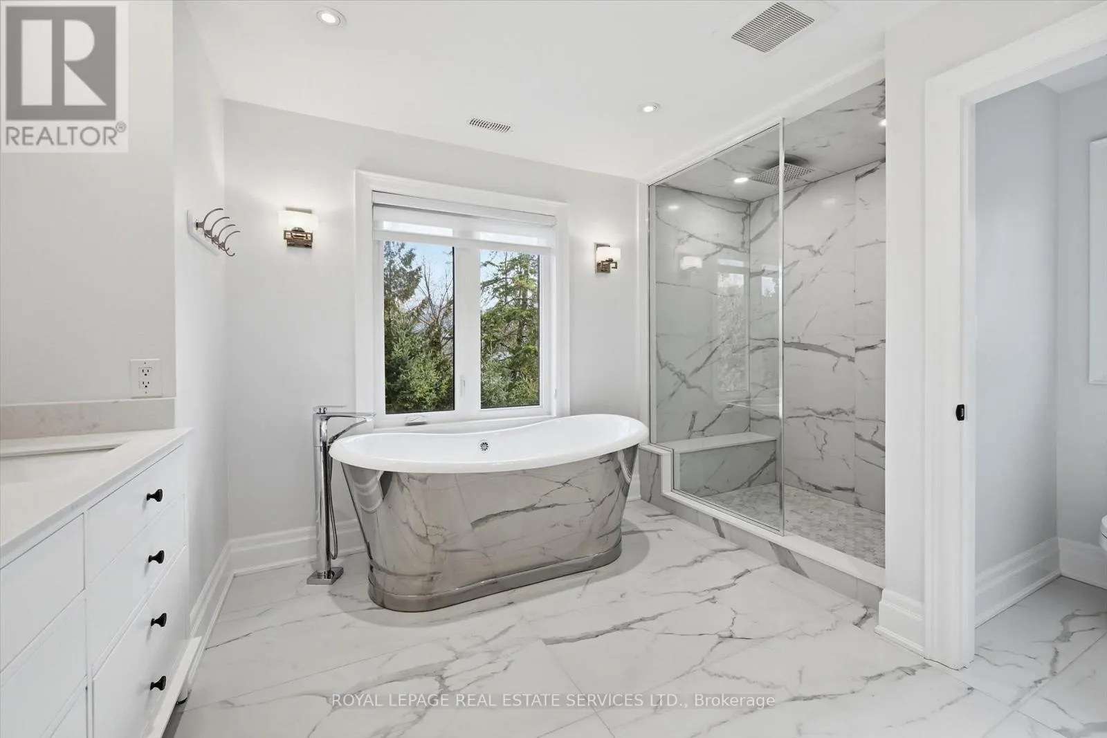Cross Streets: Lakeshore Road West AND Third Line. ** Directions: Lakeshore Road West / north on Third Line / Venetia Drive. Situated in the prestigious Coronation Park enclave of South-West Oakville, this reimagined custom residence offers over 4,500 square feet of finished living space on a premium 90' x 125' mature lot. Designed for modern family living, the home features 6 bedrooms and 4.5 bathrooms with refined finishes and a highly functional layout. A grand double-height living room with 17' ceiling and architectural windows anchors the main level, complete with a gas fireplace and automated drapery. The chef-inspired kitchen features peninsula seating, a farmhouse sink, separate prep island, quartz surfaces, a 36" Thermador gas range with pot filler, integrated hood, prep sink, and Thermador dishwasher, opening to the dining area with walkout to a composite deck with glass railing. The second level includes two spacious bedrooms, one with a four-piece ensuite, powder room, and a versatile vaulted lounge. The third level is dedicated to a private primary retreat with dual walk-in closets, including a laundry rough-in, and a spa-inspired five-piece ensuite with freestanding tub, oversized glass shower, and heated floor. Two additional bedrooms and a five-piece bath complete this level. The finished lower level offers a media room with built-in shelving and AV rough-in, along with a sixth bedroom or office. A recreation area with walkout, dedicated gym, full bath, laundry, and built-in storage with direct garage access can be found on the basement level. Additional highlights include engineered hardwood flooring throughout, dual HVAC systems, Ecobee thermostats, soffit lighting, a five-car driveway, and a backyard with saltwater pool, outdoor wet bar, pergola, and multiple seating areas. Walking distance to Coronation Park, the lakefront, and top-ranked schools. (certain images have been digitally enhanced and virtually staged) (id:27476)